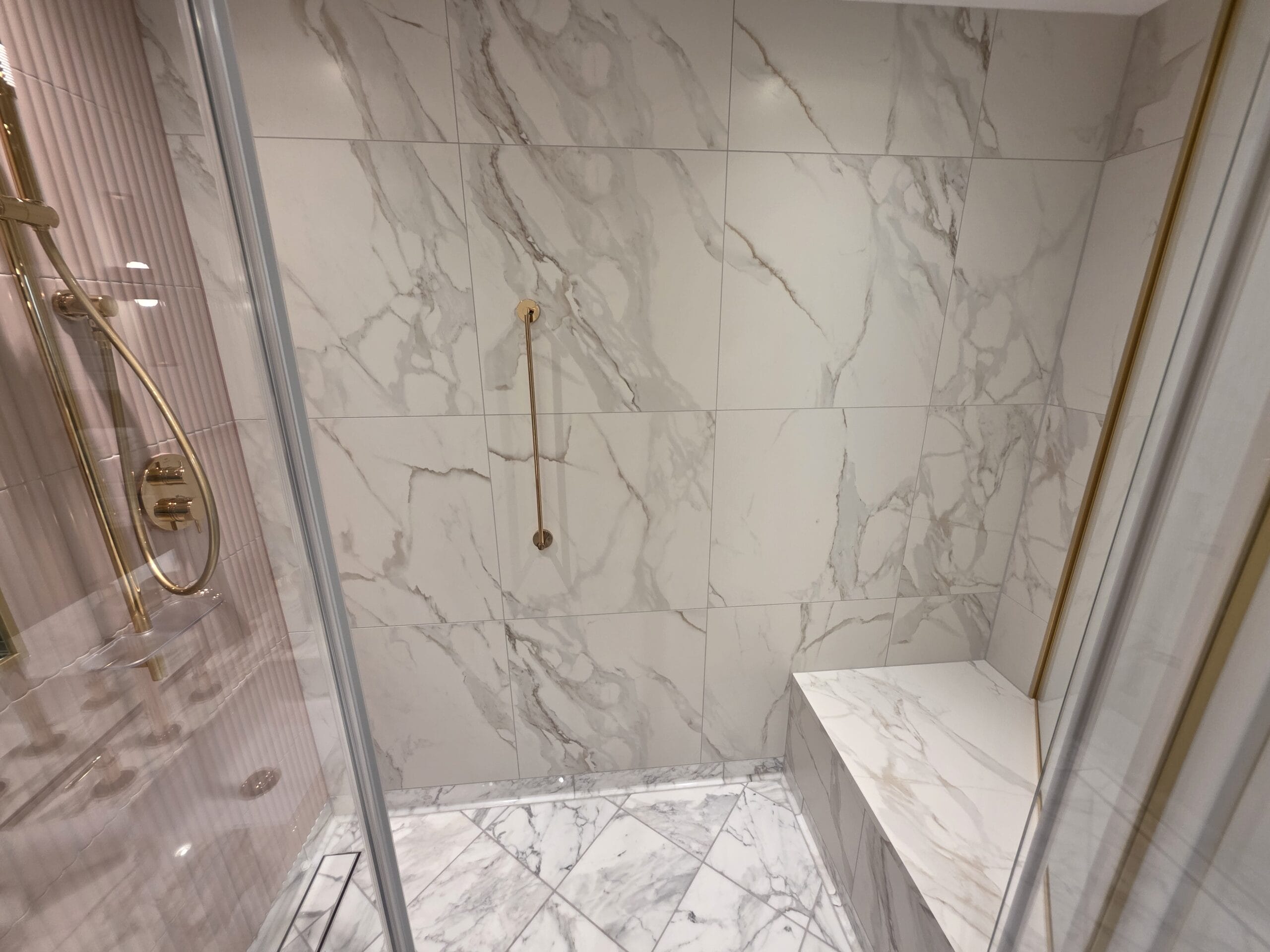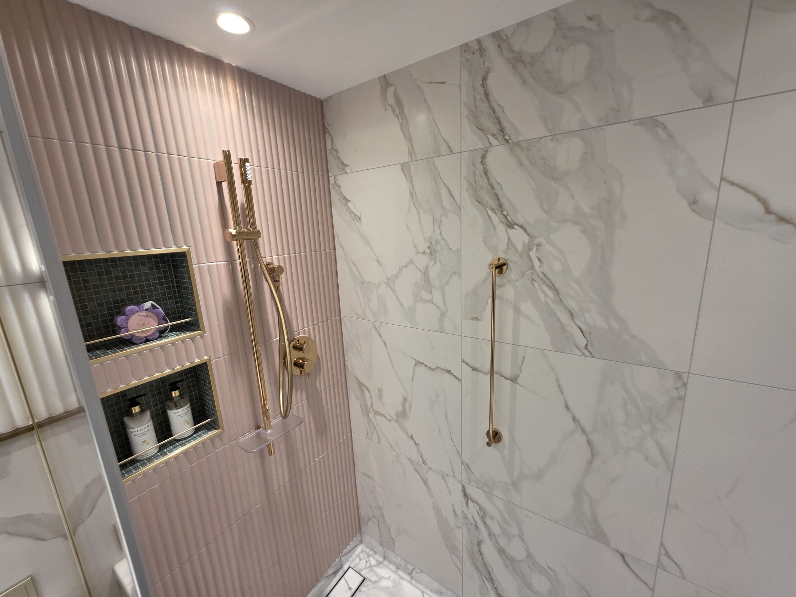 The walk-in shower has marbled tile and blush pink tile. There is a seat and support handles.