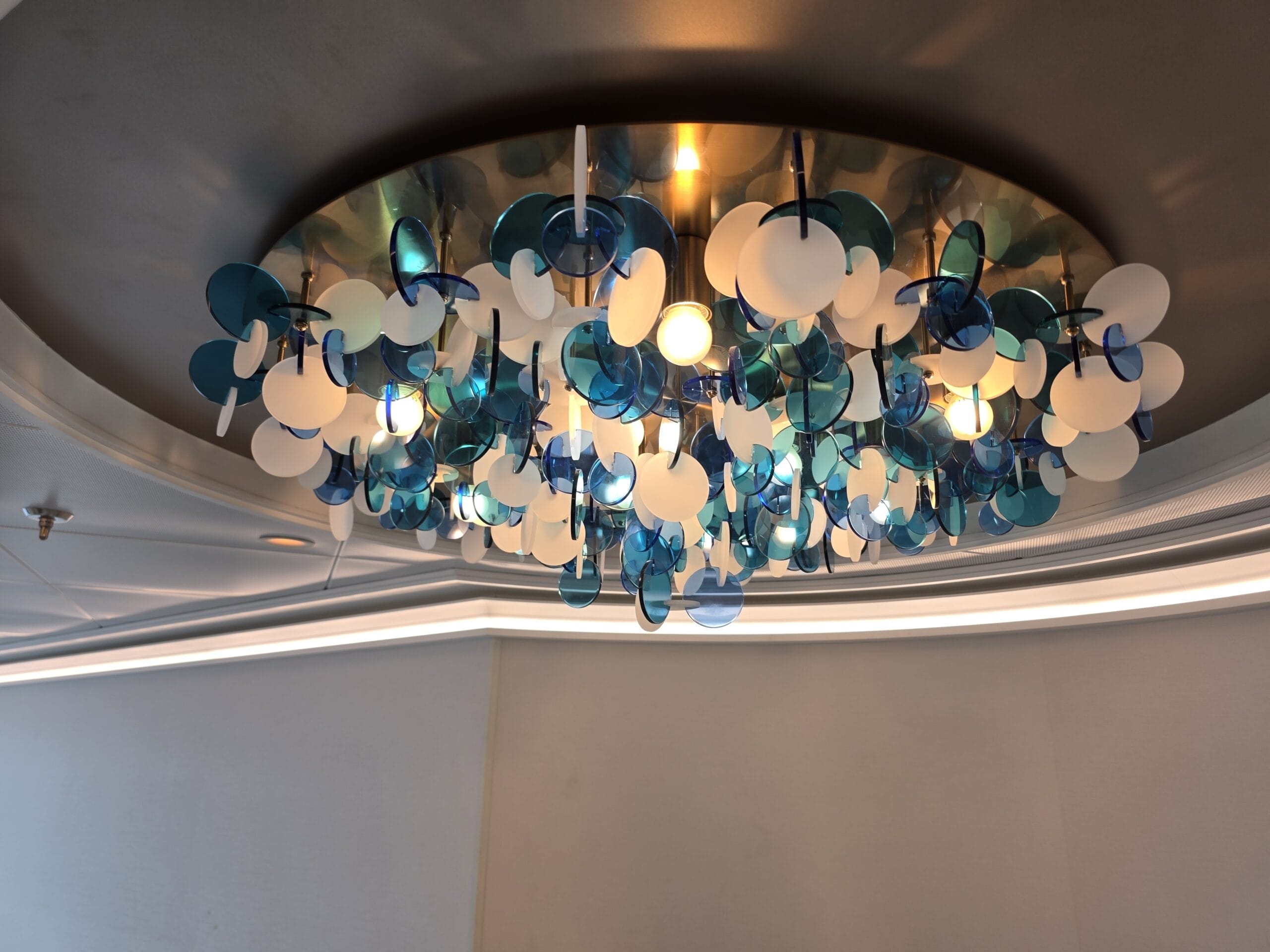 There is a blue and white chandelier that hangs from the ceiling at the top of the staircase.