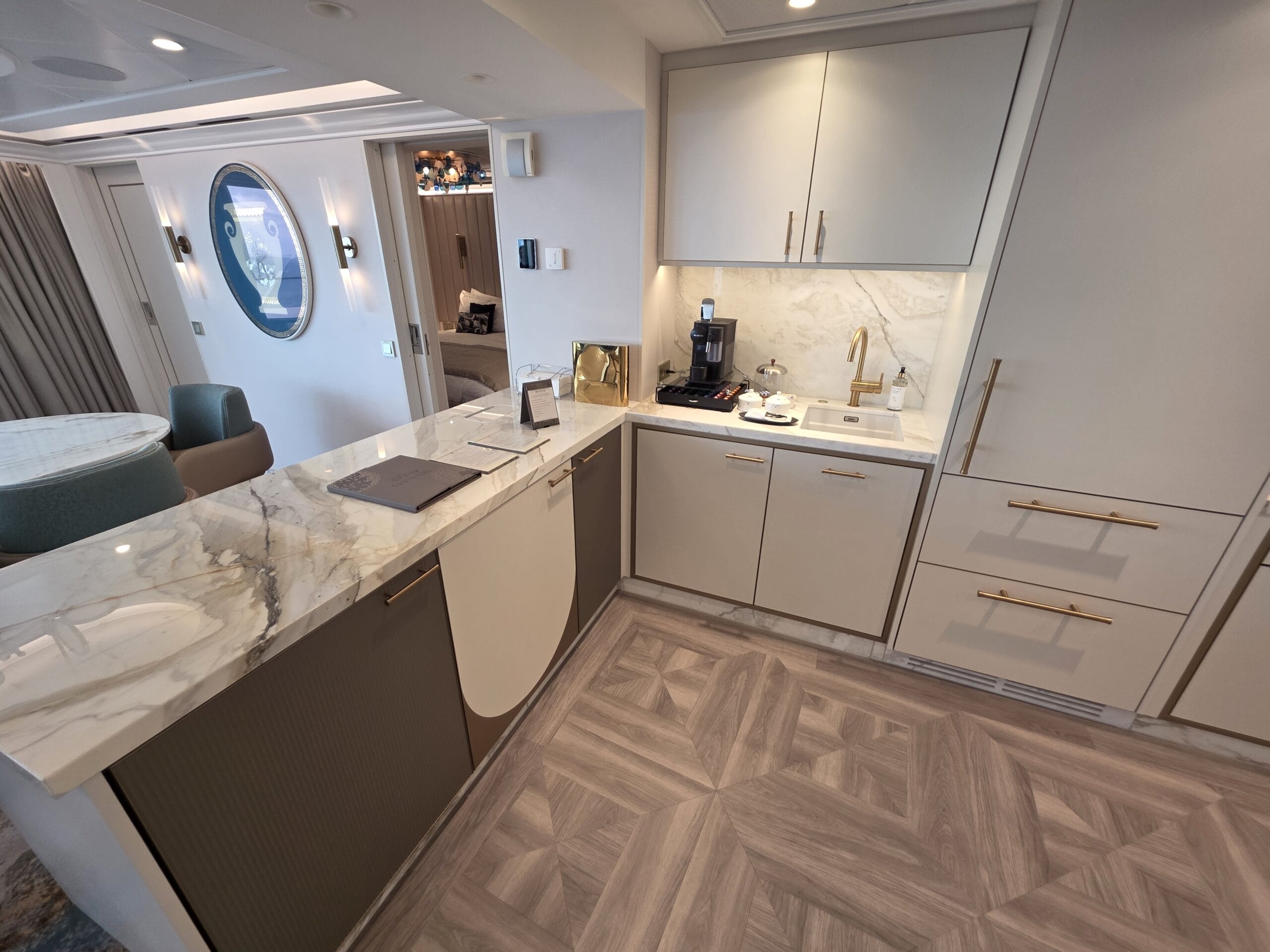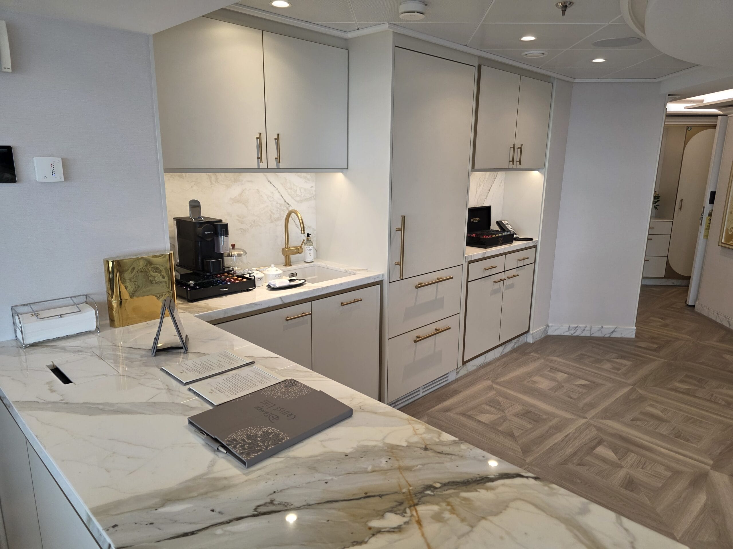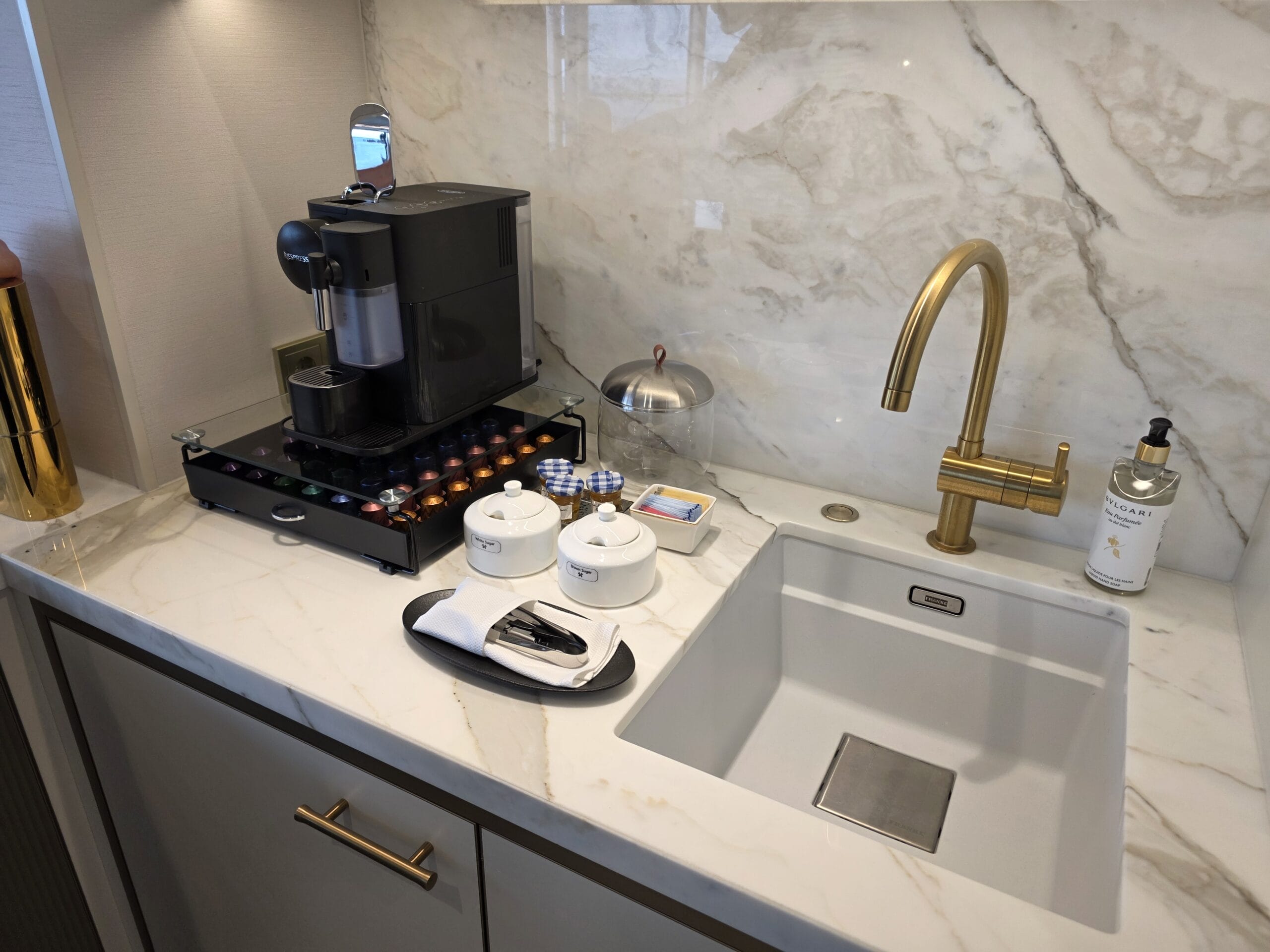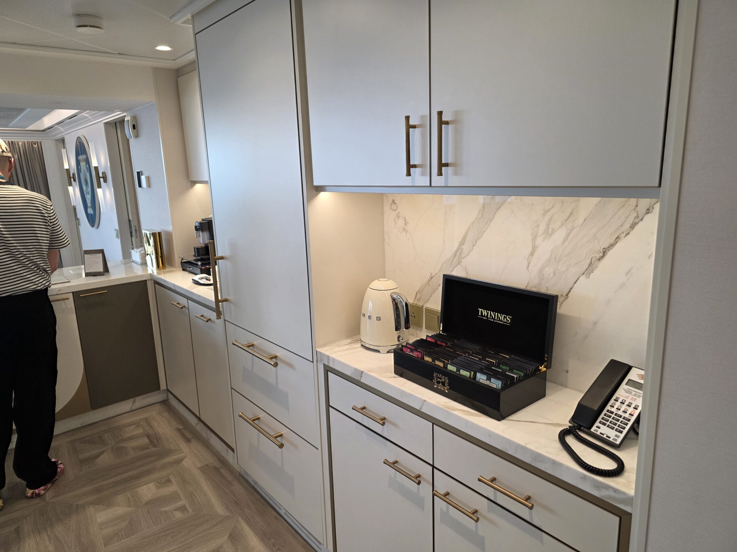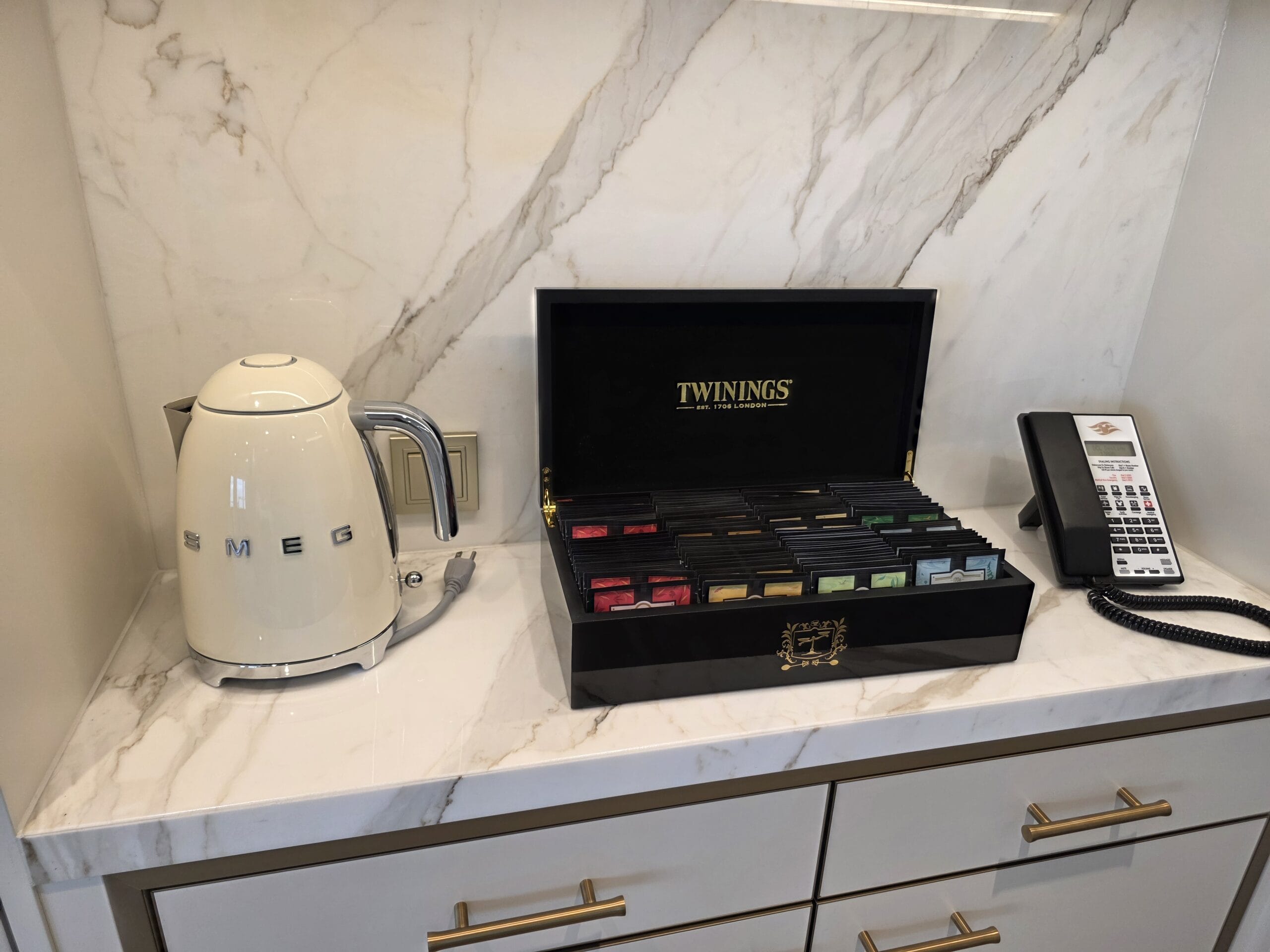 Two smaller cubby areas in the kitchenette include a sink and coffee maker, plus a tea area.