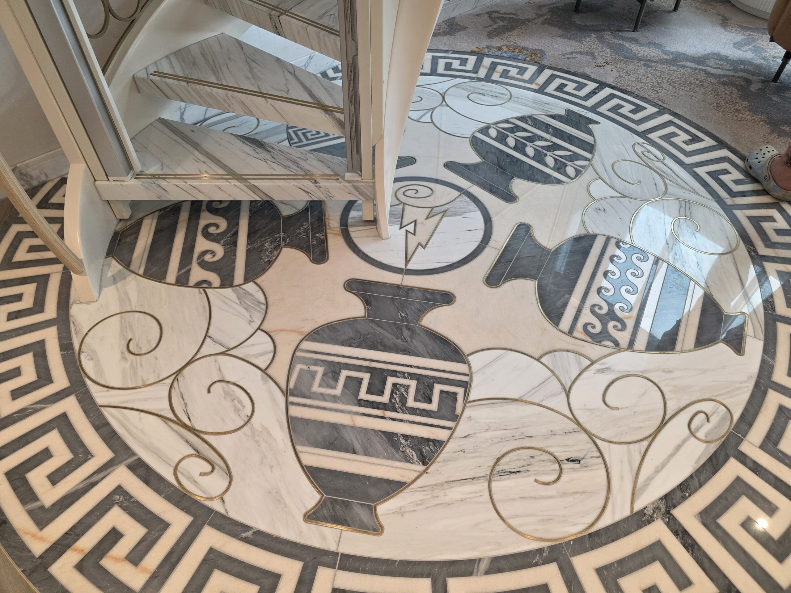 The marble floor beneath the staircase is white and gray marble with pieces of pottery surrounding a lightning bolt.