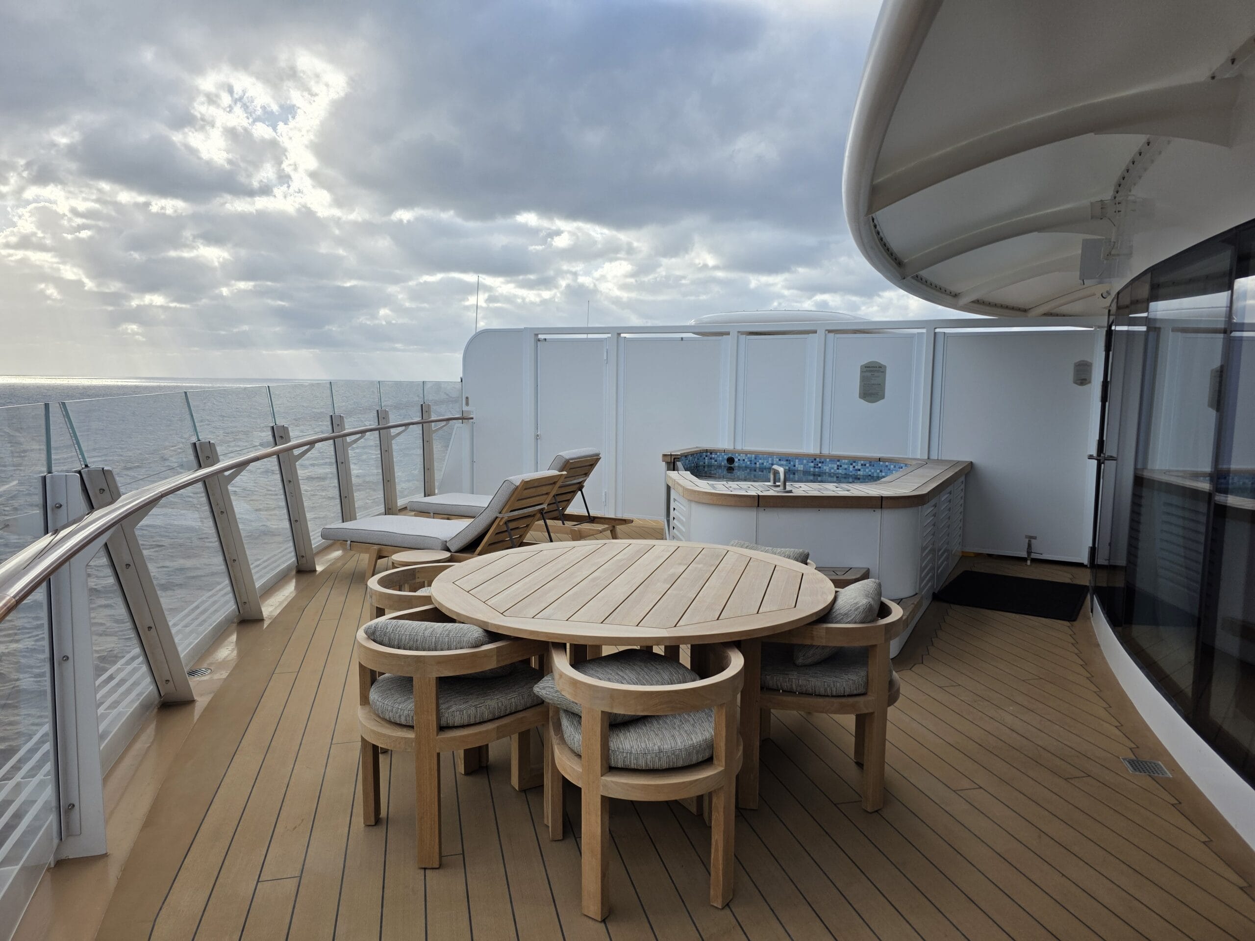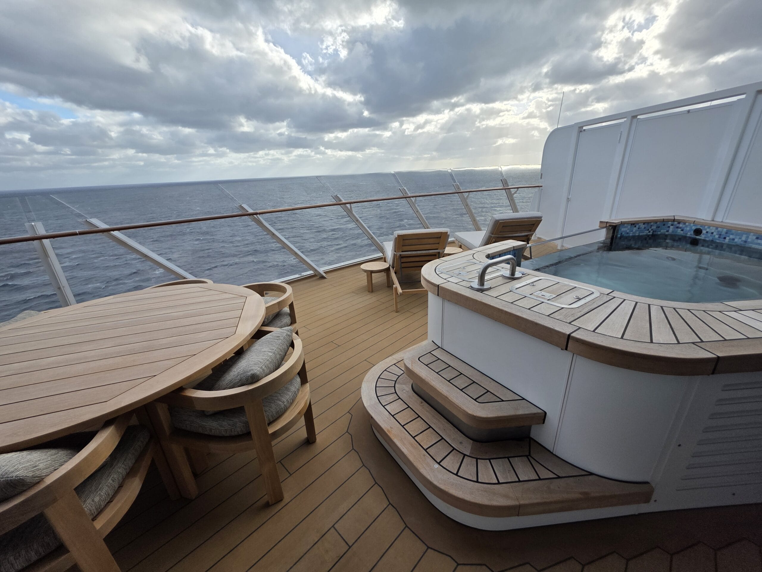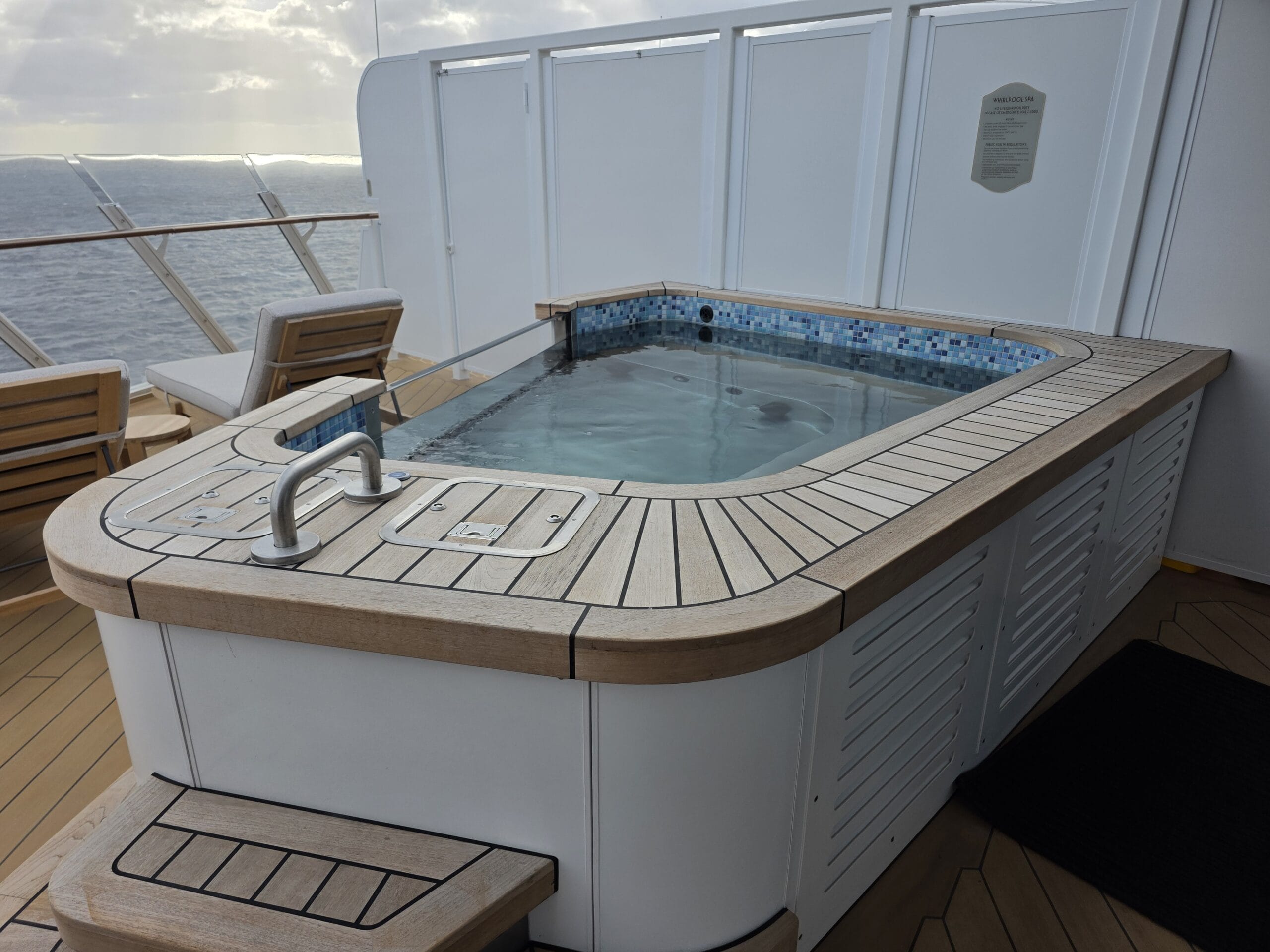 The private whirlpool spa has a step and support handle to safely climb in. White walls block this space from the rest of the ship.