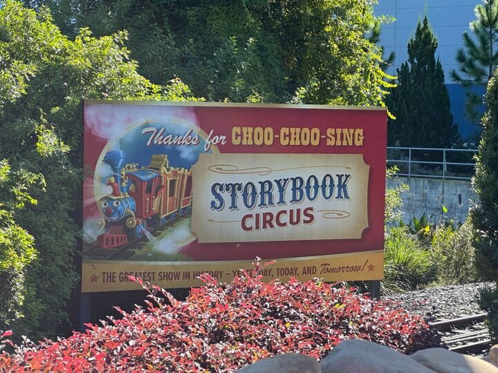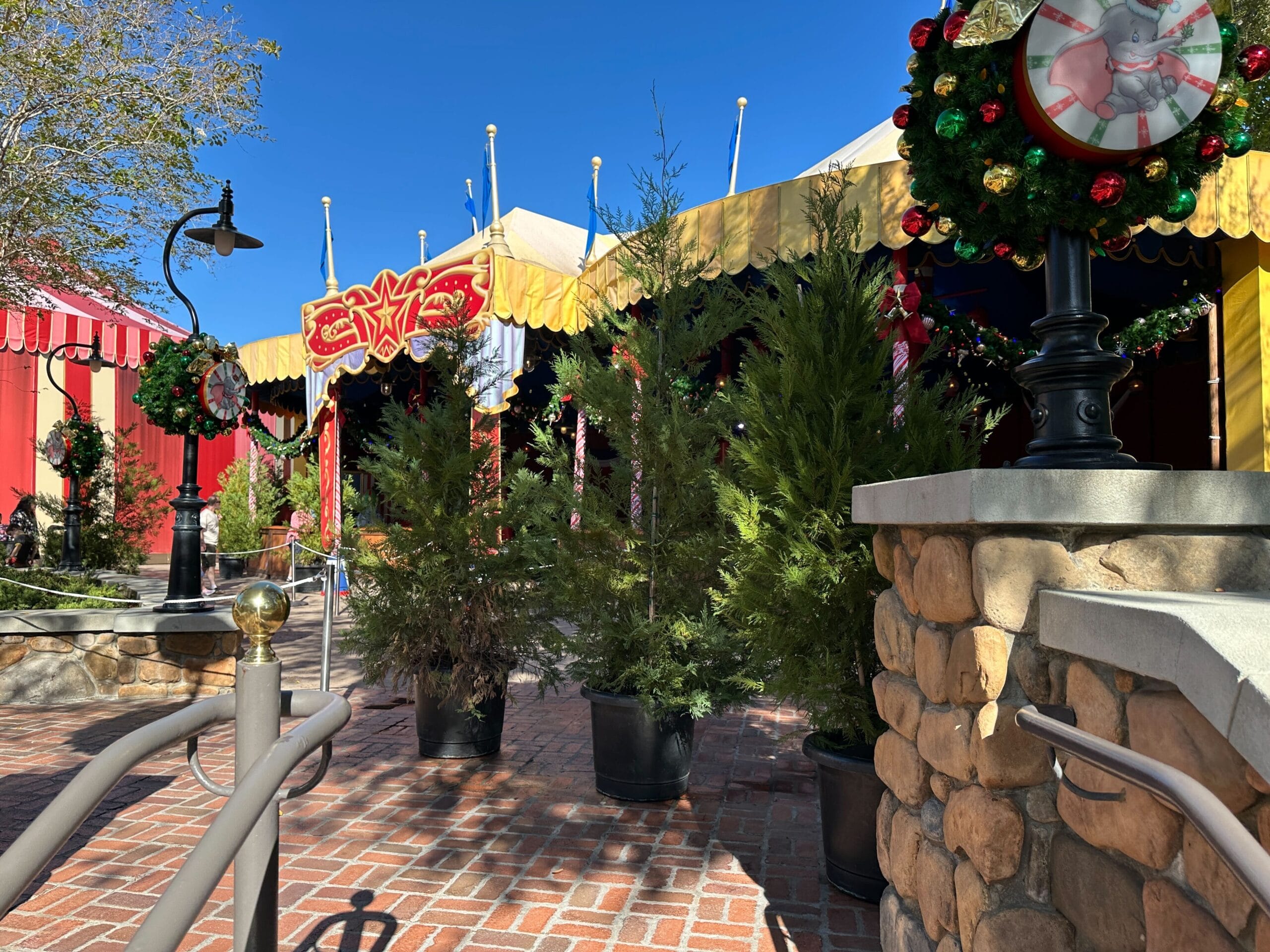 Outside the tent, trees line the entrance way to the switchbacks for the meet-and-greet. You’ll also find the wreaths are decorated in the new Dumbo decorations that are scattered around Storybook Circus for the holiday season.