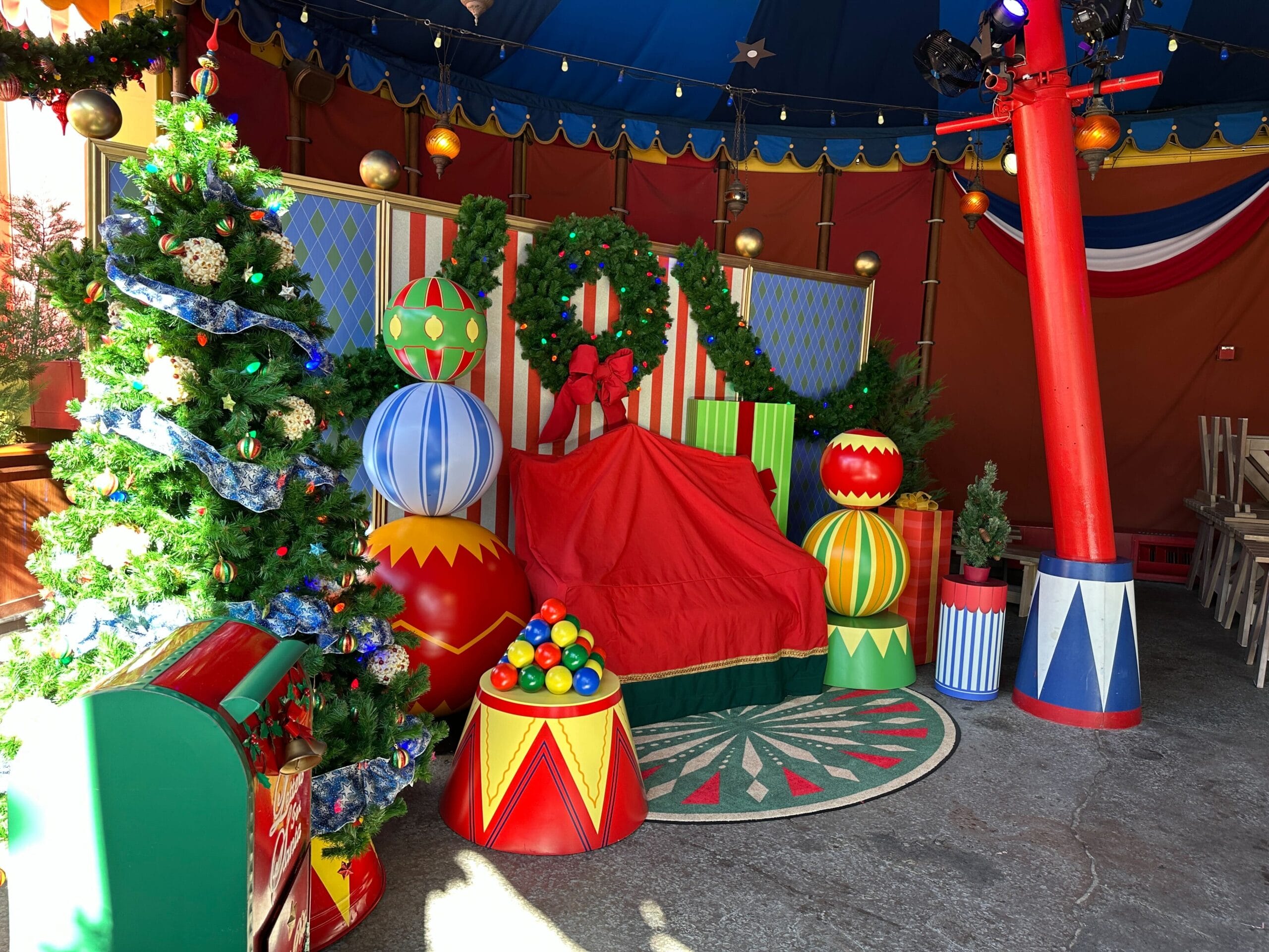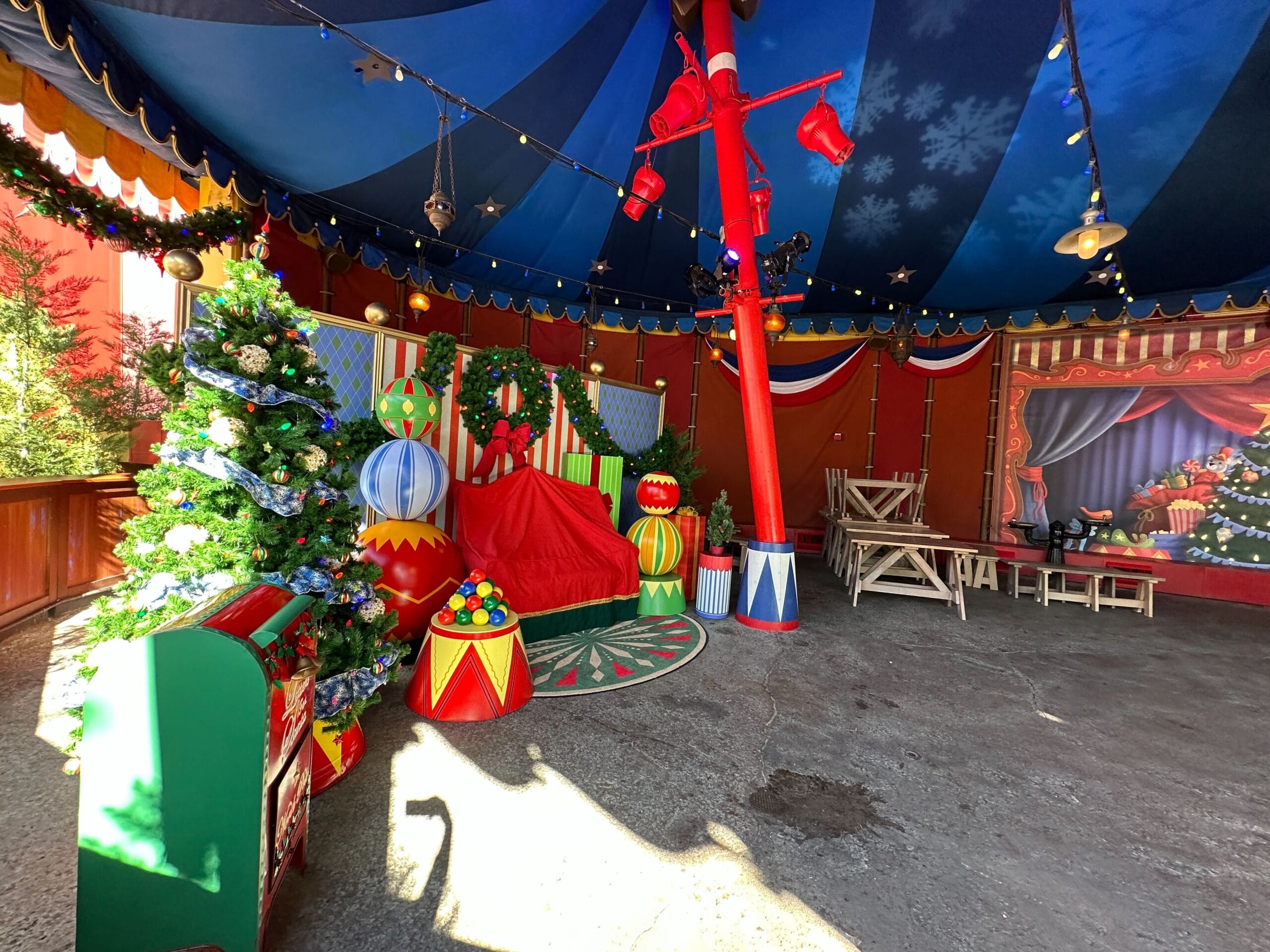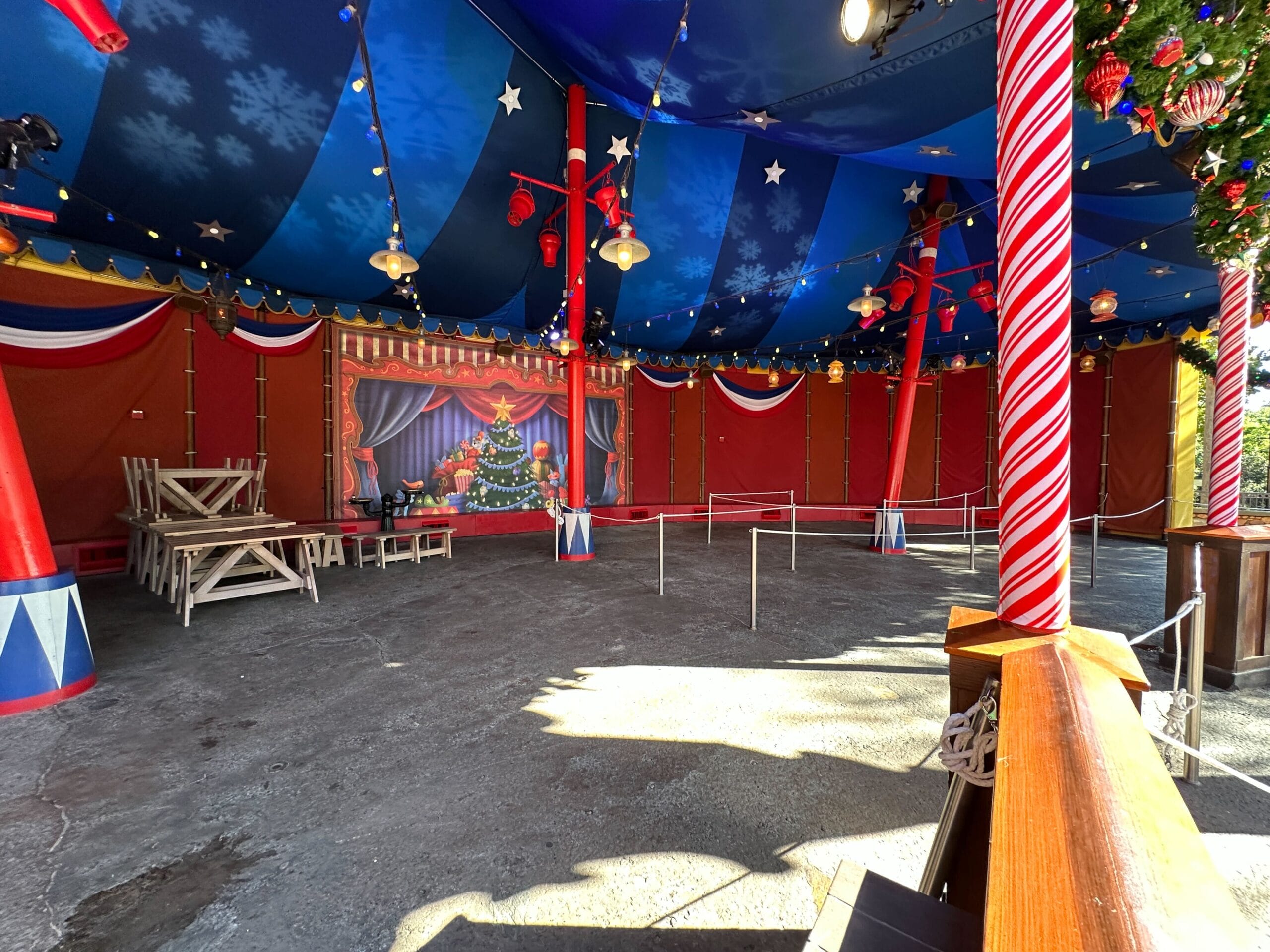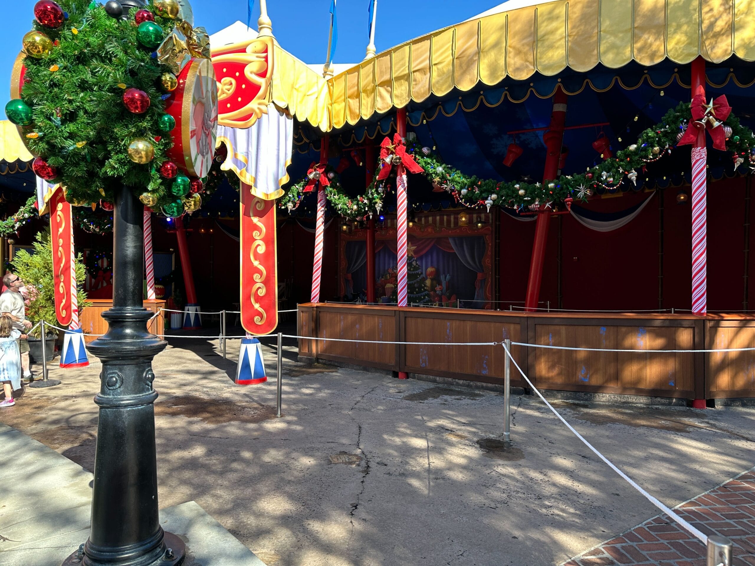 At the circus tent, in the back of the land between the train station and Pete’s Silly Sideshow, decorations have gone up in preparation for Santa’s Christmas Carnival, a meet-and-greet available during Mickey’s Very Merry Christmas Party.