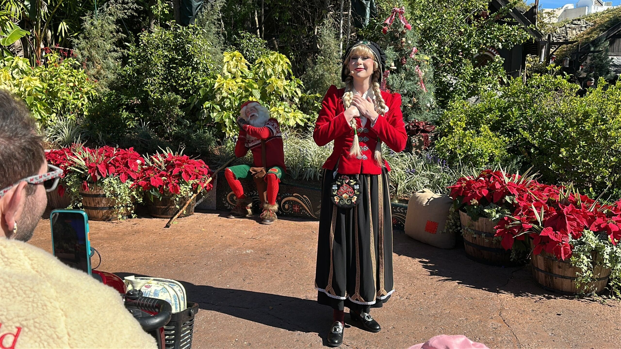 This year, the Norway Holiday Storytellers are performing in a different space due to construction where their stage usually is. They are nearby, outside Anna and Elsa’s Royal Sommerhus.