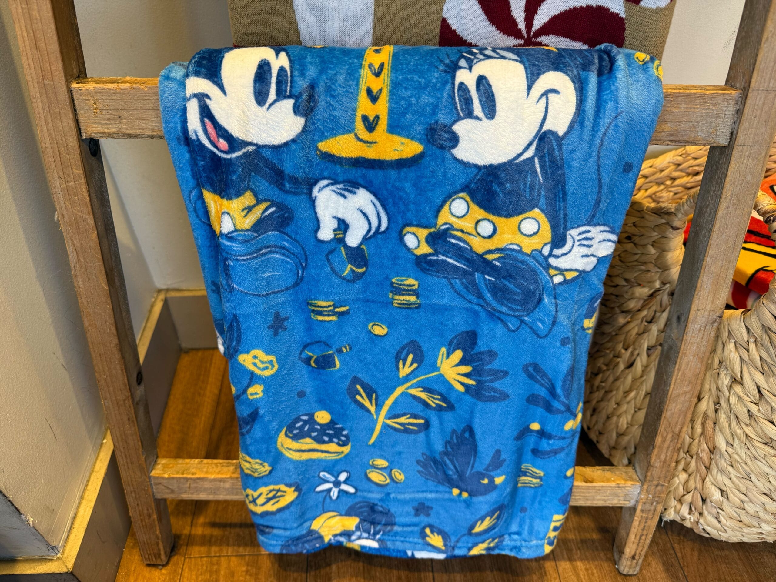 Mickey and Minnie play dreidel in a cheerful scene filled with leaves, birds, gifts and menorahs on this joyful throw.