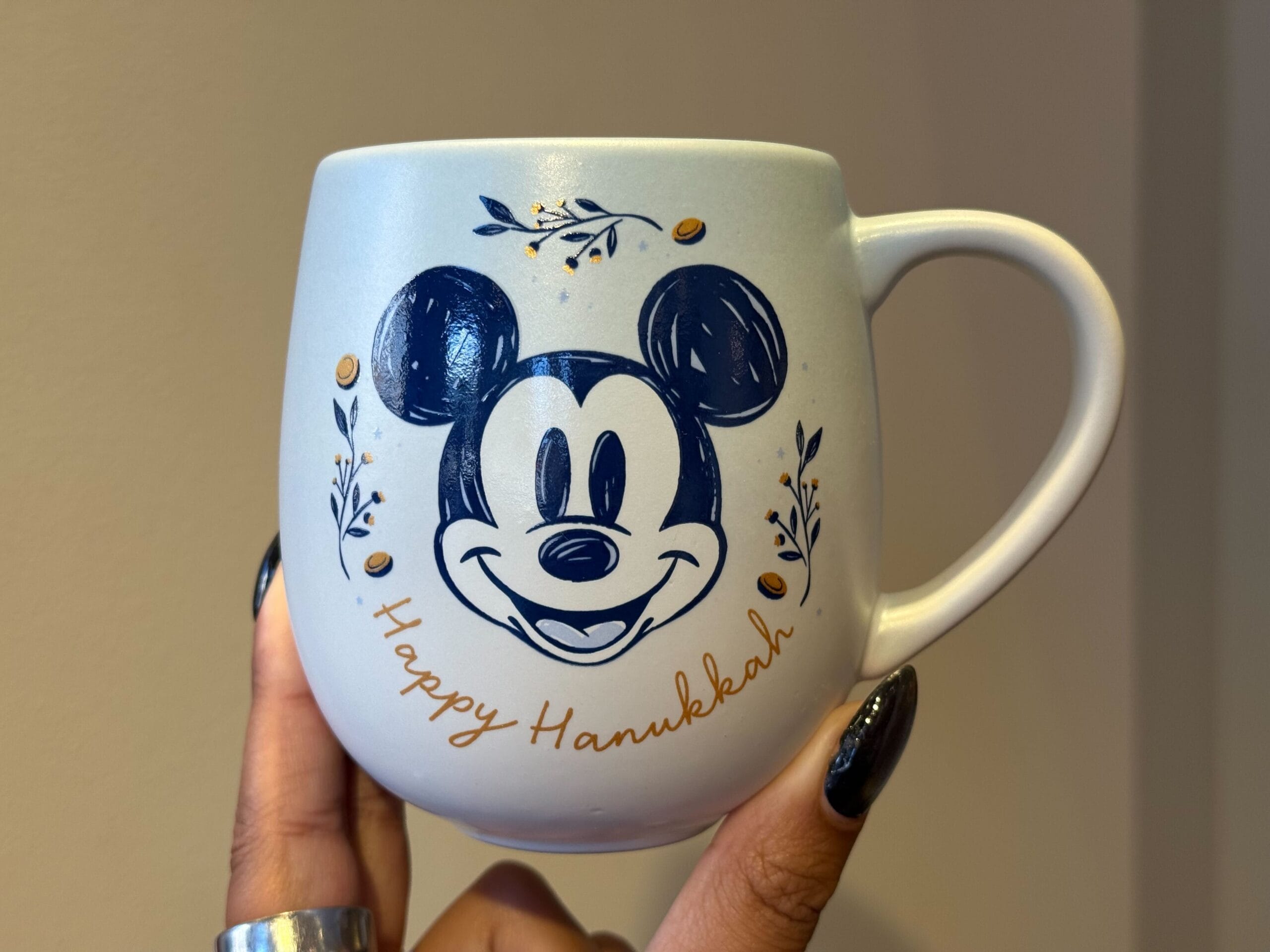 The white Hanukkah ceramic mug wishes everyone a ‘‘Happy Hanukkah” and a sketch-style image of Mickey Mouse’s face on one side. The reverse side features a lit menorah with spinning dreidels and the slogans ”love, light & eight nights” and ”Happy Hanukkah.” It has a satin glaze with blue and yellow details and text. The interior is blue.