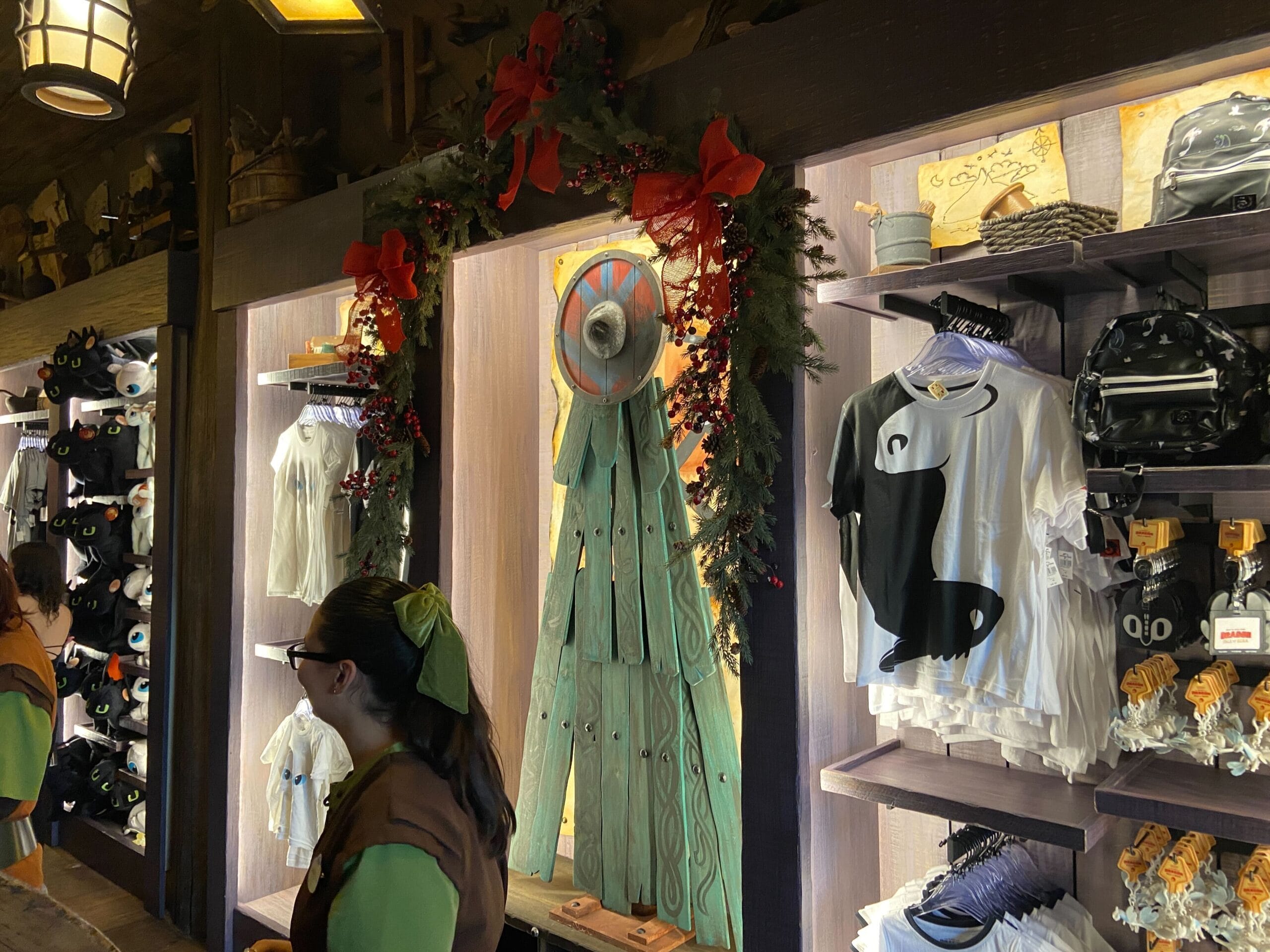 Another Snoggletog tree made of green planks and a shield is behind the checkout counter in Hiccup’s Work Shop. This one isn’t decorated with ornaments.