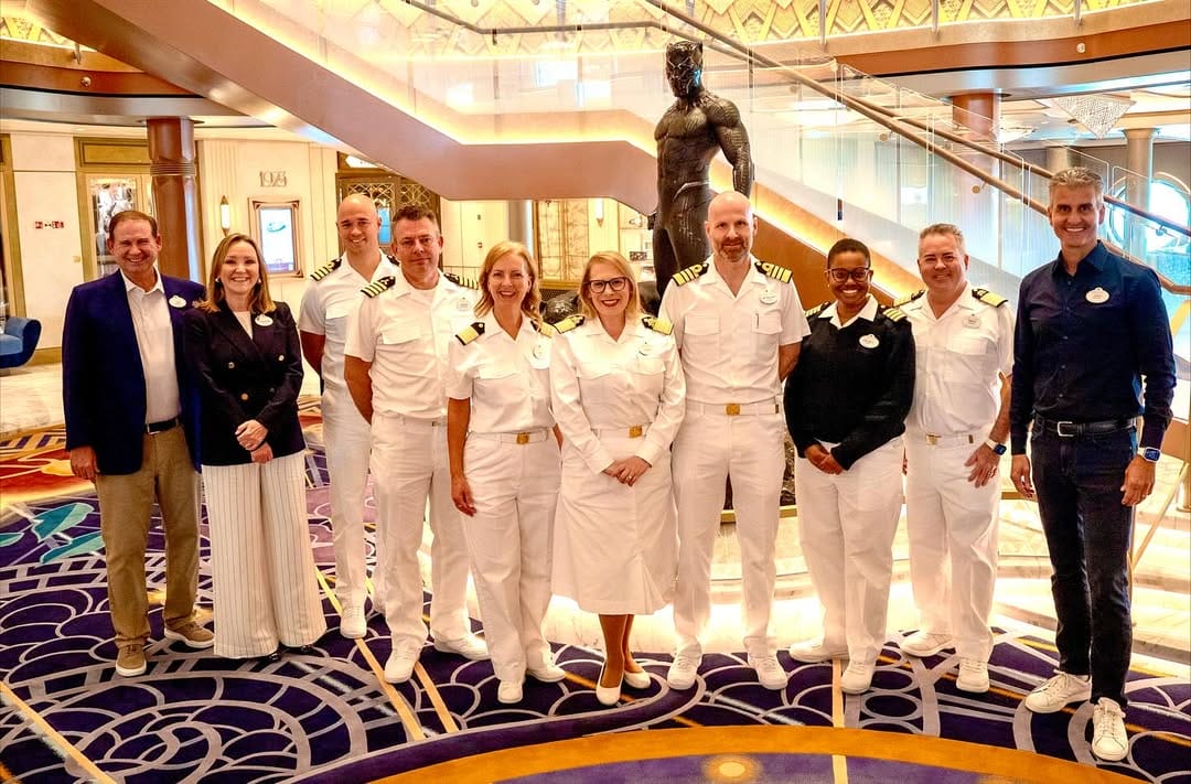 In this photo with the ship’s captain and officers, we also get our first look at the installed T’Challa atrium statue, after getting a glimpse of it being unwrapped courtesy of the Imagineers working during the Destiny’s two-week crossing.