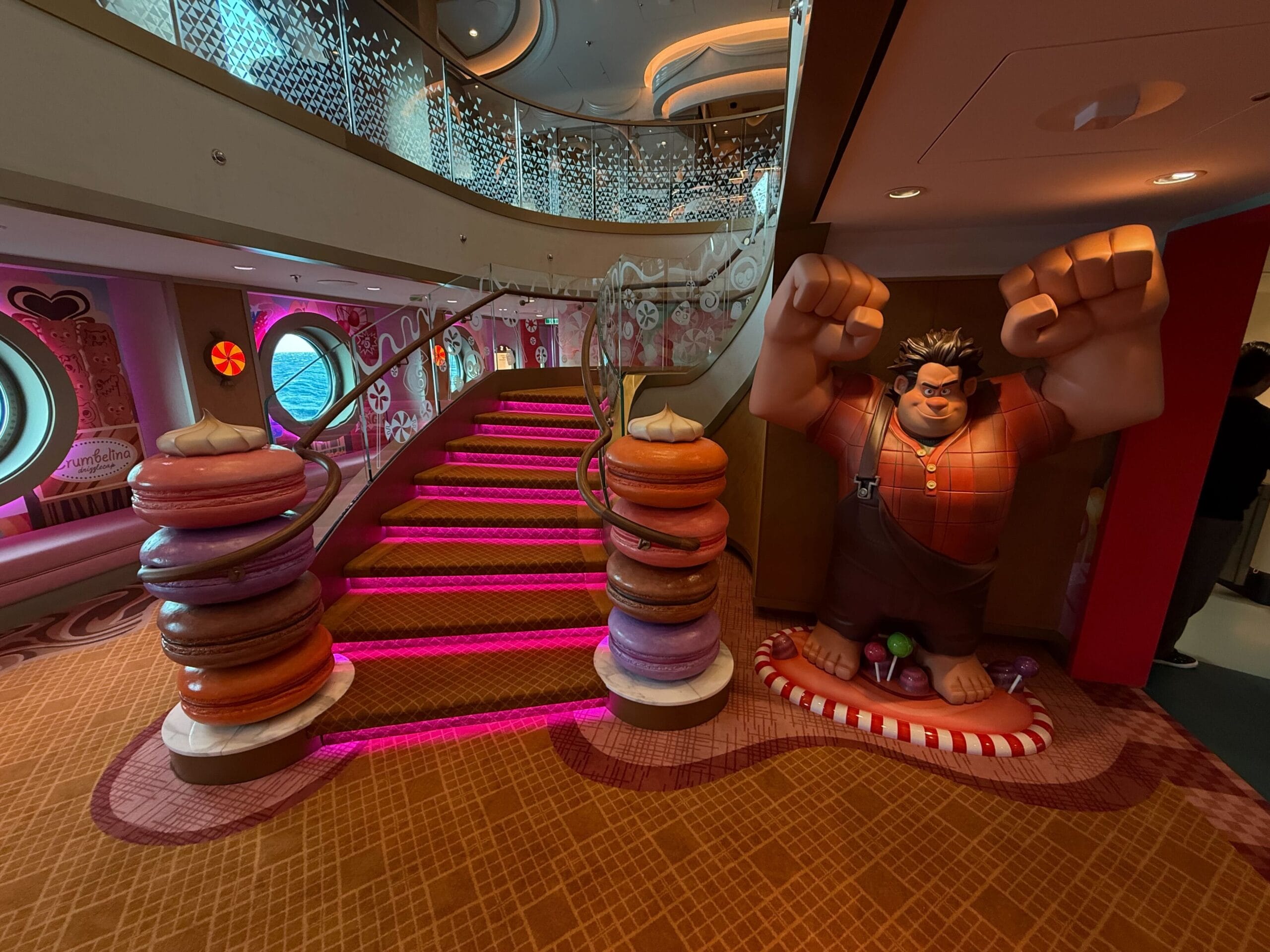 Giant macarons and the large Wreck-It Ralph statue stand at the bottom of the staircase.