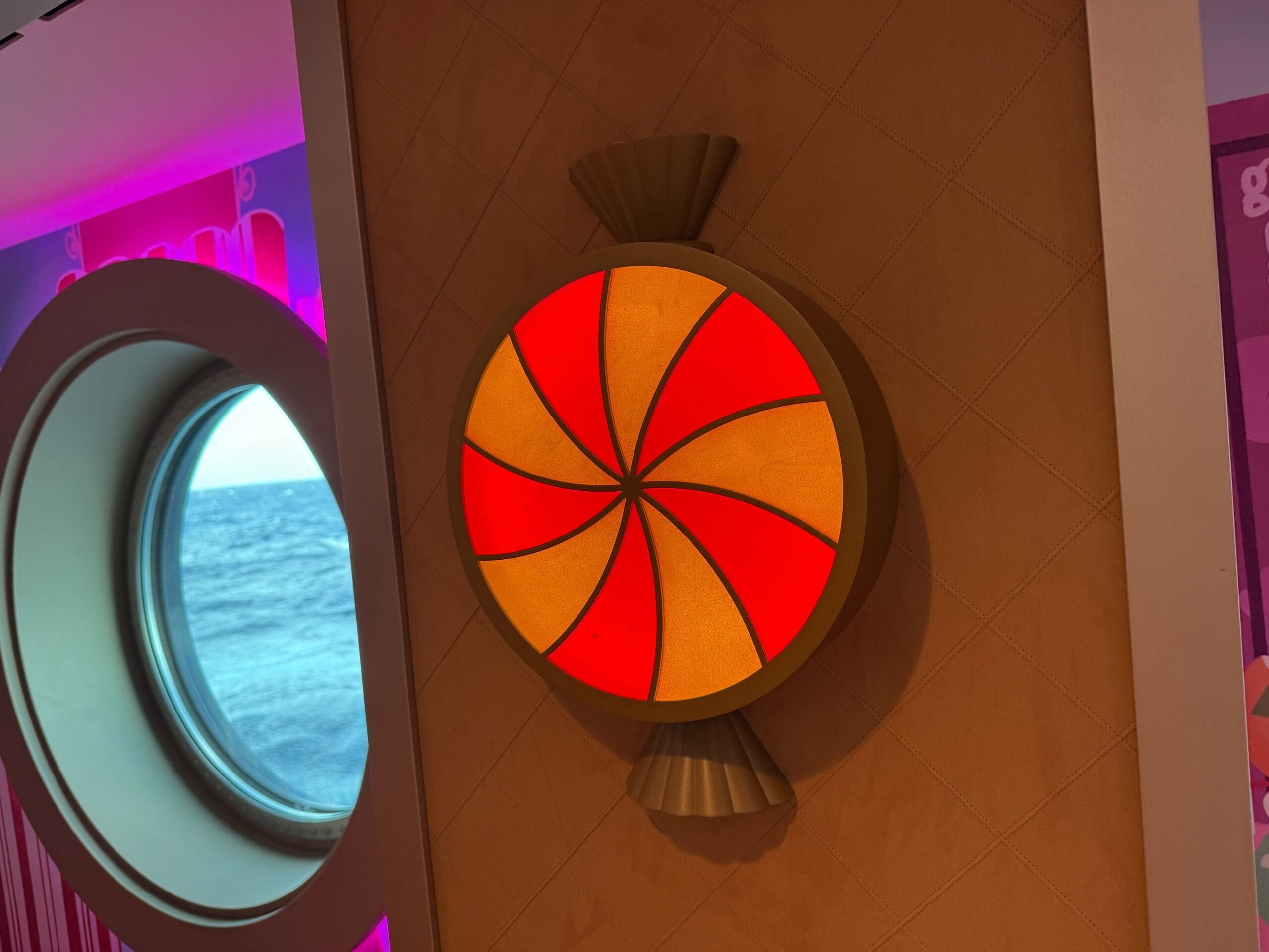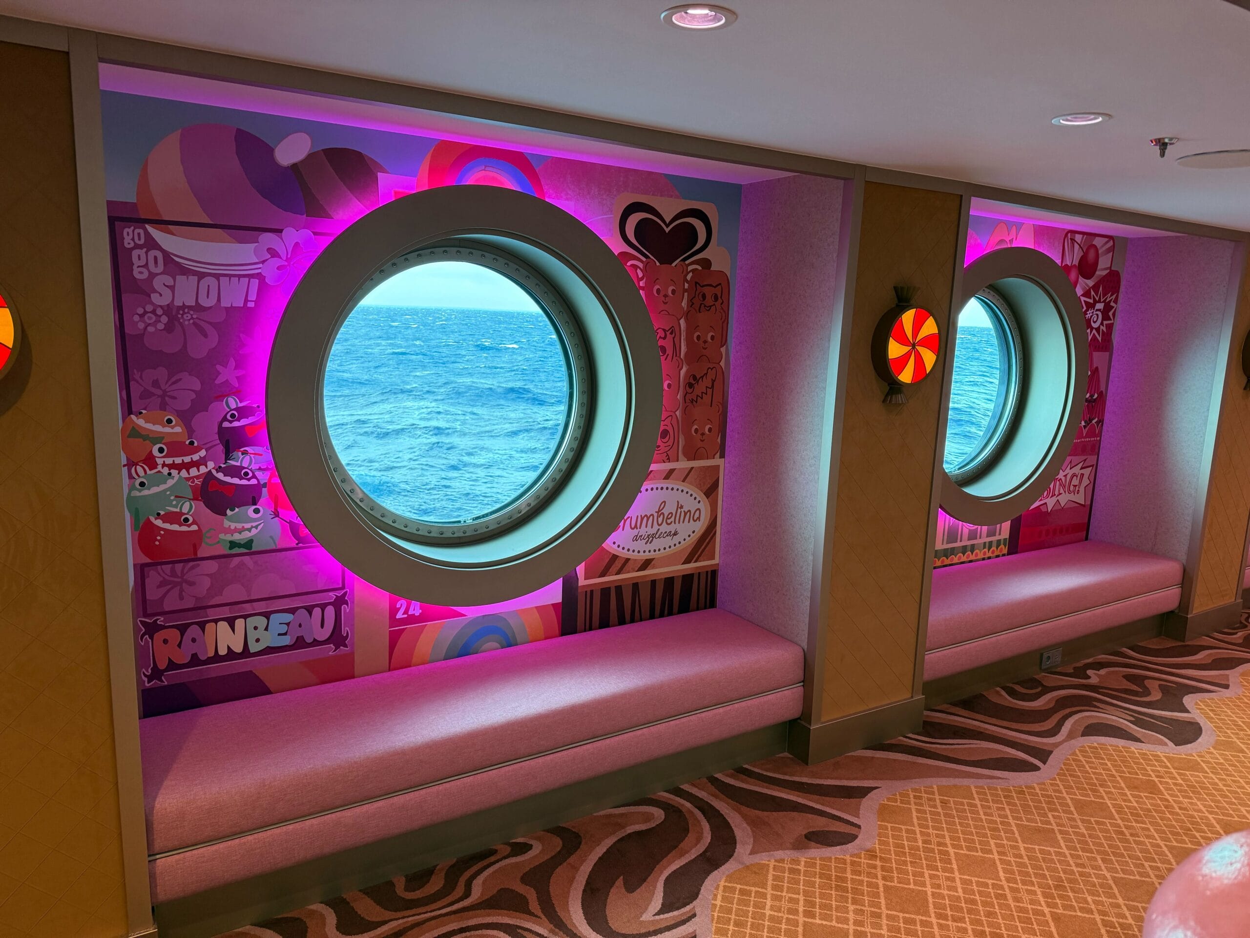 The murals and decorations outside Disney’s Oceaneer Club are inspired by Wreck-It Ralph. Built in benches sit inside little themed alcoves, which also include portholes. Lights on the wall look like peppermint-swirled candies.