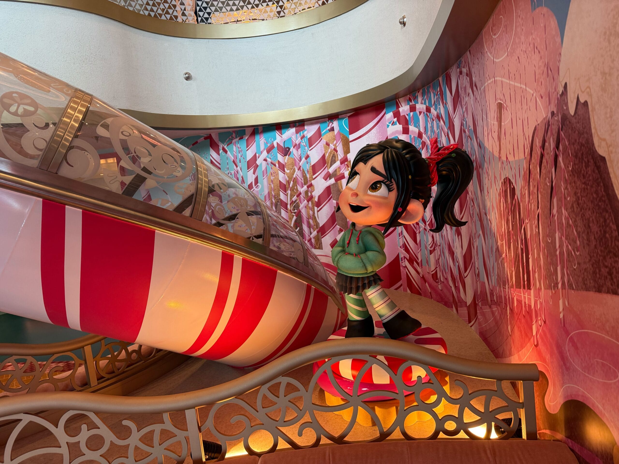 The slide is peppermint striped, and kids can be greeted by a large statue of Vanellope von Schweetz as they slide down.