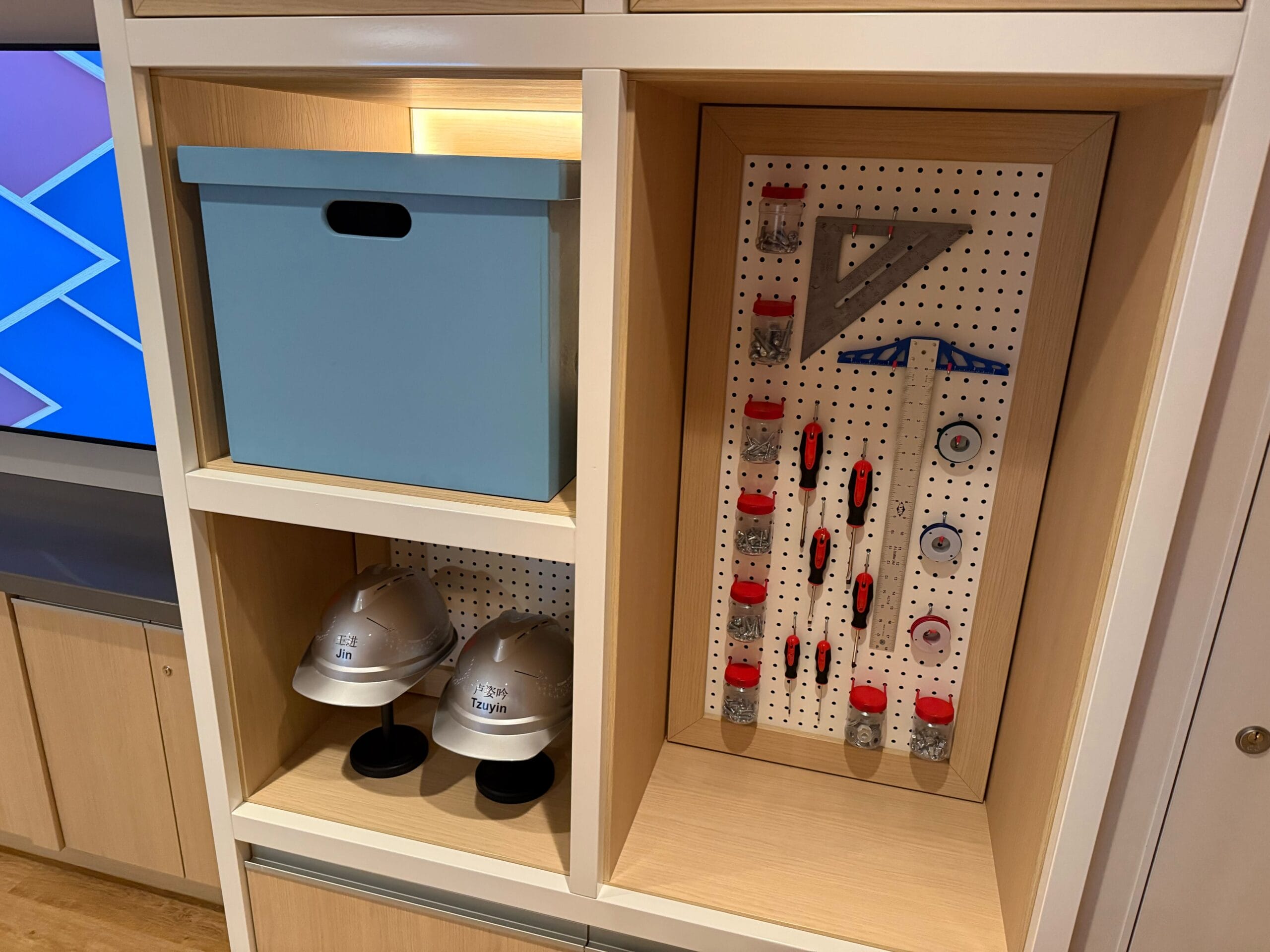 The space has several tables with chairs, screens, and stations set up for imaginative play.