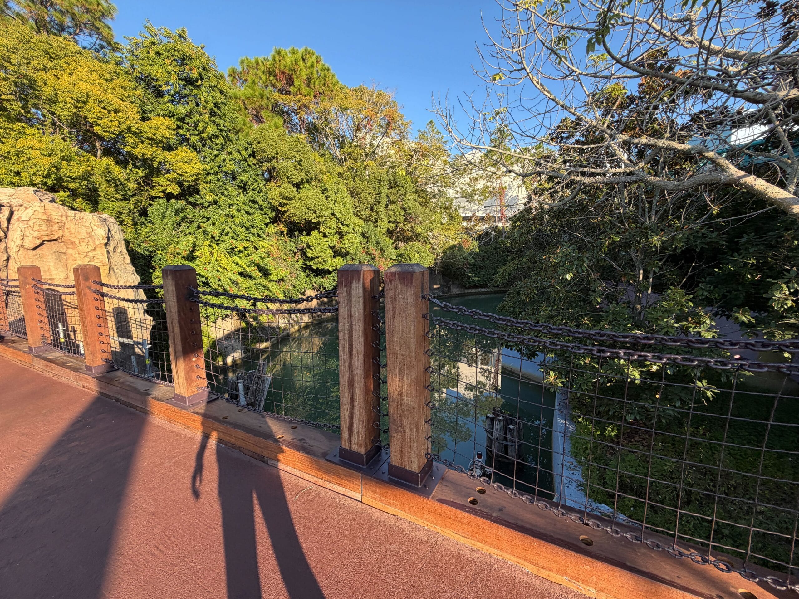The railings on the right side of the bridge are the same style as before, although seem to have been completely replaced. Wire fencing and chains hang between wooden posts. Like the wood on the other side of the bridge, these posts and the wood base appear to be brand new. They have a fresh reddish-brown stain.