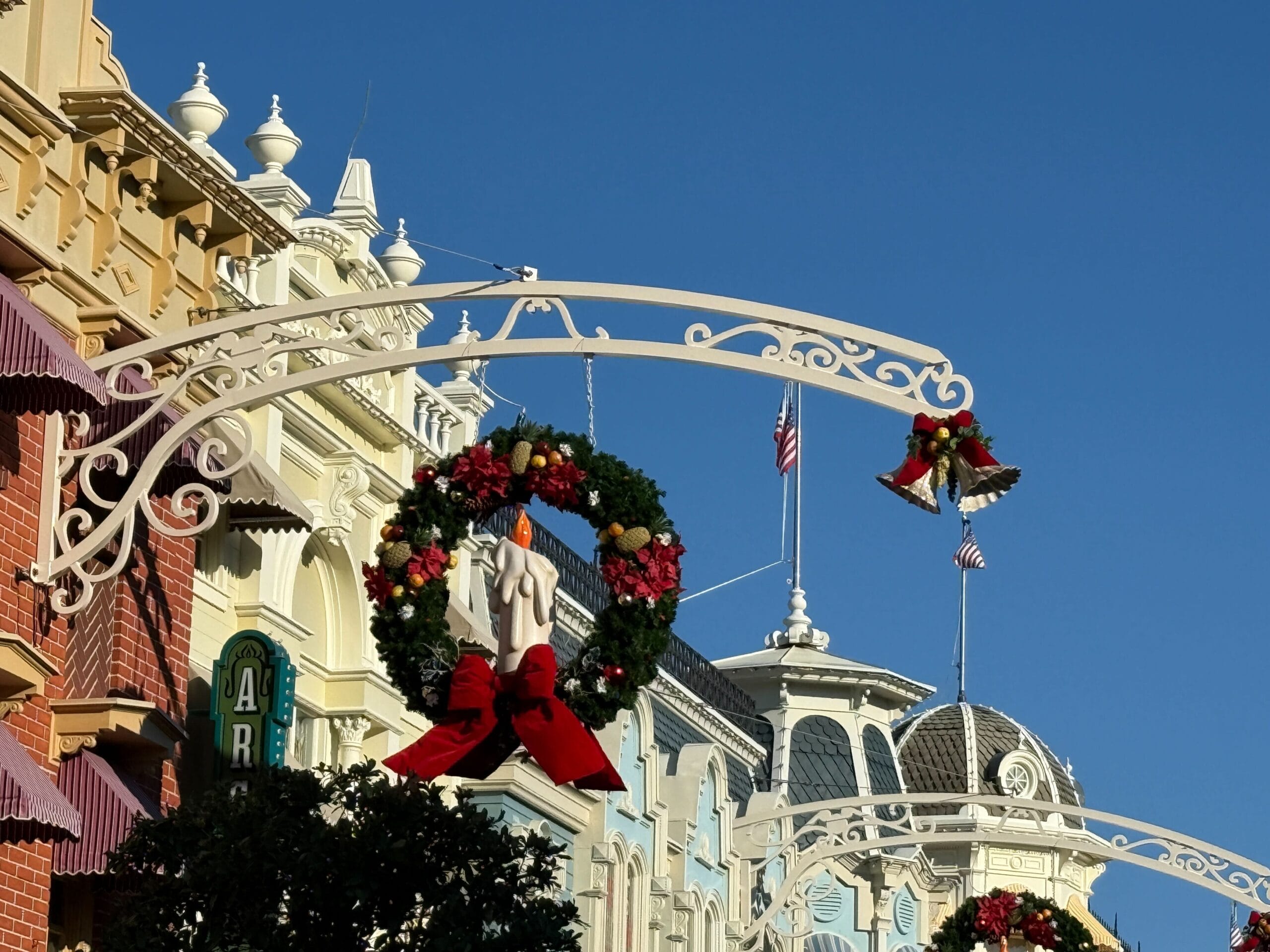 Wreaths and jingle bells now hang from white elements sticking out of the Main Street facades.