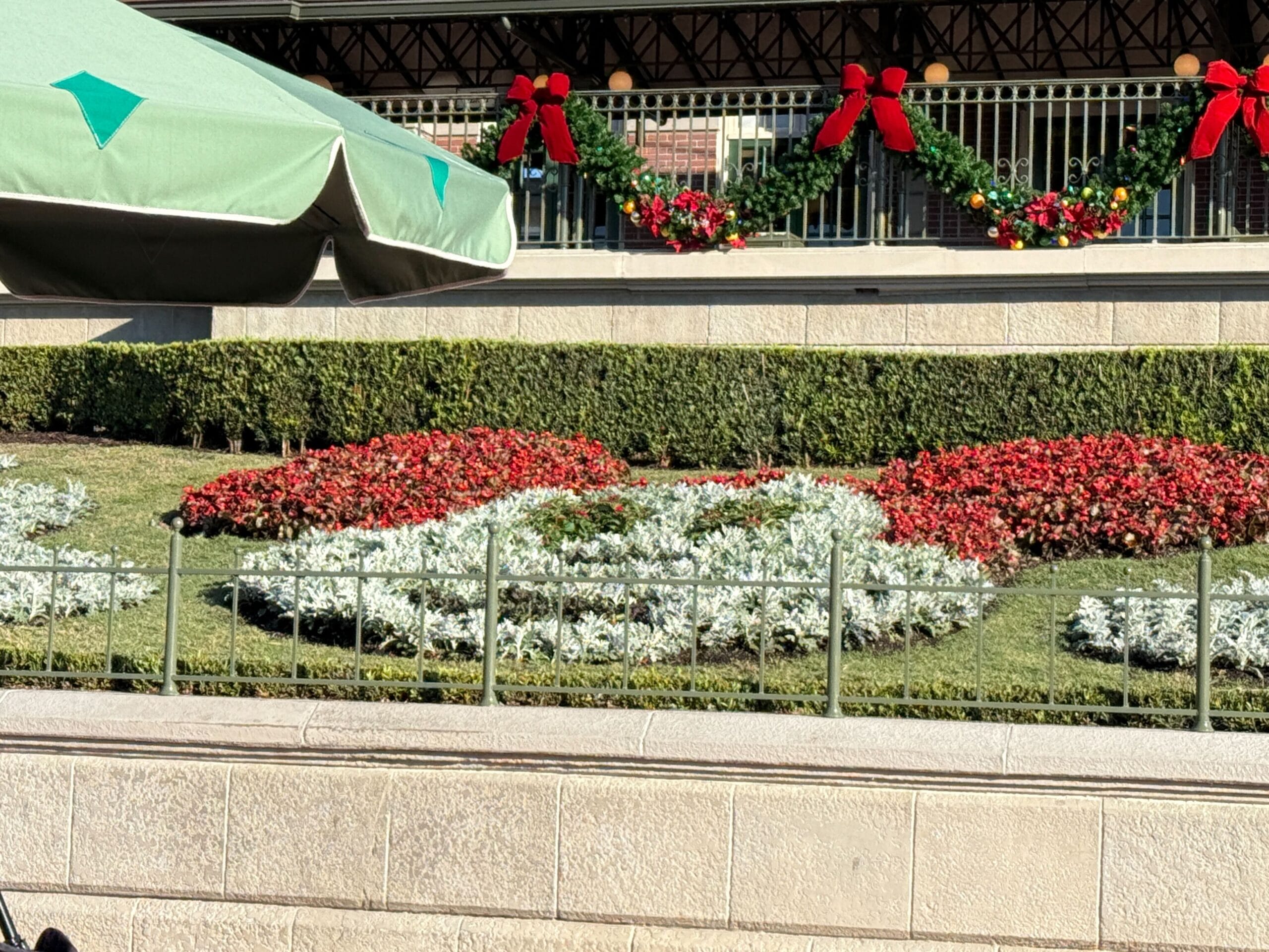As we reported this weekend, the Mickey flowerbed in front of the train station is now red and green. Garland is across the station and its railings.