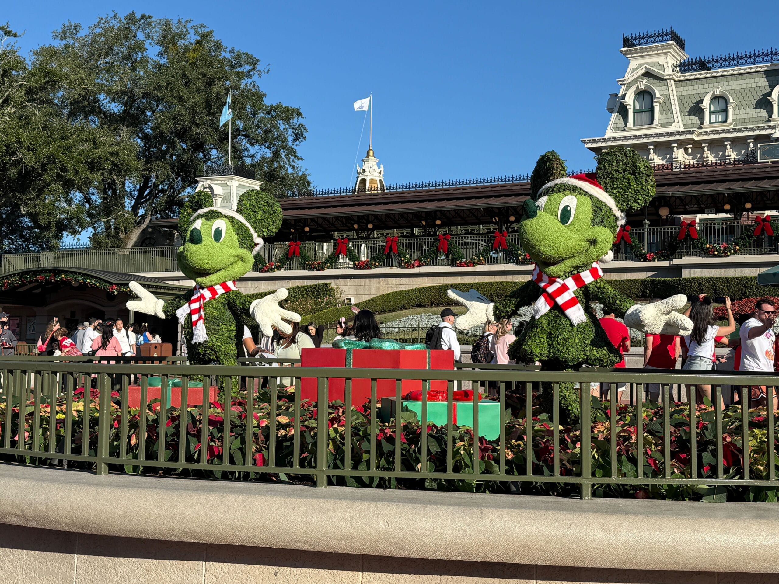 Festive Mickey and Minnie topiaries now greet guests at the park entrance. They wear Santa caps and striped scarves. The flowerbed they stand in features red flowers and gift boxes.