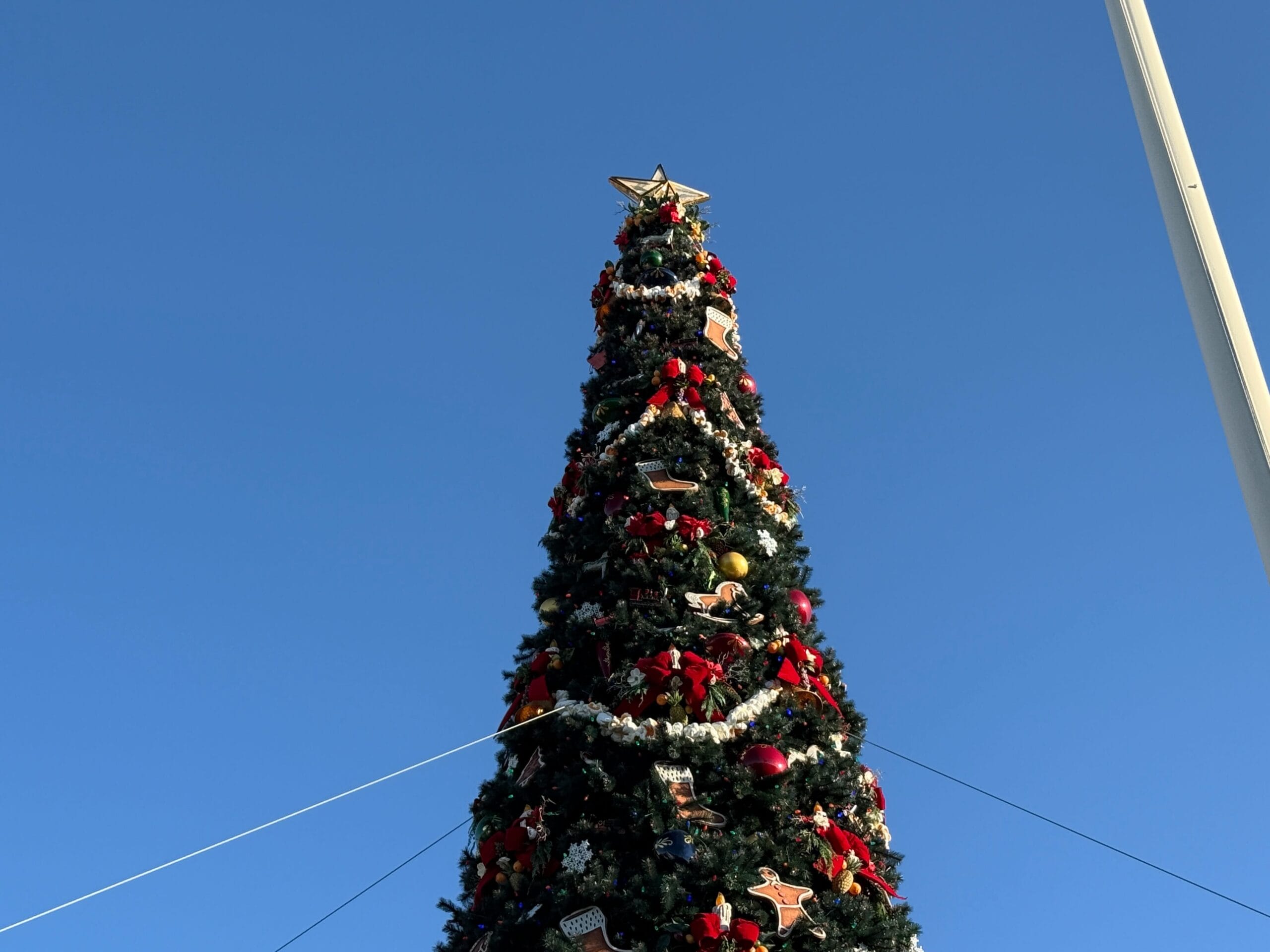The tree is in the center of Town Square, near the main entrance of the Emporium. It’s the same tree as previous years, with giant popcorn garland, red bows, and large ornaments.