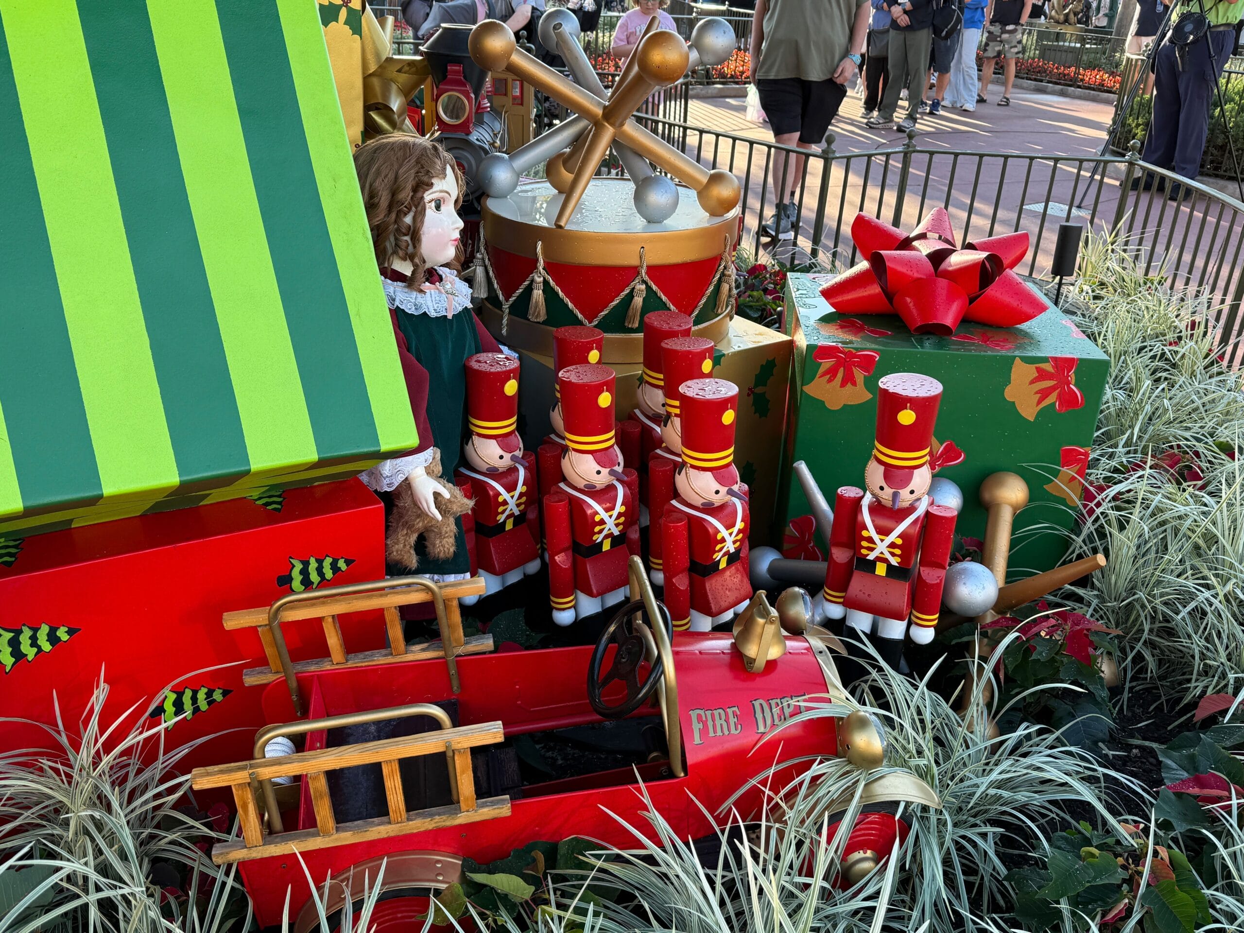 Some of Disney’s signature toy soldiers are gathered next to a toy version of the Main Street fire truck.