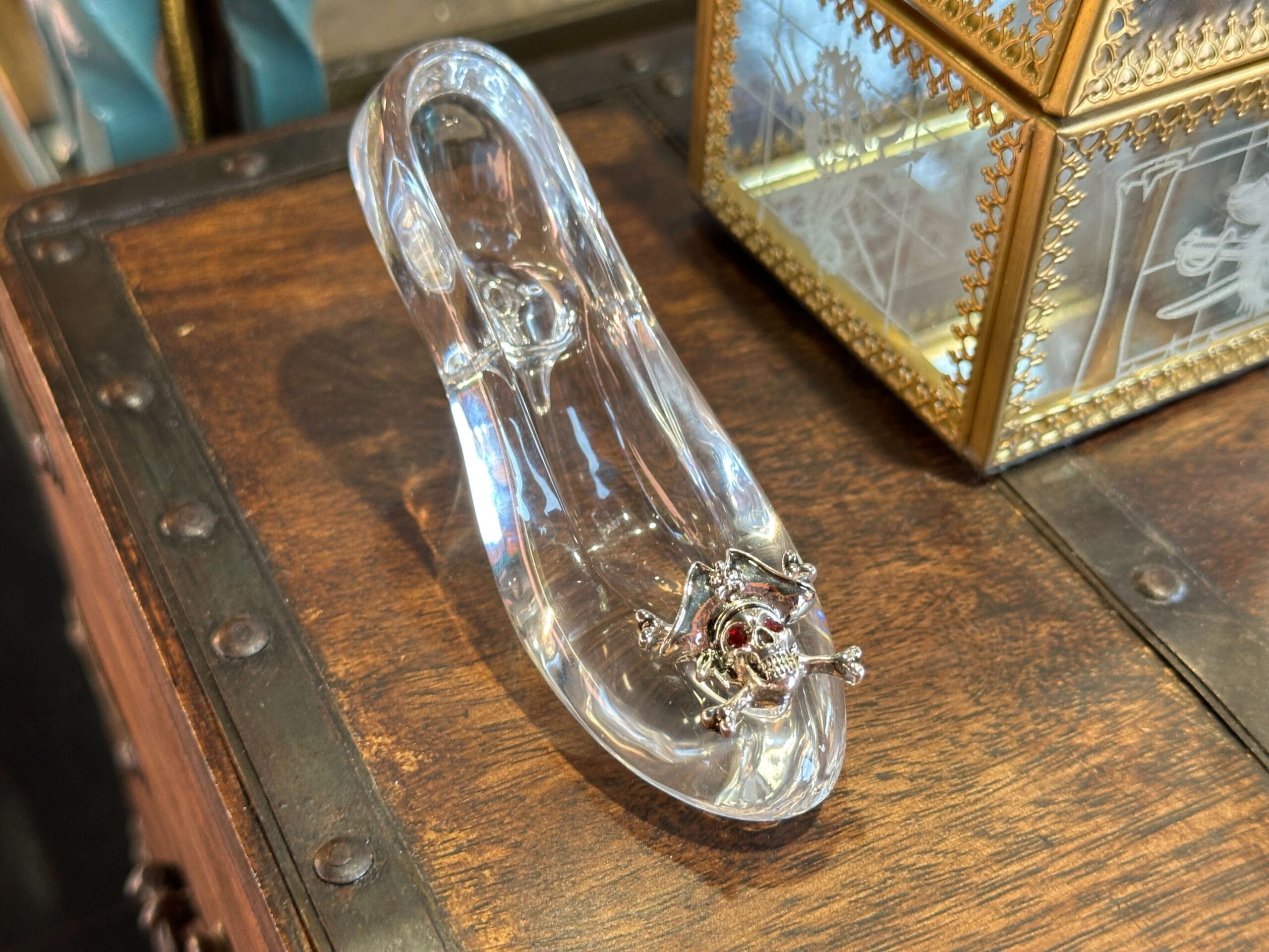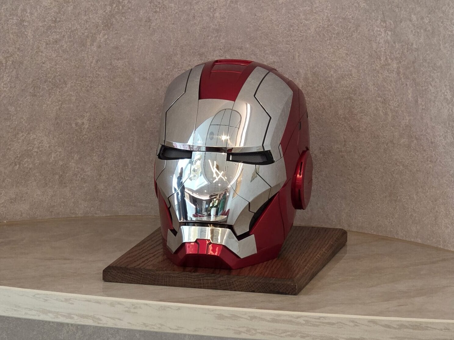 Iron Man’s mask sits in the corner on display.