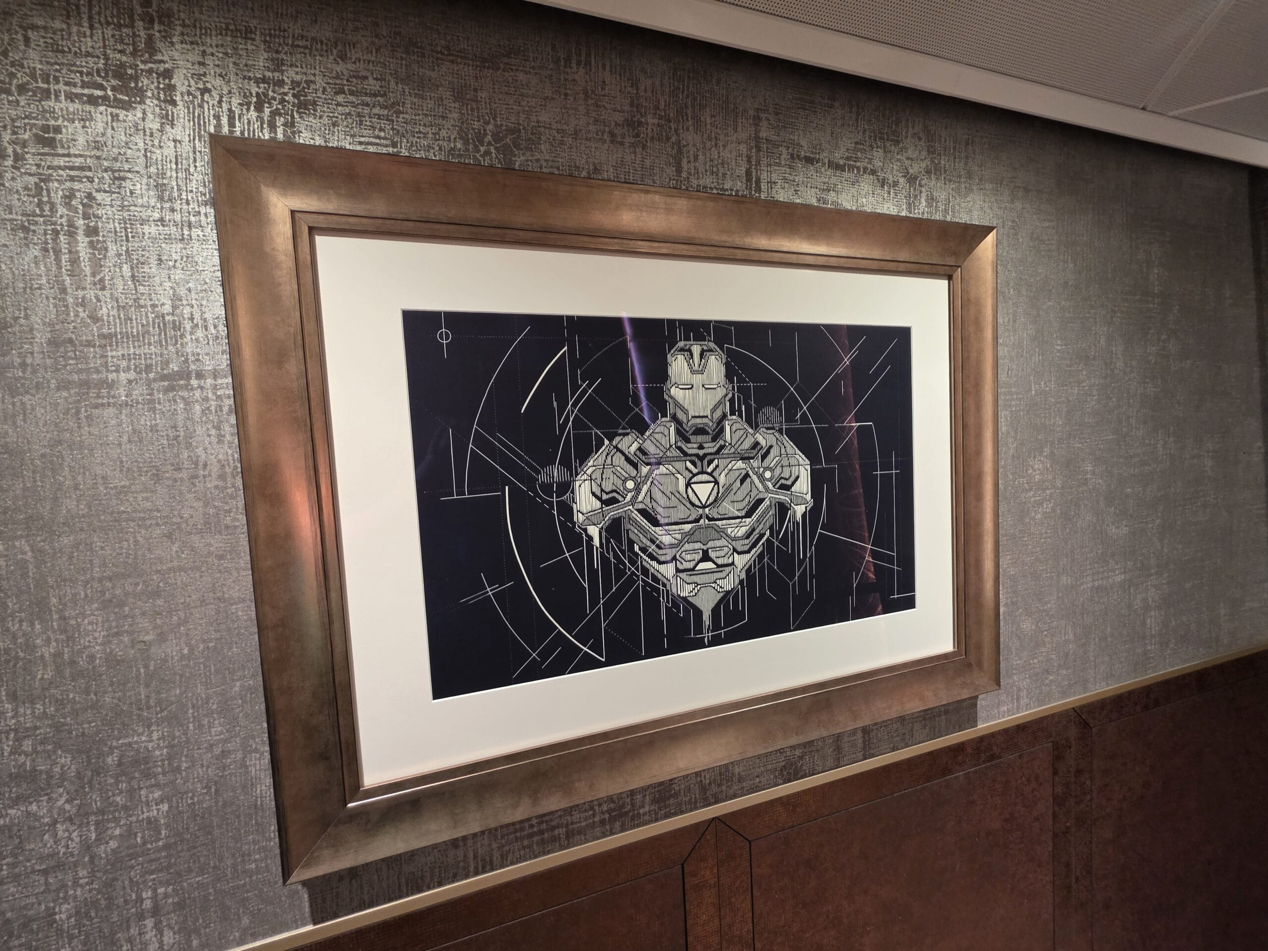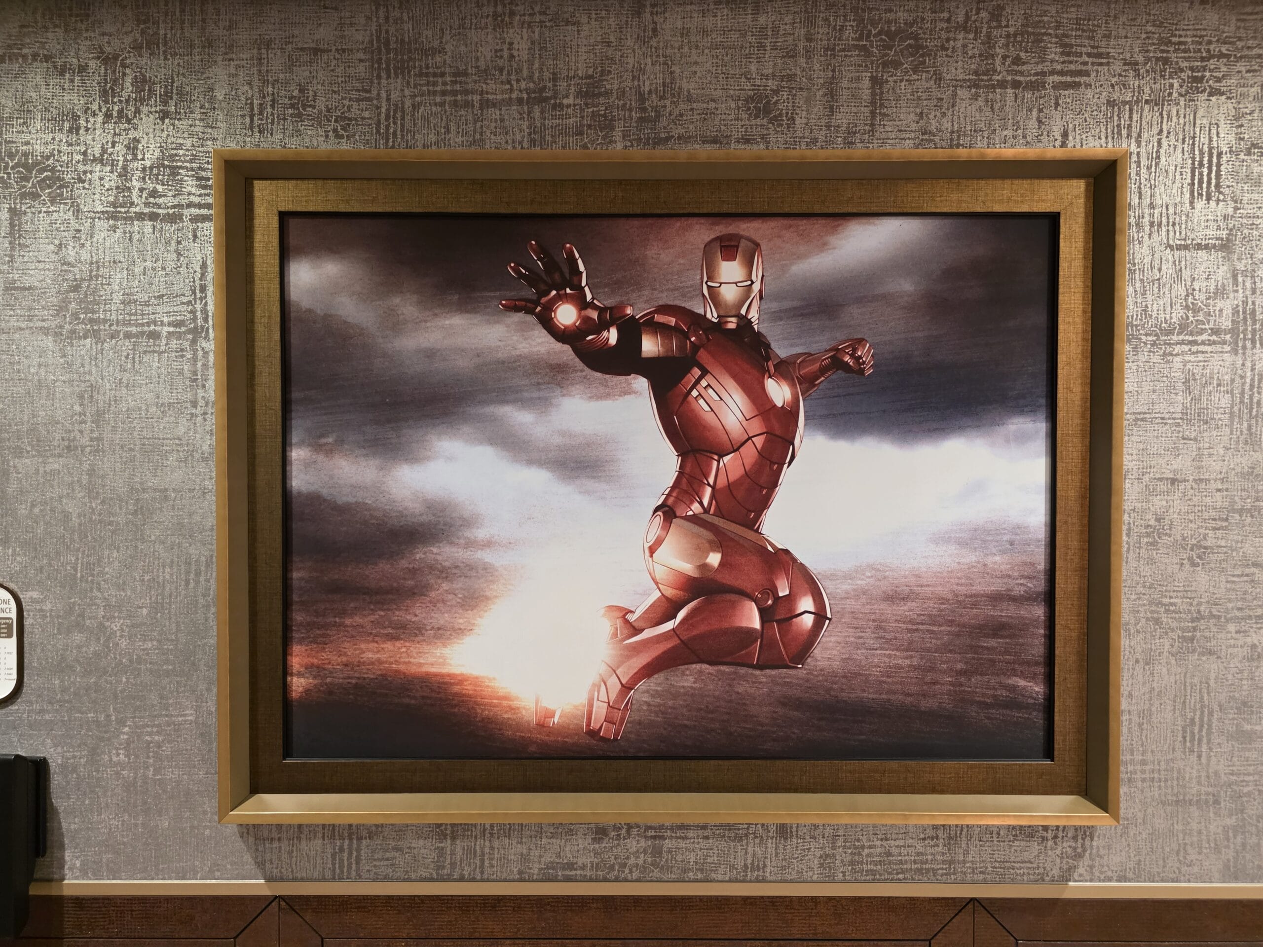 More artwork lines the walls, including Iron Man.