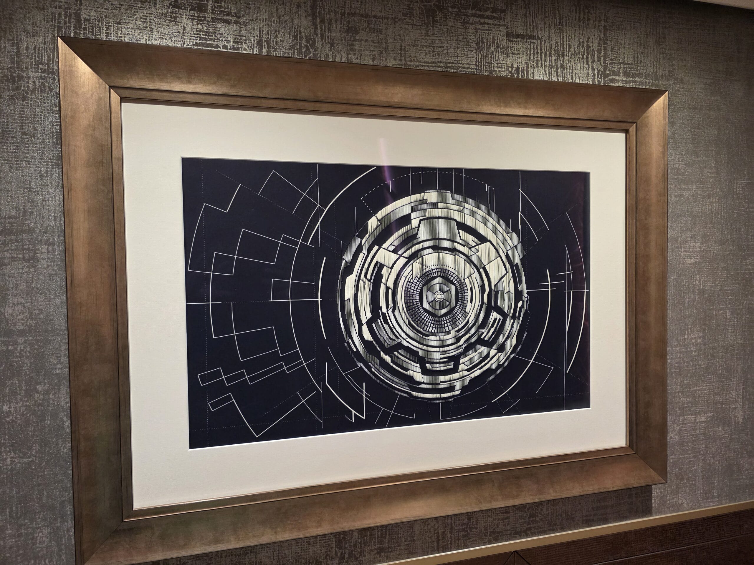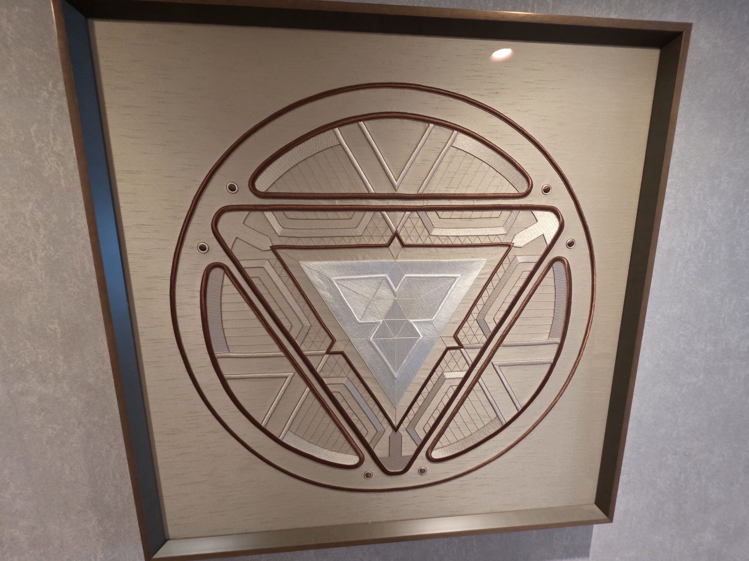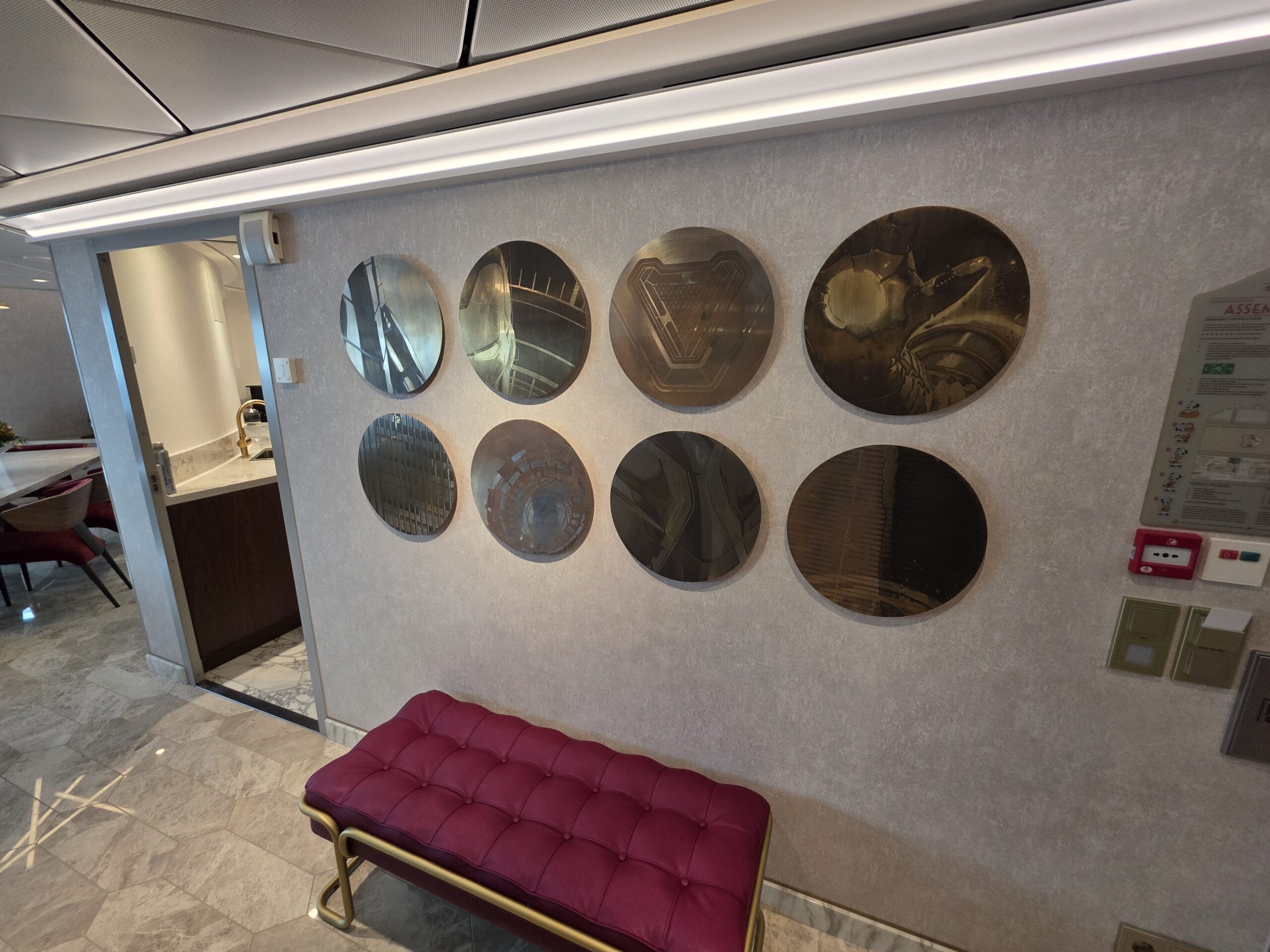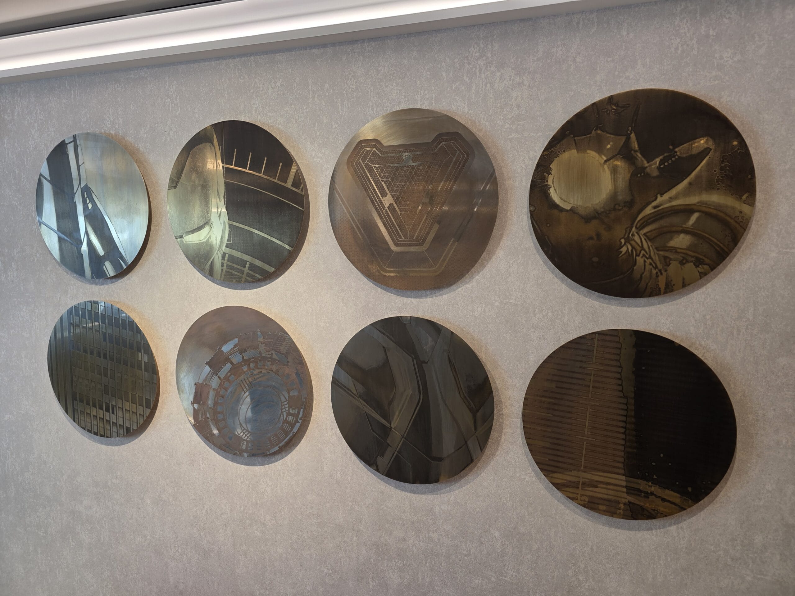 Brass Marvel-themed artwork hangs on the wall in a set of eight circular discs.