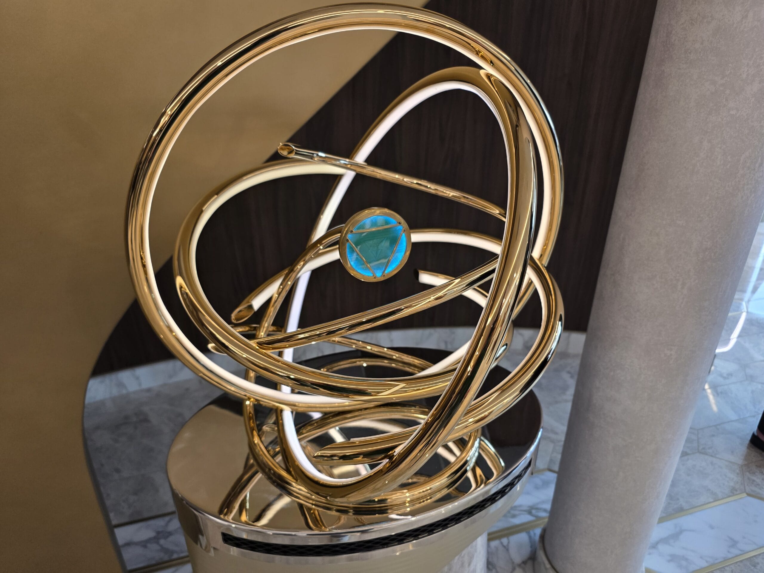 On display is the Eternity Forge from Eternals. The golden spherical object has intertwining rings and a central blue core.