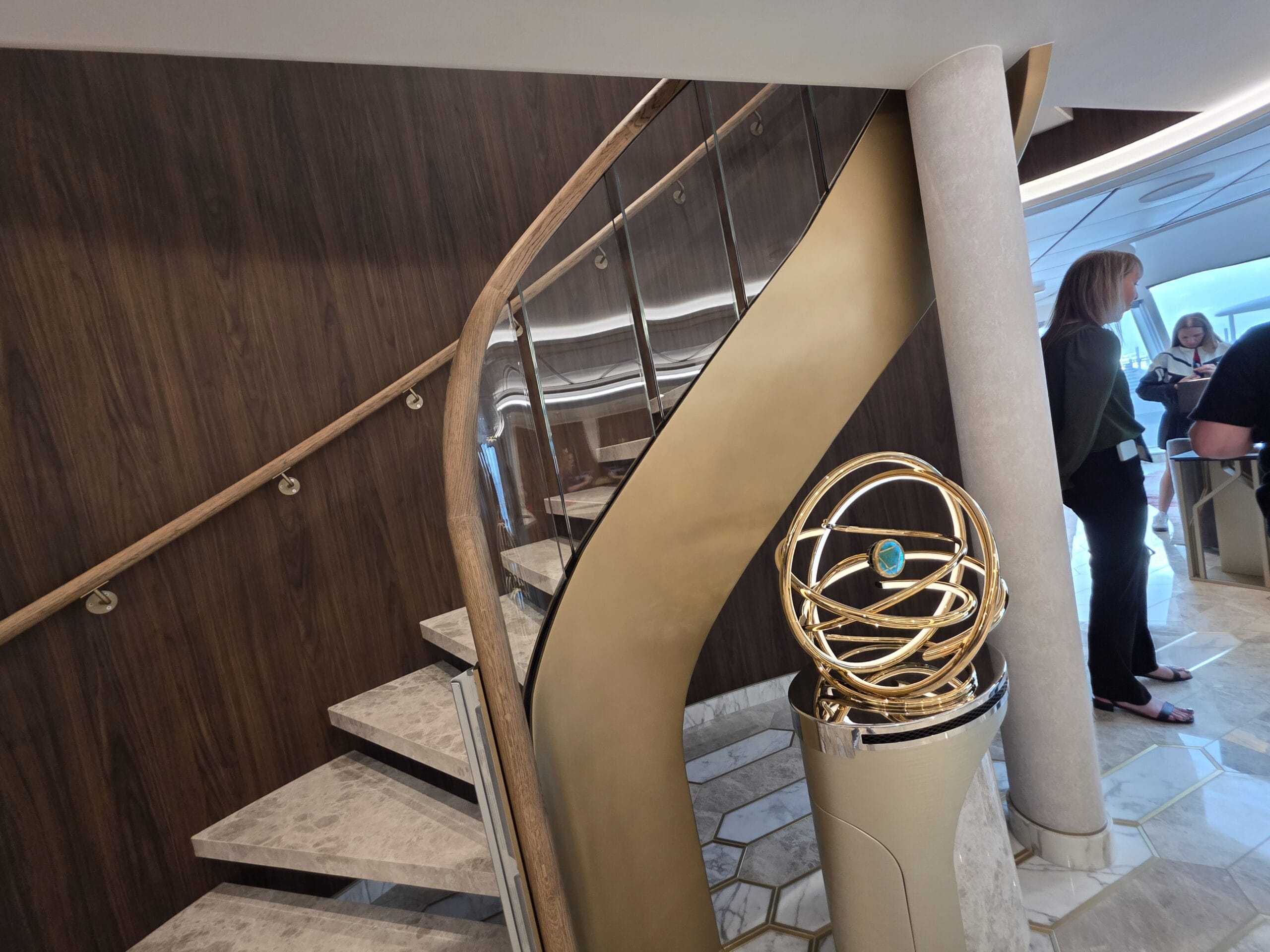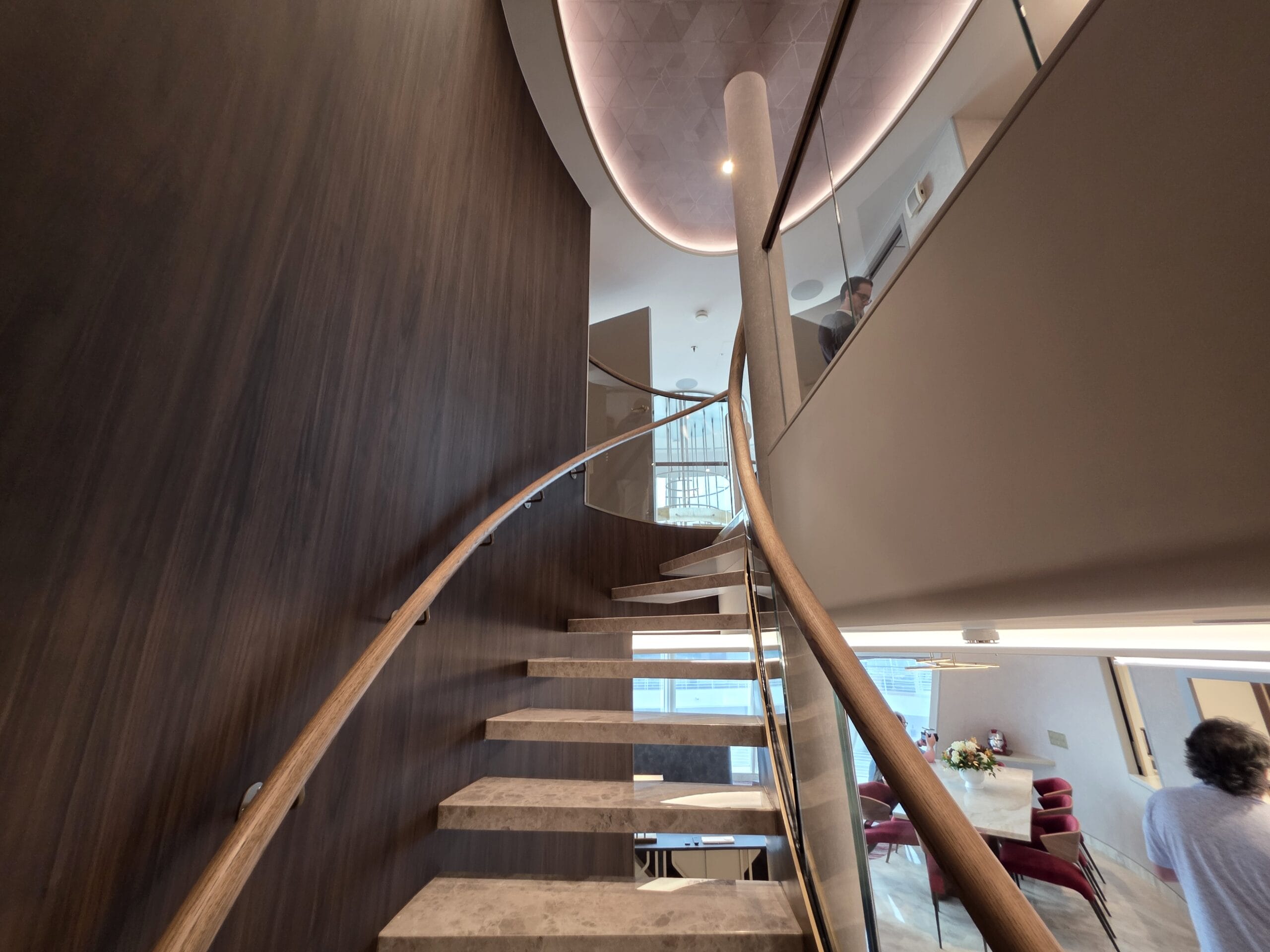 A grand spiral staircase leads to the second story of the suite.