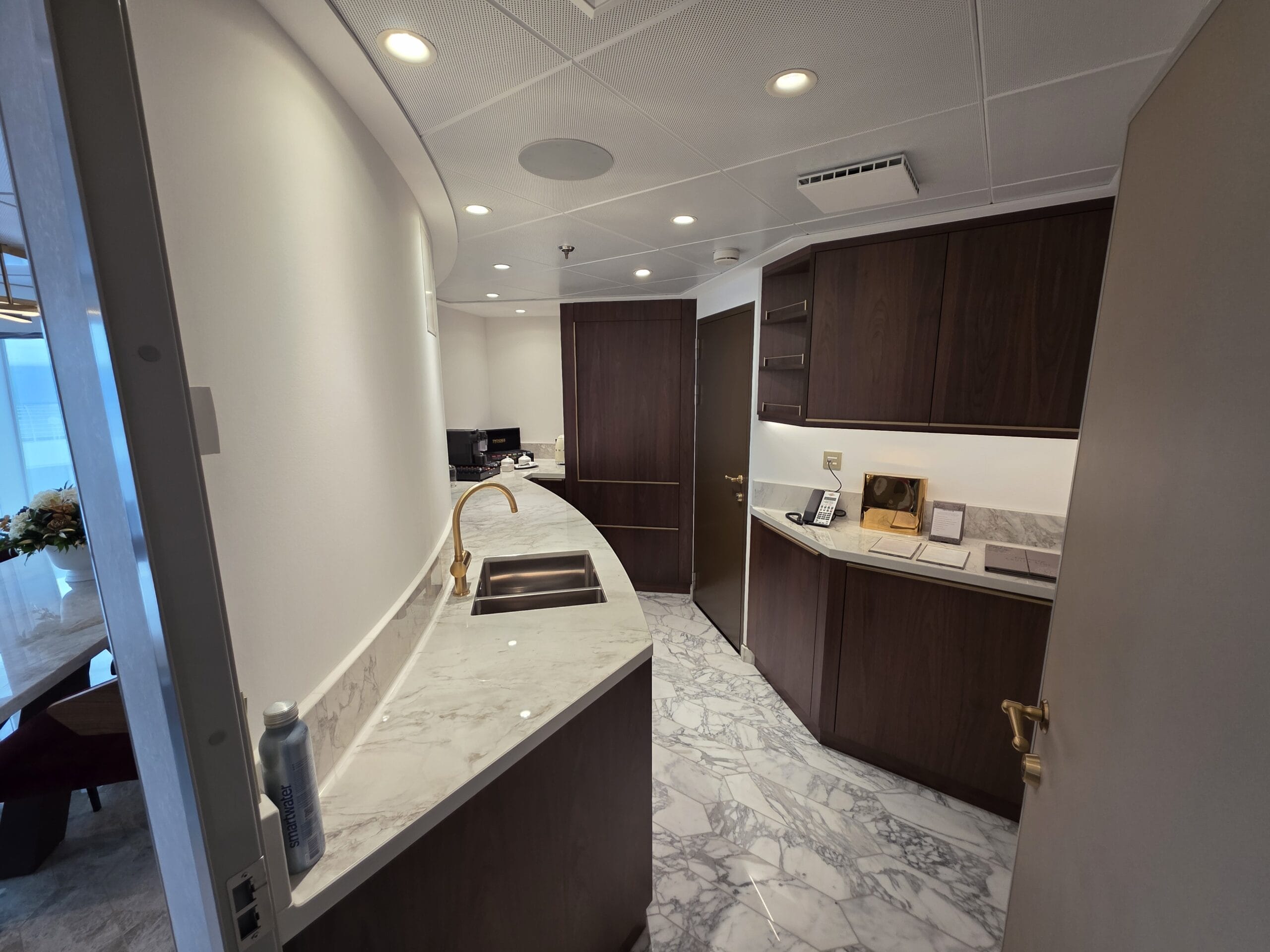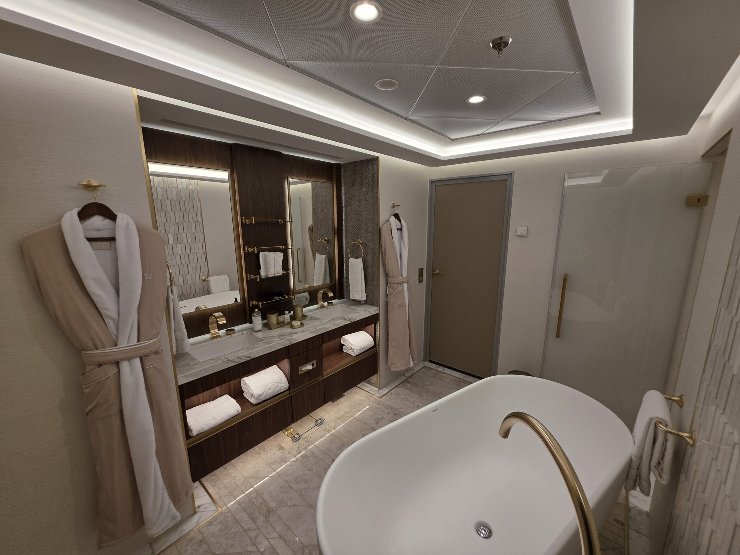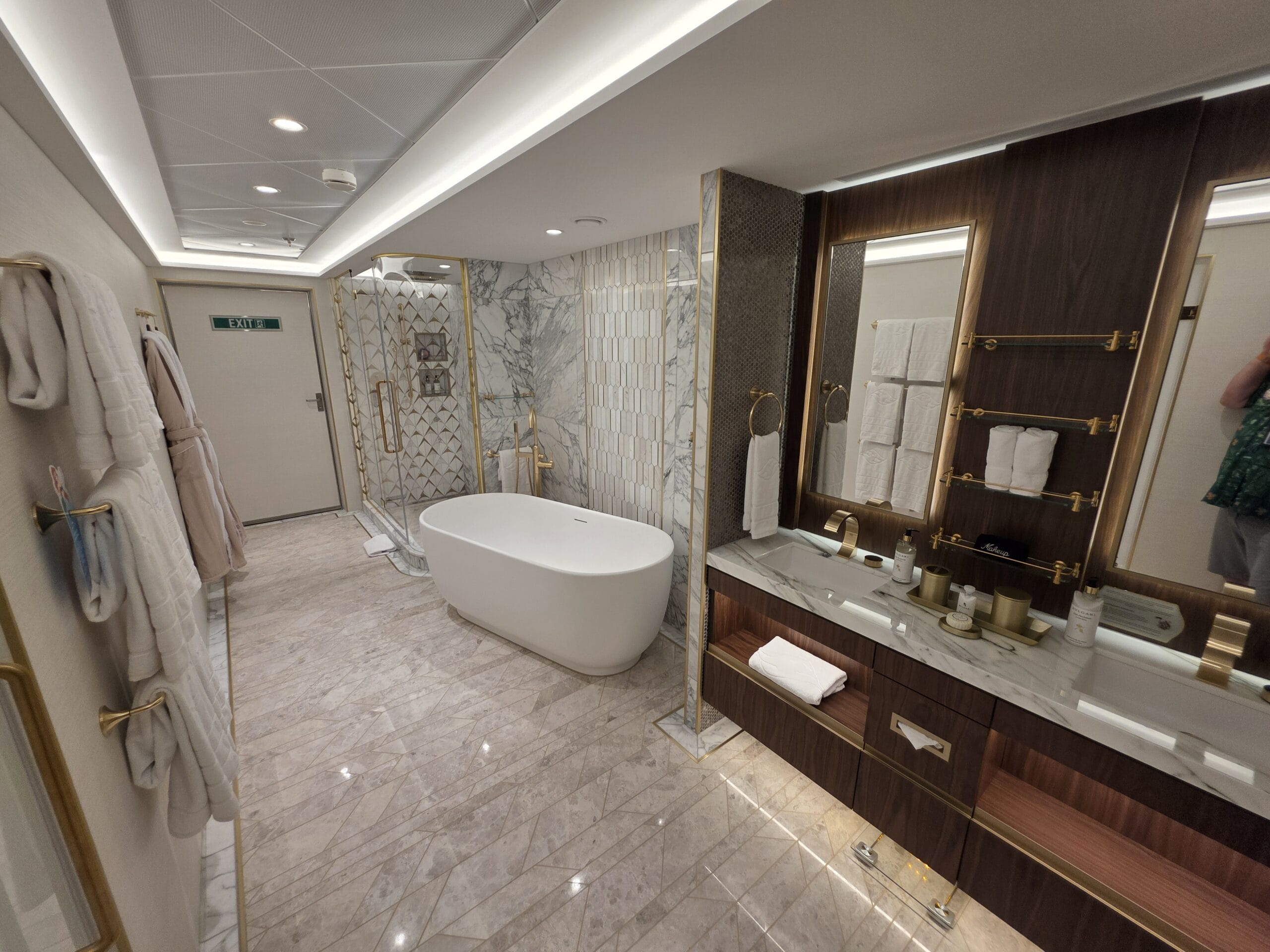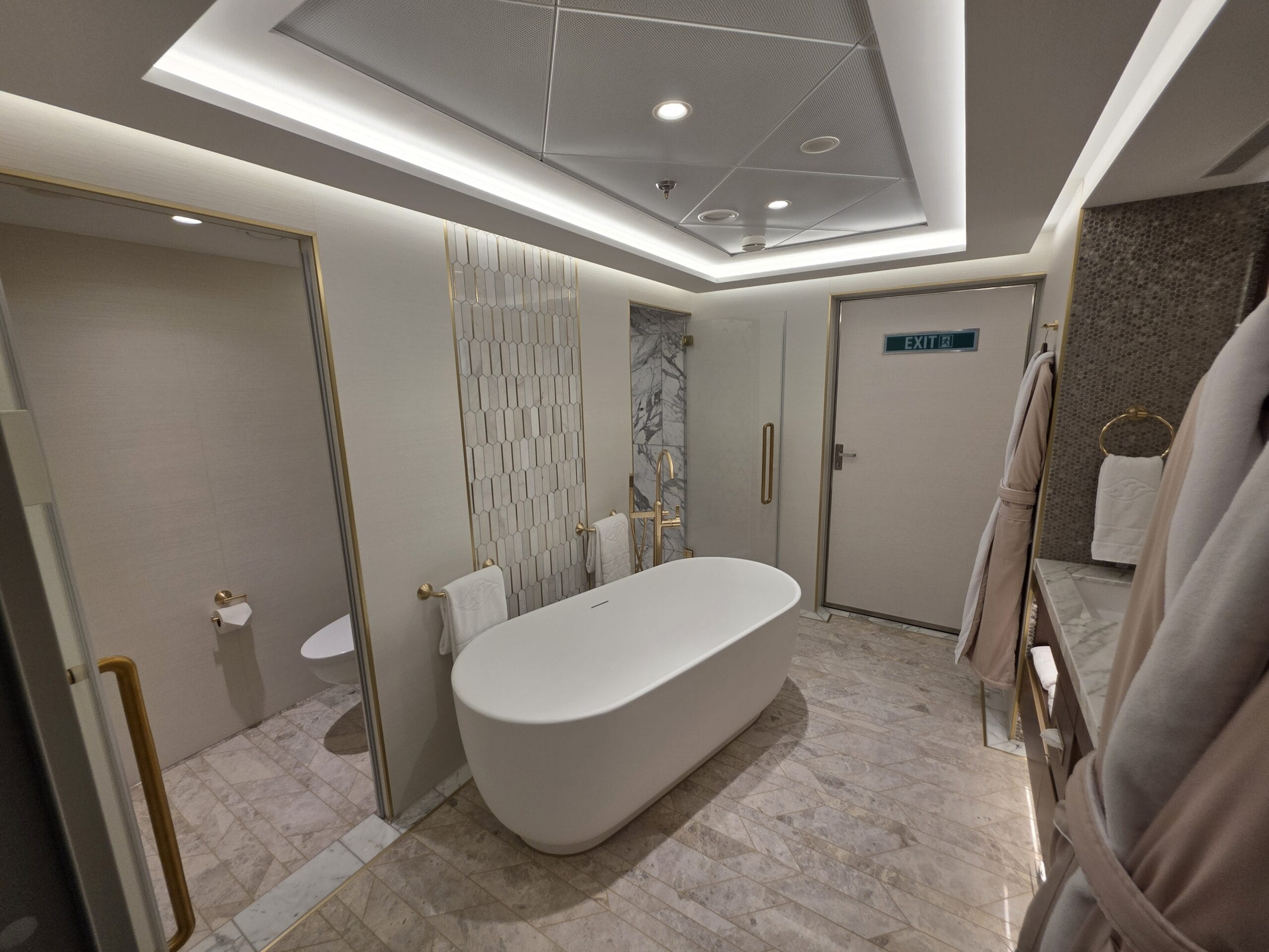 Because this is a Concierge Suite, guests booking this Tower Suite can expect down duvets, several pillow options, personal robes and slippers, complimentary access to Premium Surf Wi-Fi internet service, and exclusive access to dedicated areas on the ship, including the Concierge Lounge.