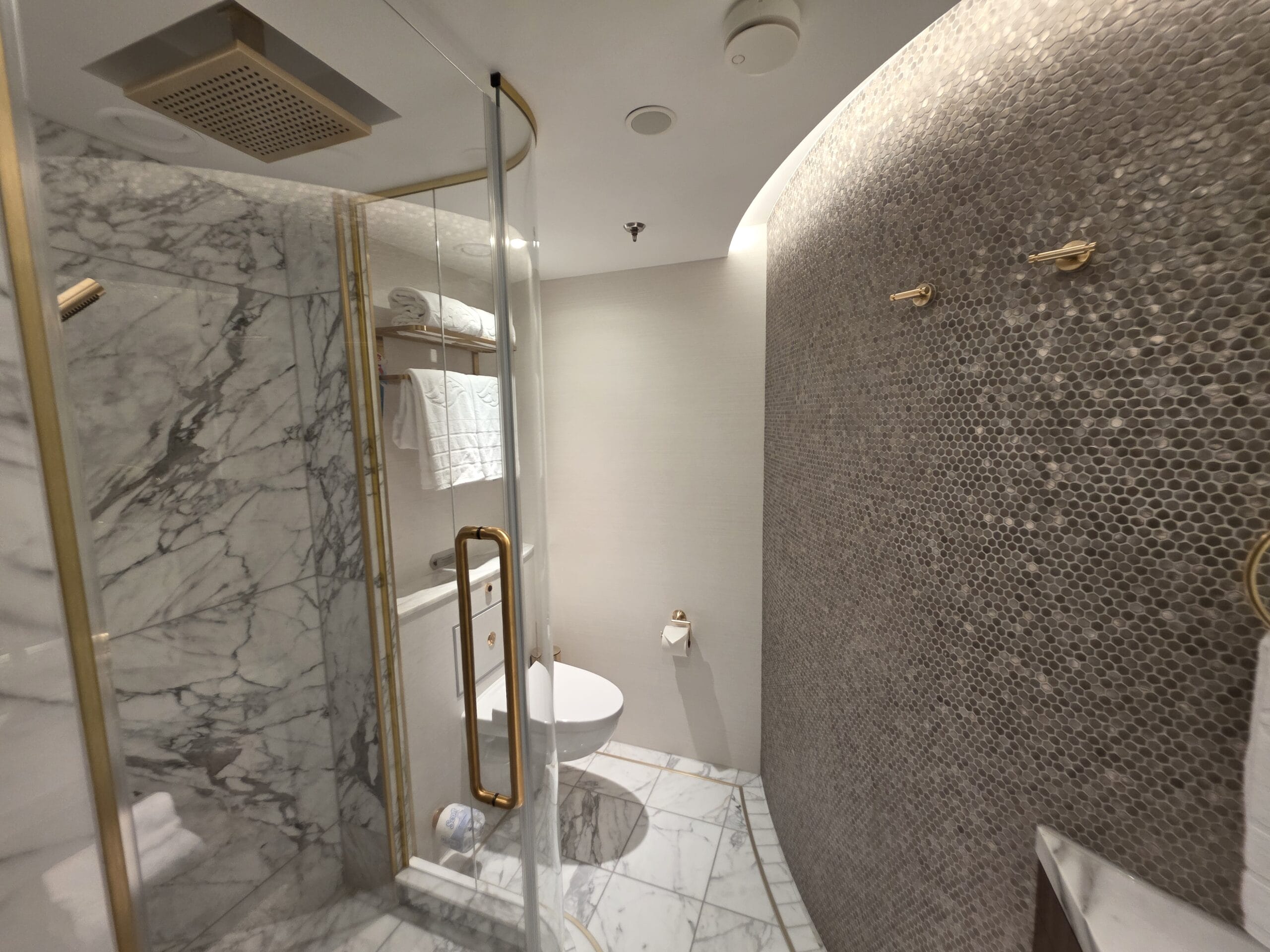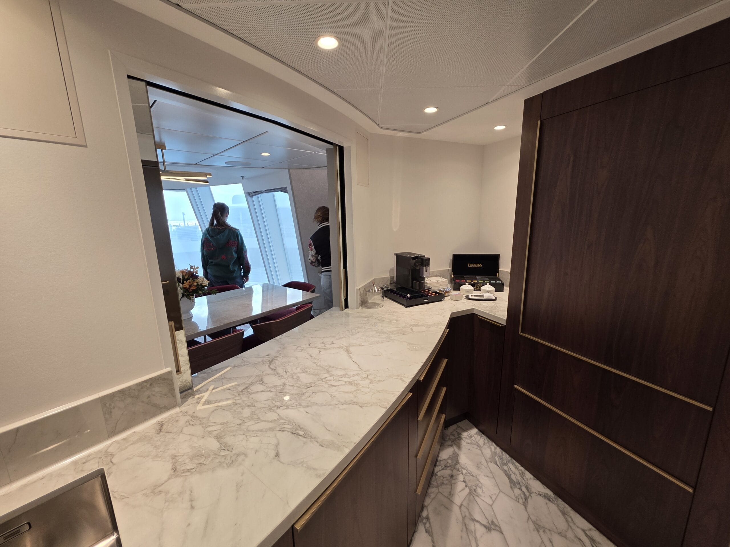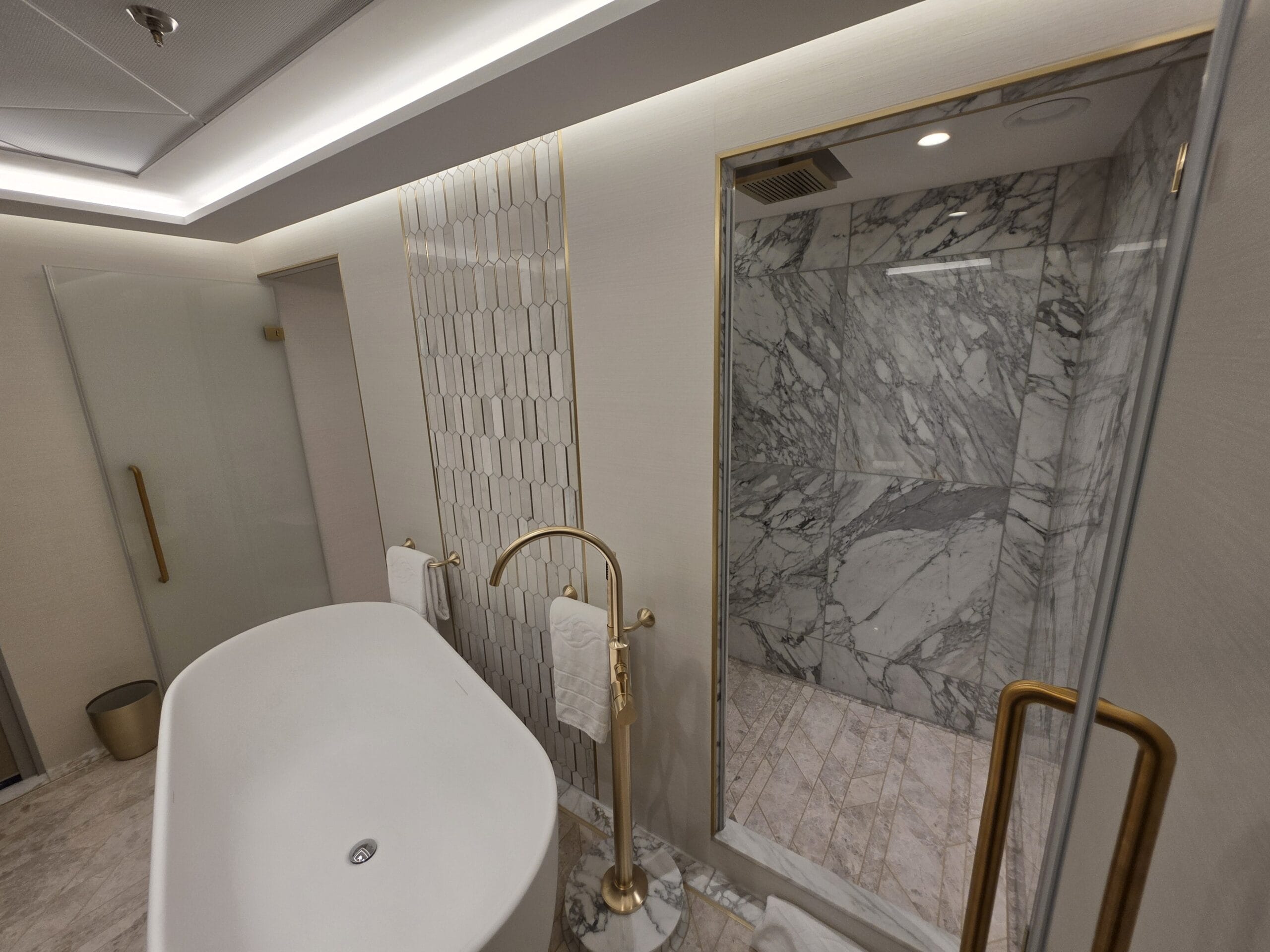 Because this is a Concierge Suite, guests booking this Tower Suite can expect down duvets, several pillow options, personal robes and slippers, complimentary access to Premium Surf Wi-Fi internet service, and exclusive access to dedicated areas on the ship, including the Concierge Lounge.