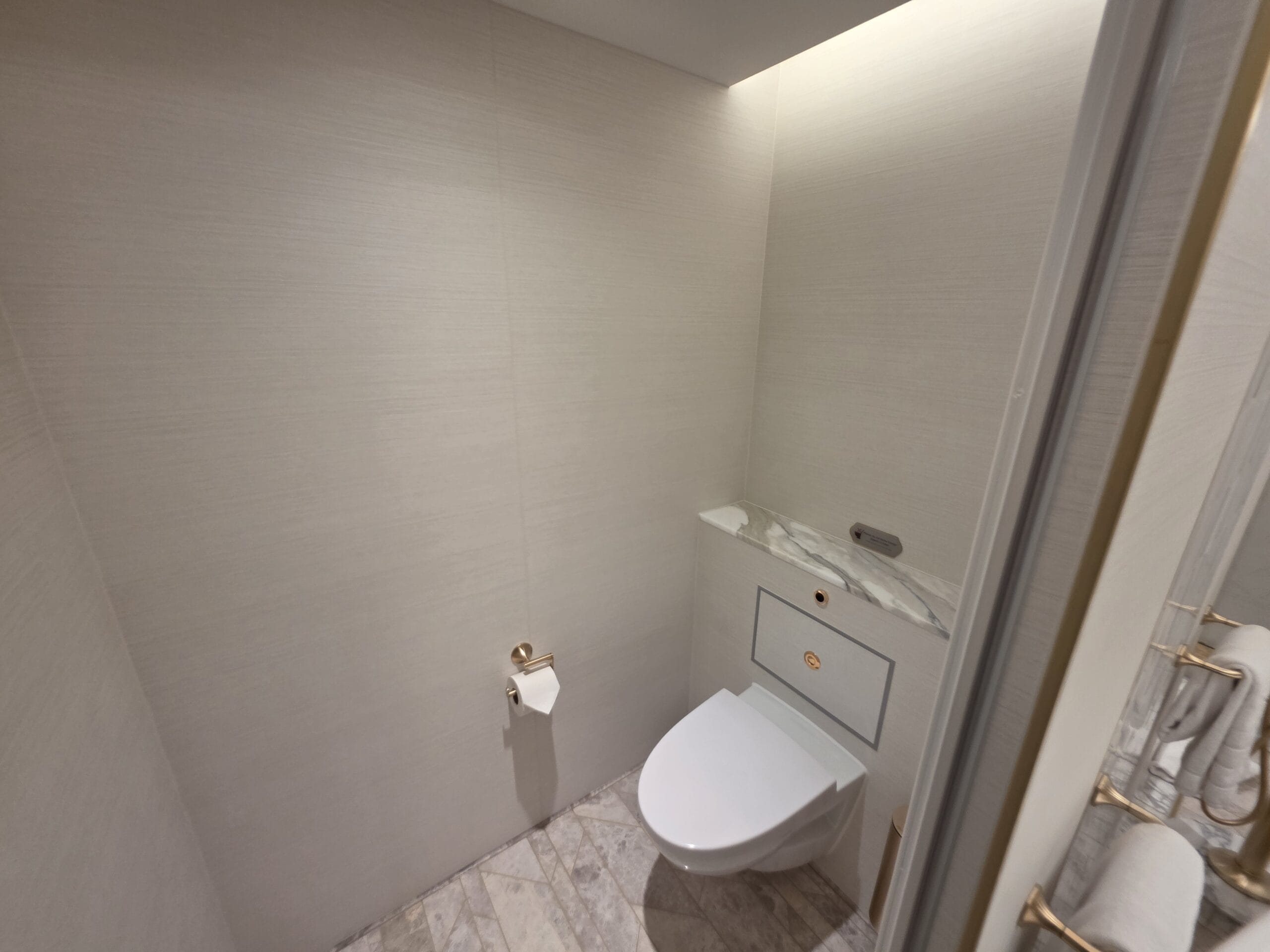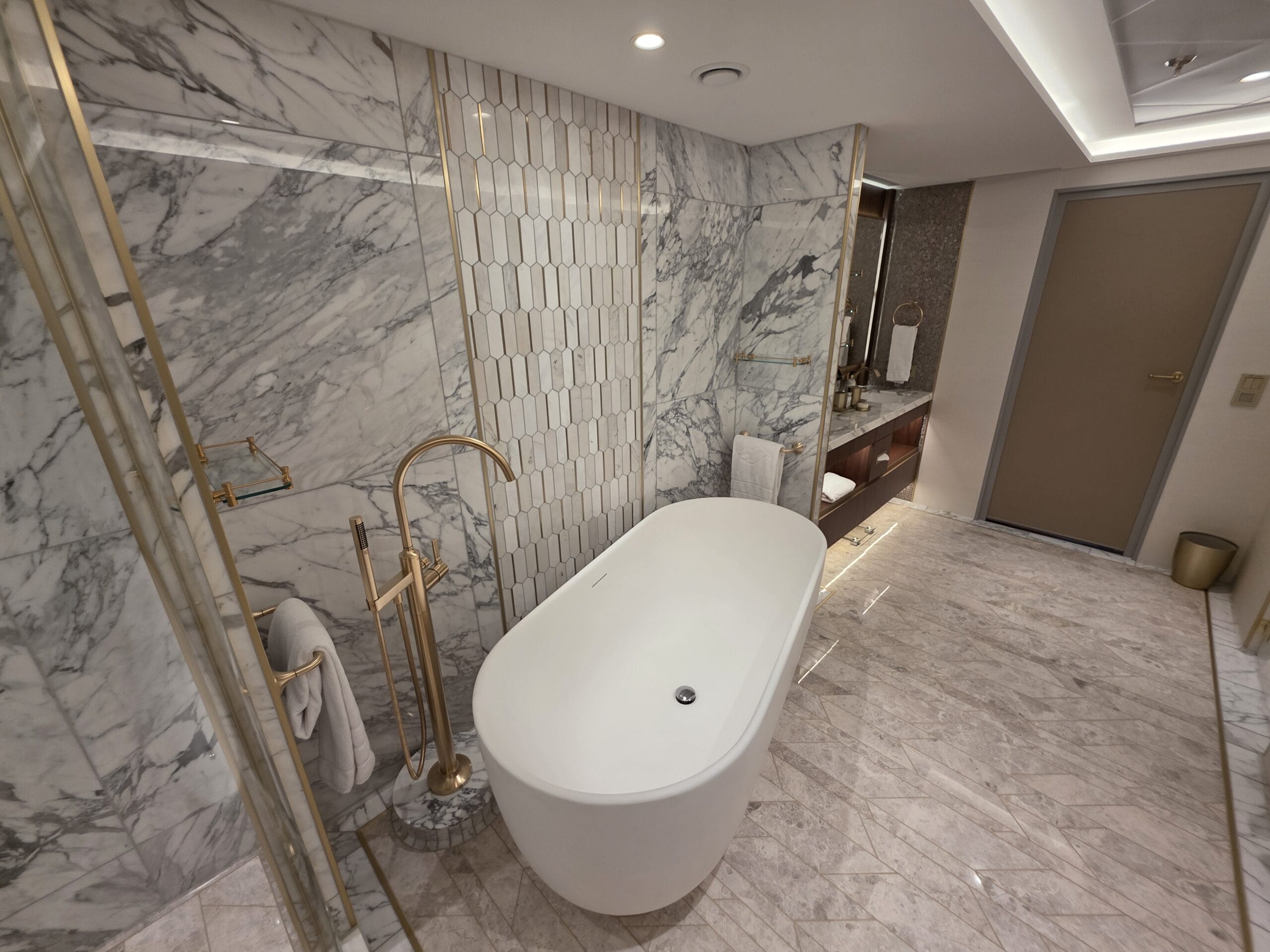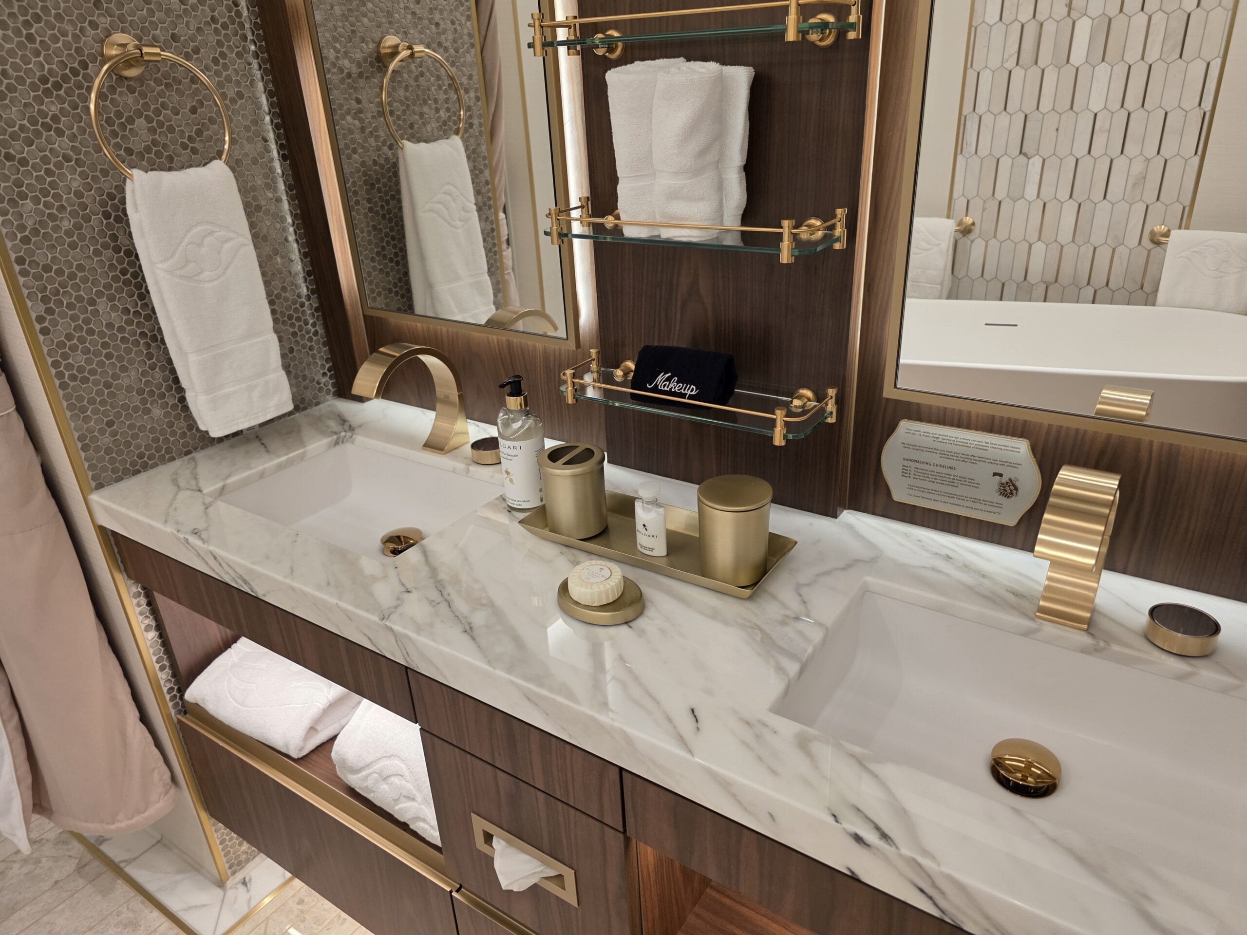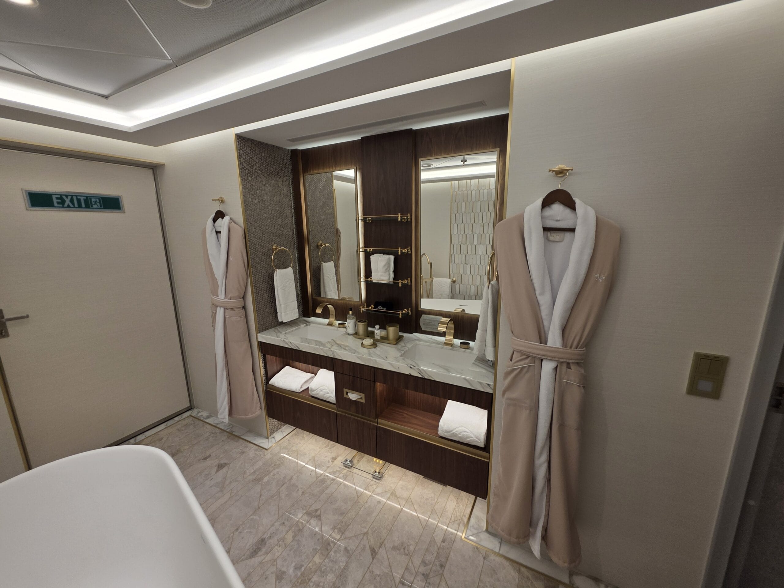 Because this is a Concierge Suite, guests booking this Tower Suite can expect down duvets, several pillow options, personal robes and slippers, complimentary access to Premium Surf Wi-Fi internet service, and exclusive access to dedicated areas on the ship, including the Concierge Lounge.