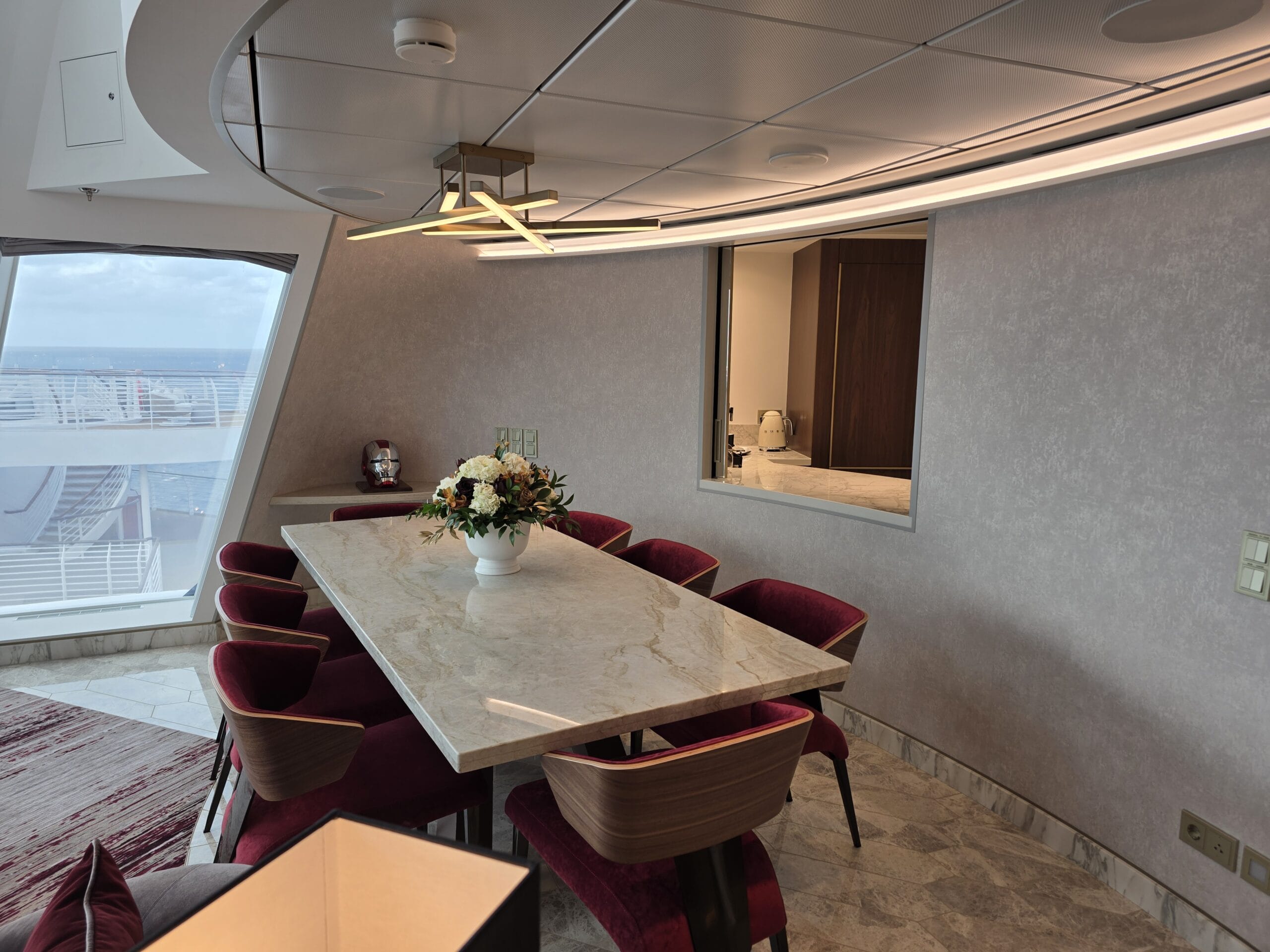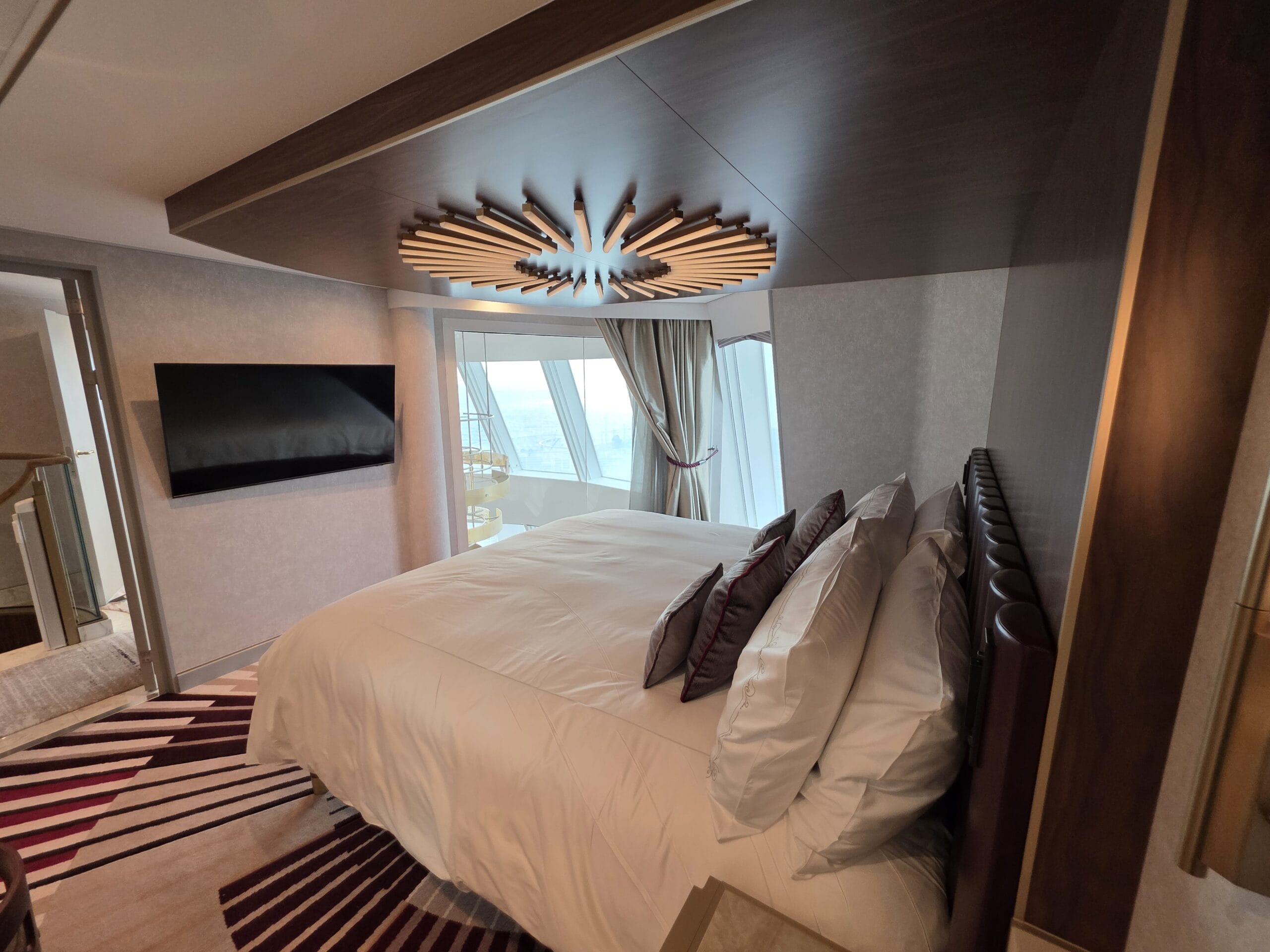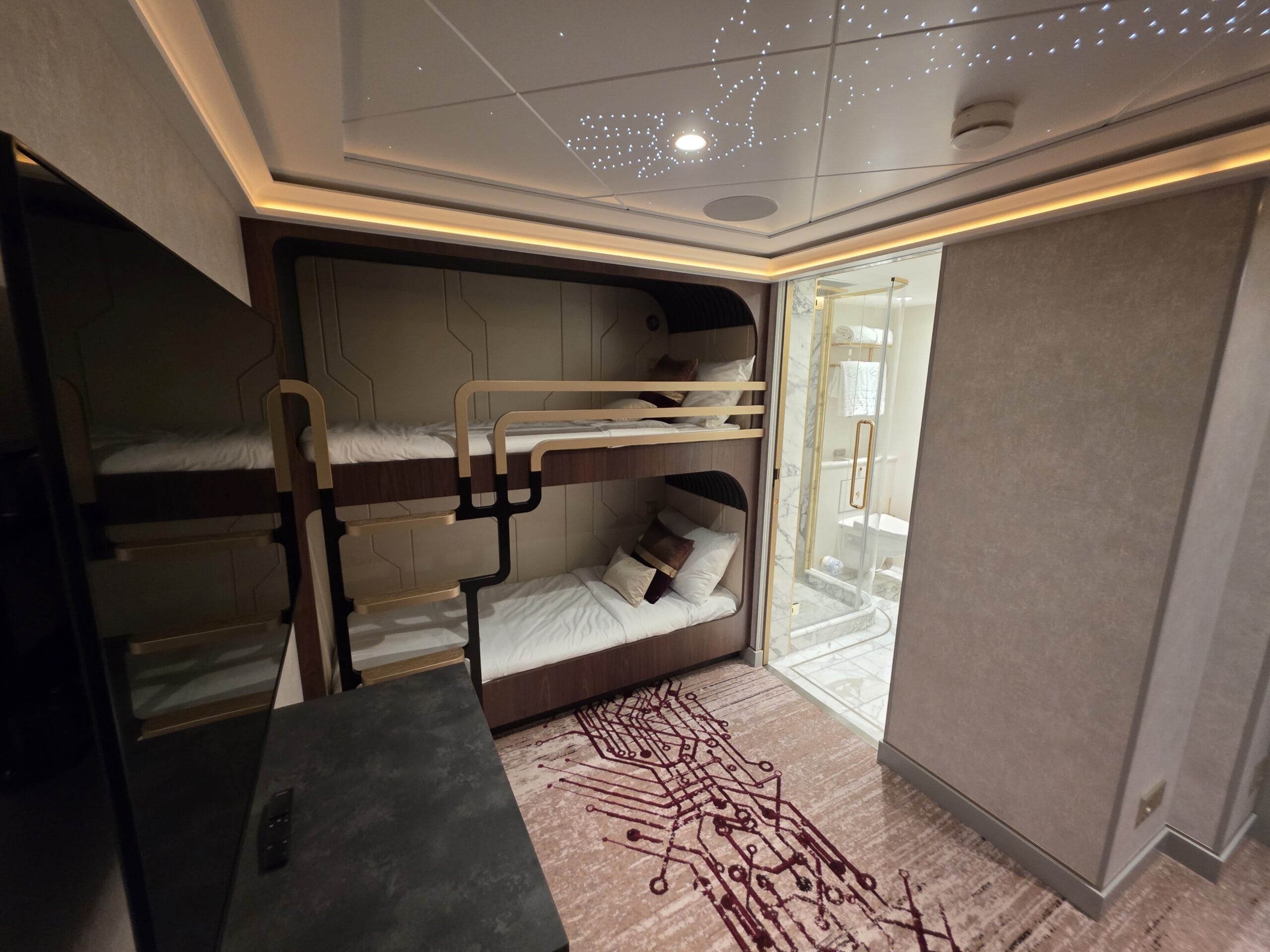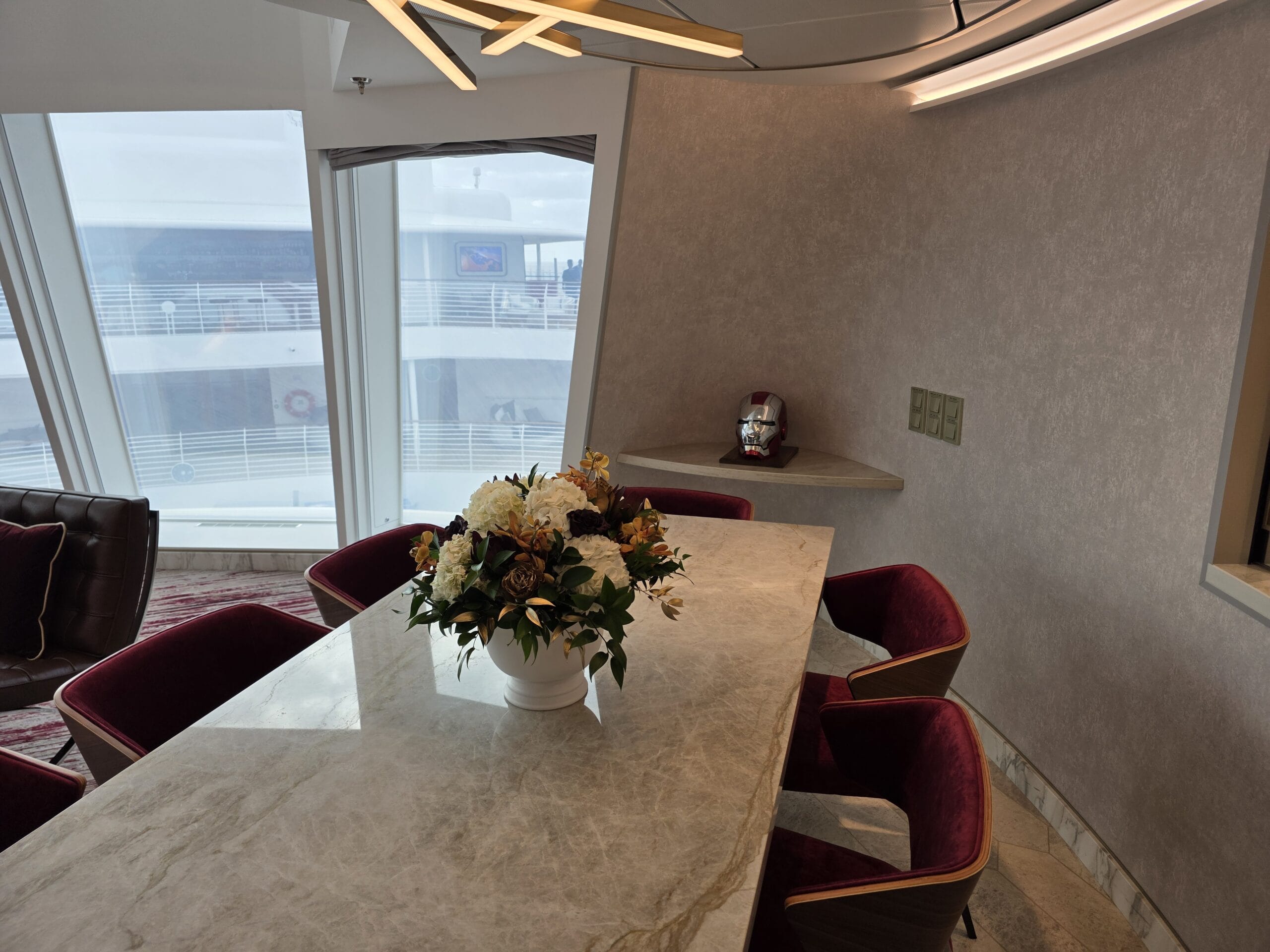 Experience the pinnacle of luxury in a 2-story suite perched high in the ship’s forward funnel above the upper decks. This Marvel-inspired penthouse at sea brings Tony Stark’s sleek, innovative style to life, offering you an exclusive retreat complete with your very own private elevator.