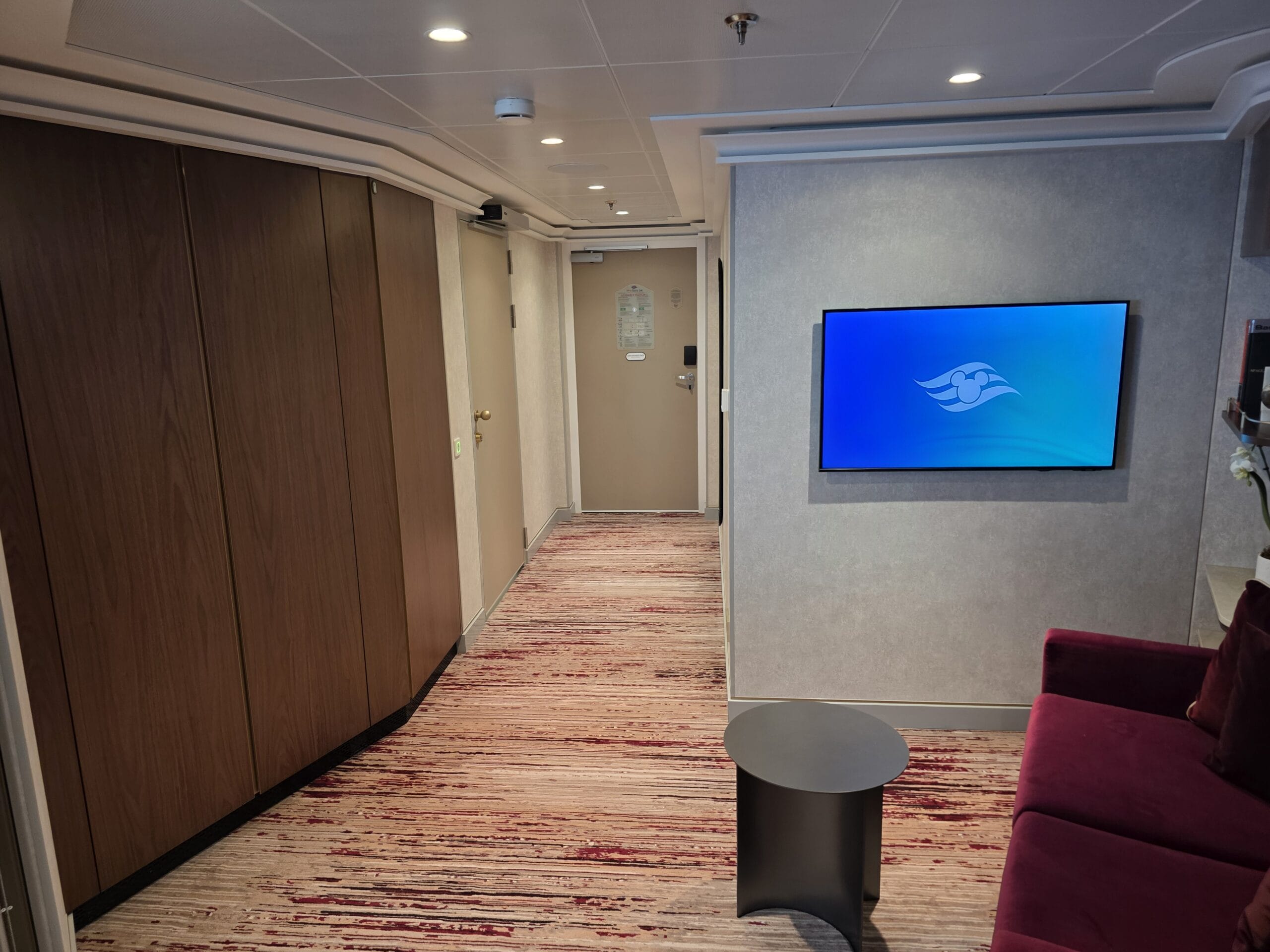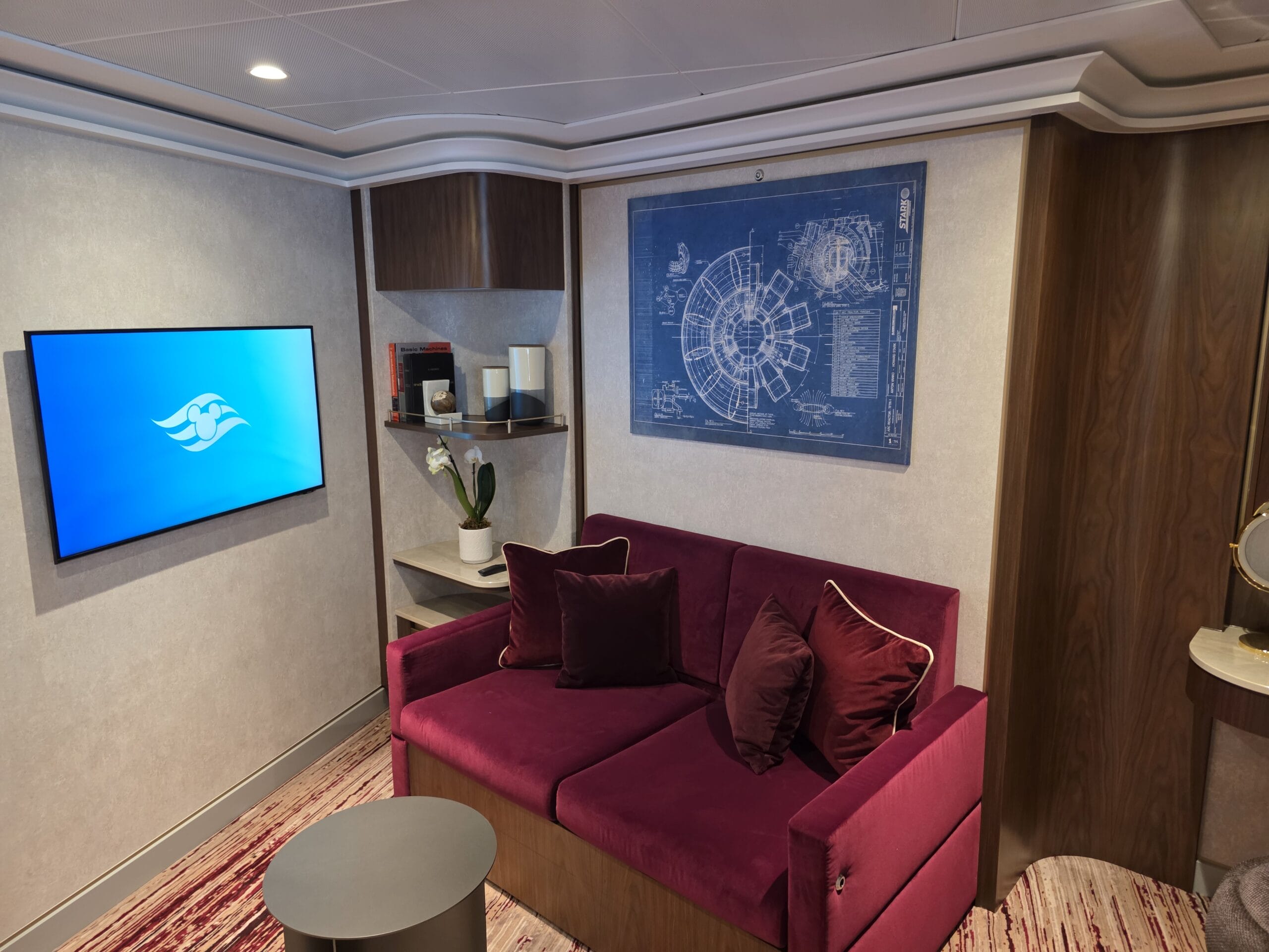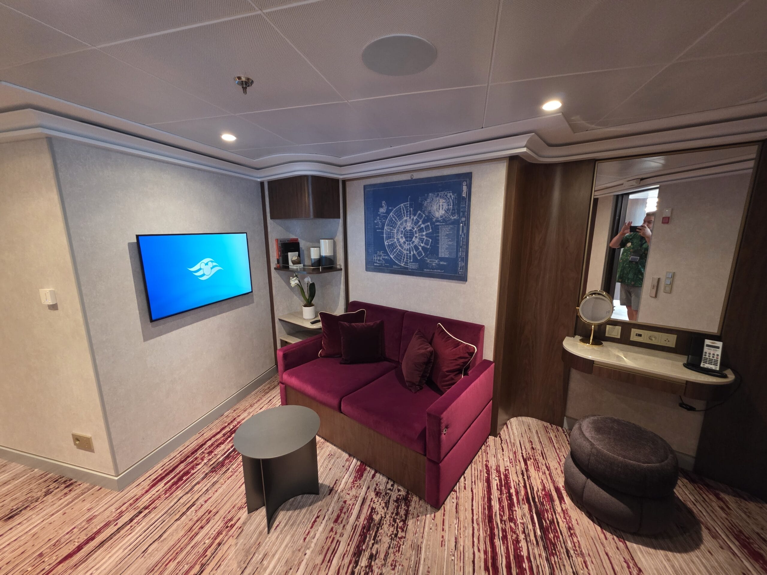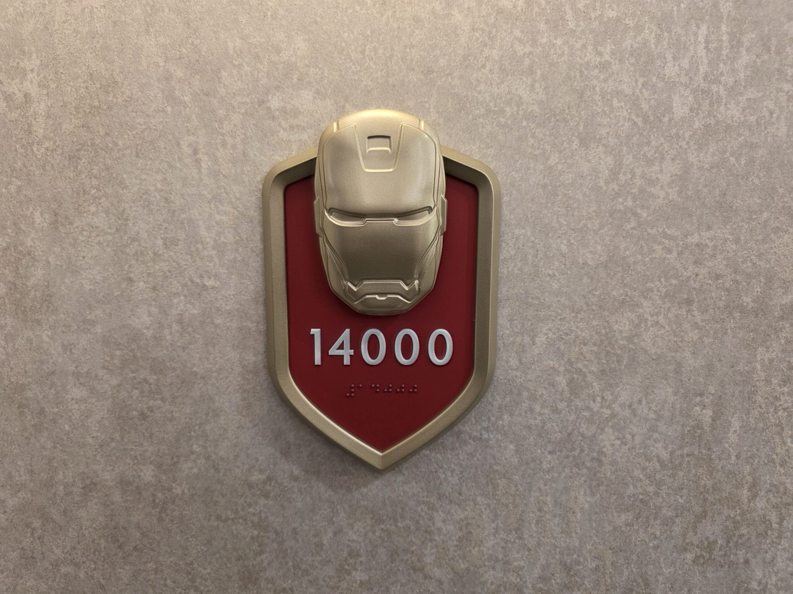 The Stateroom number outside the door is a red shield with a goldtone Iron Man mask. We toured Stateroom 14000, which is on Deck 14.