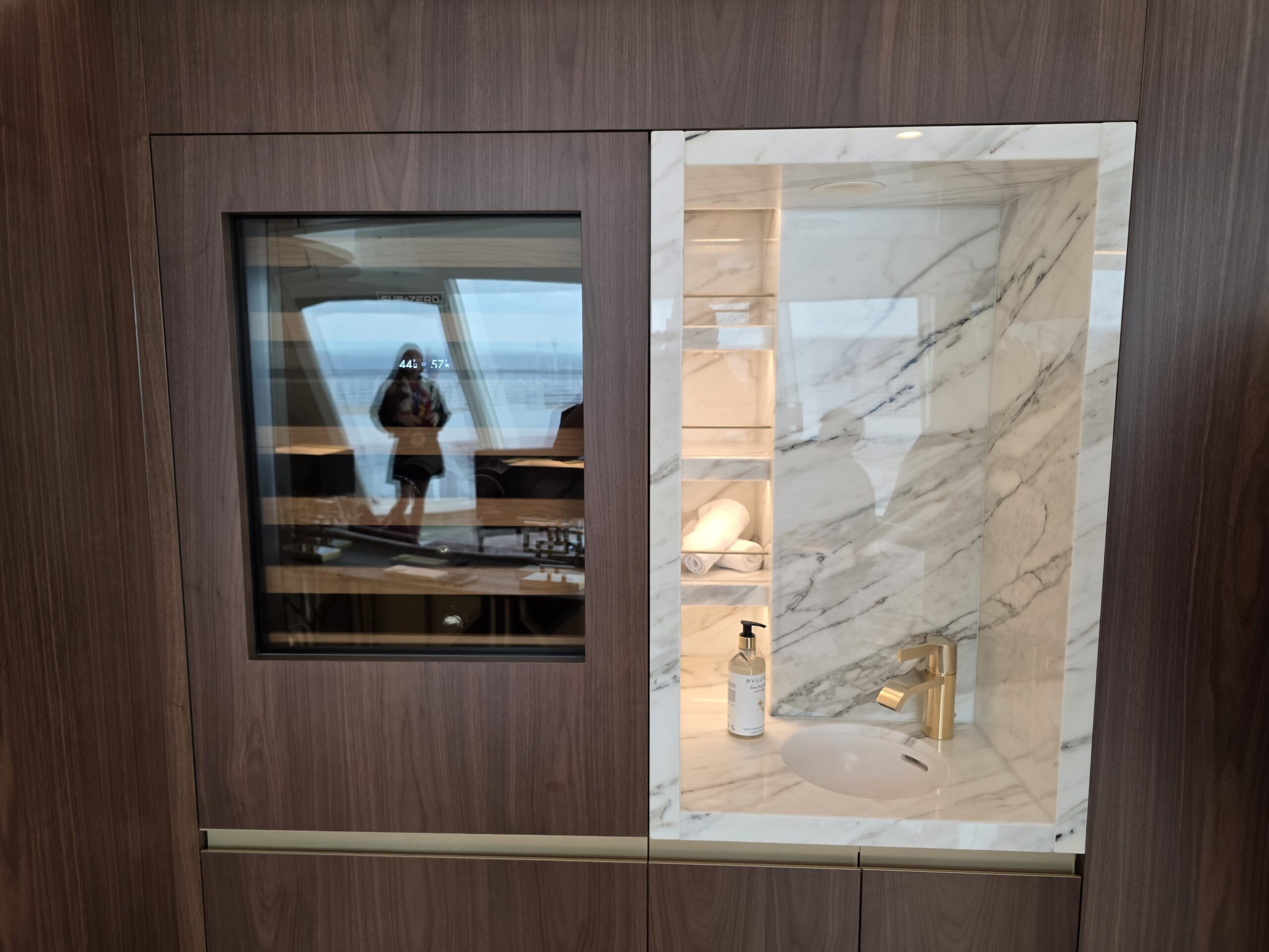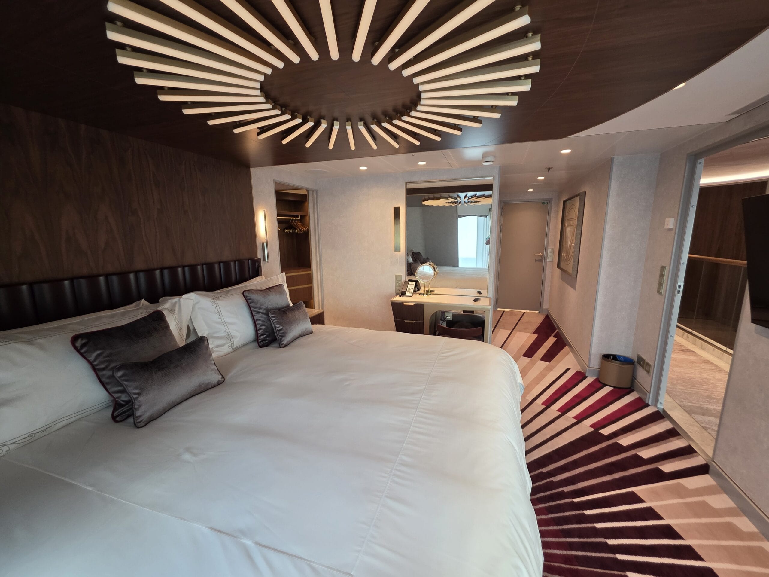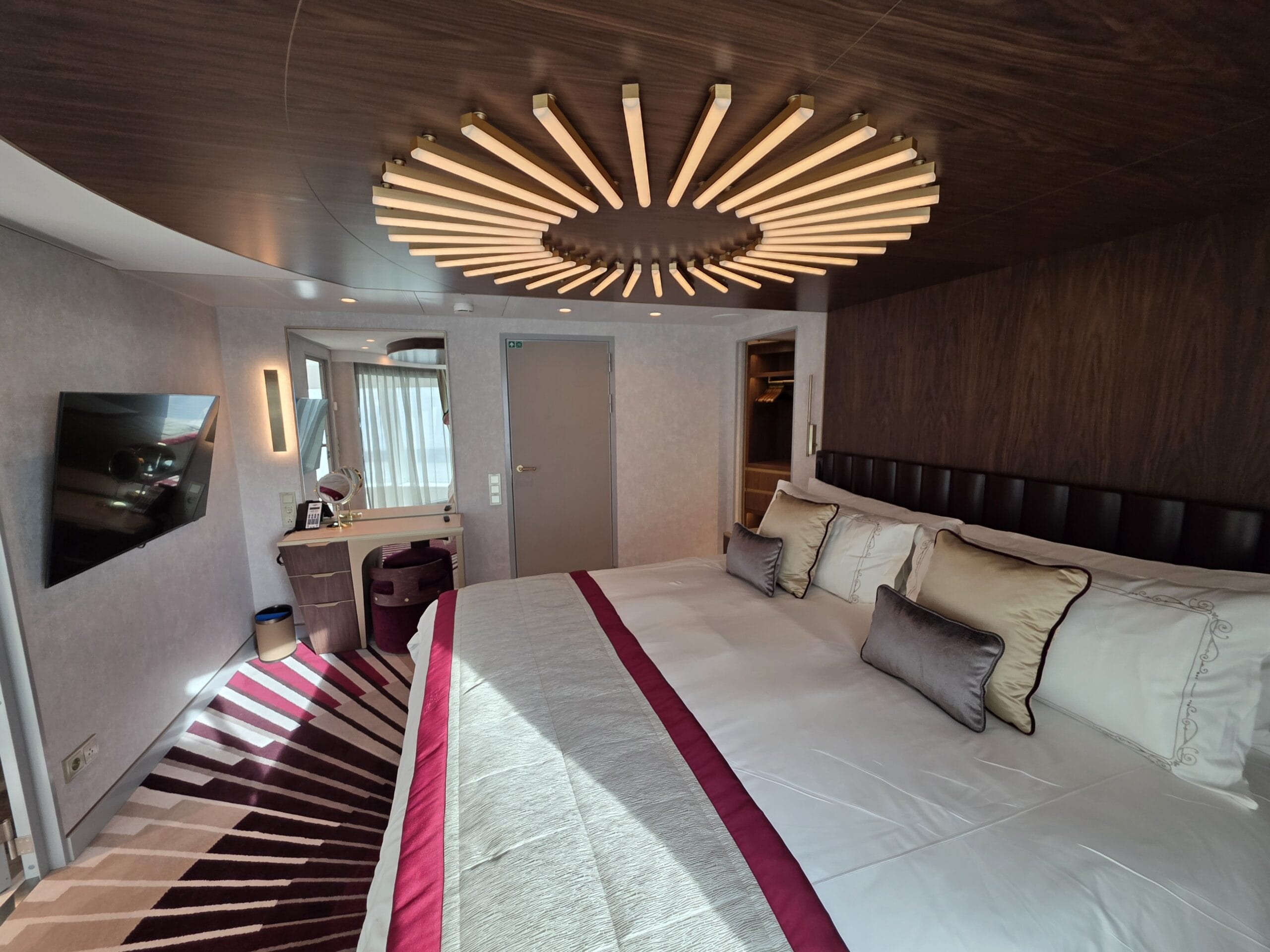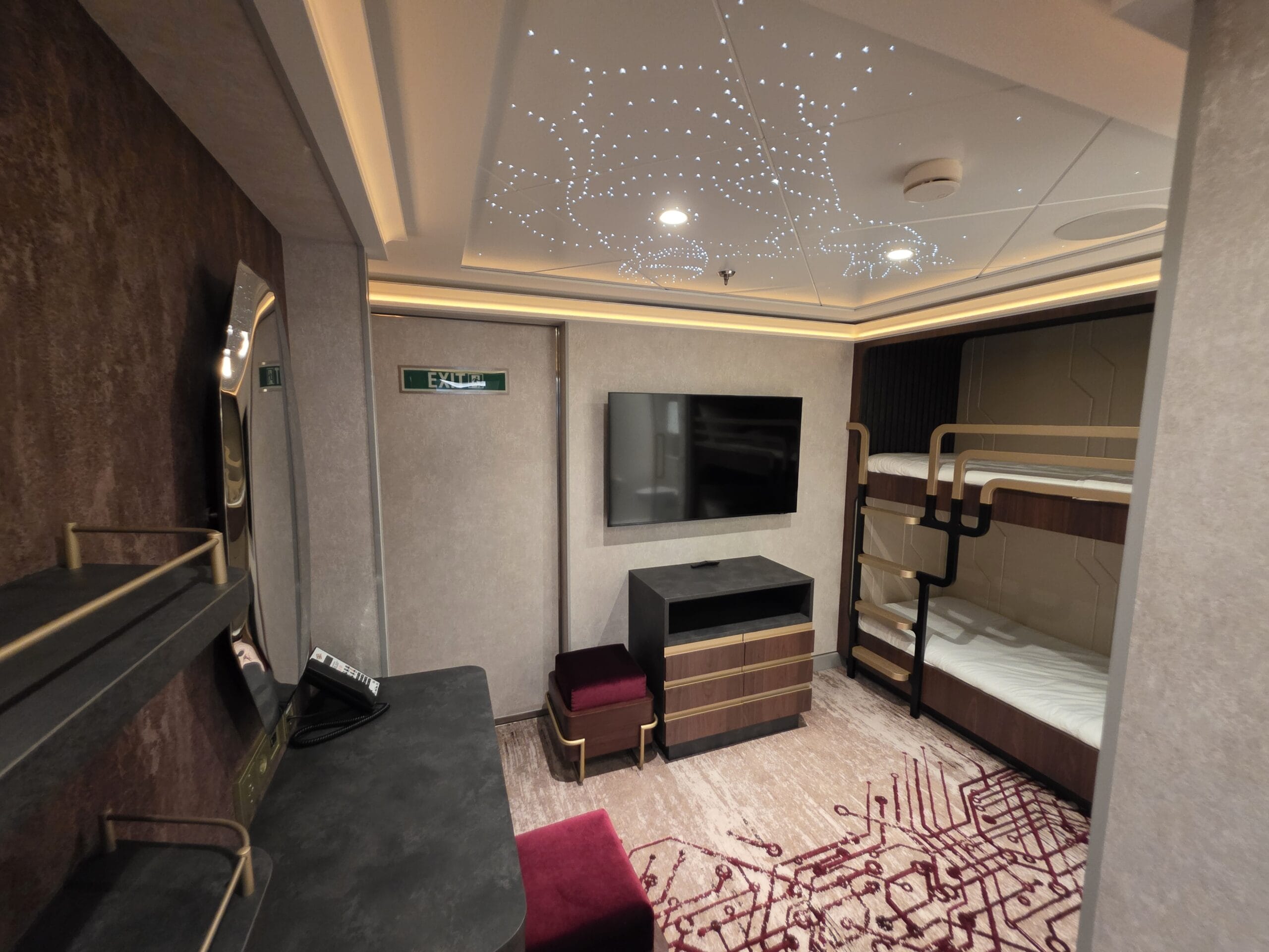 The Stateroom number outside the door is a red shield with a goldtone Iron Man mask. We toured Stateroom 14000, which is on Deck 14.