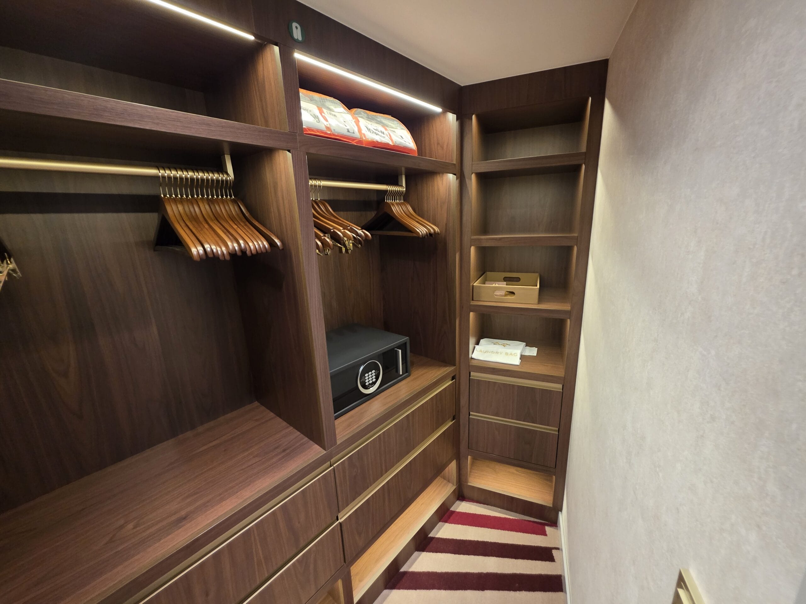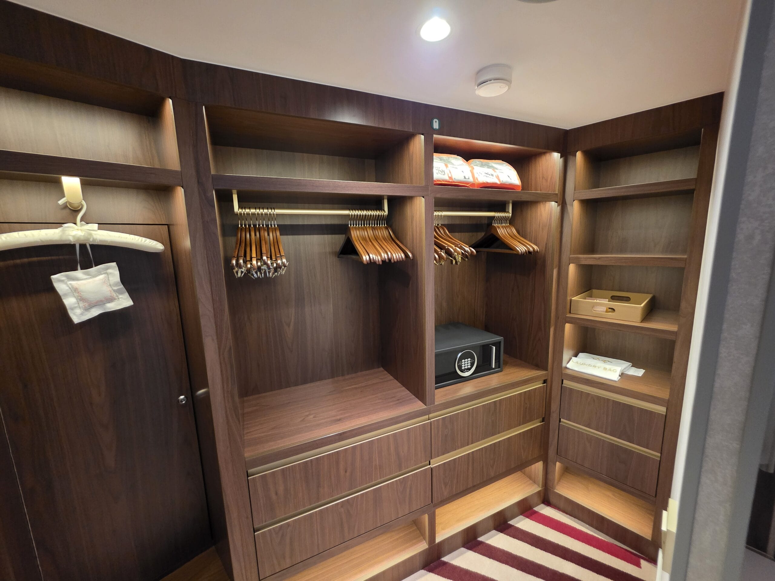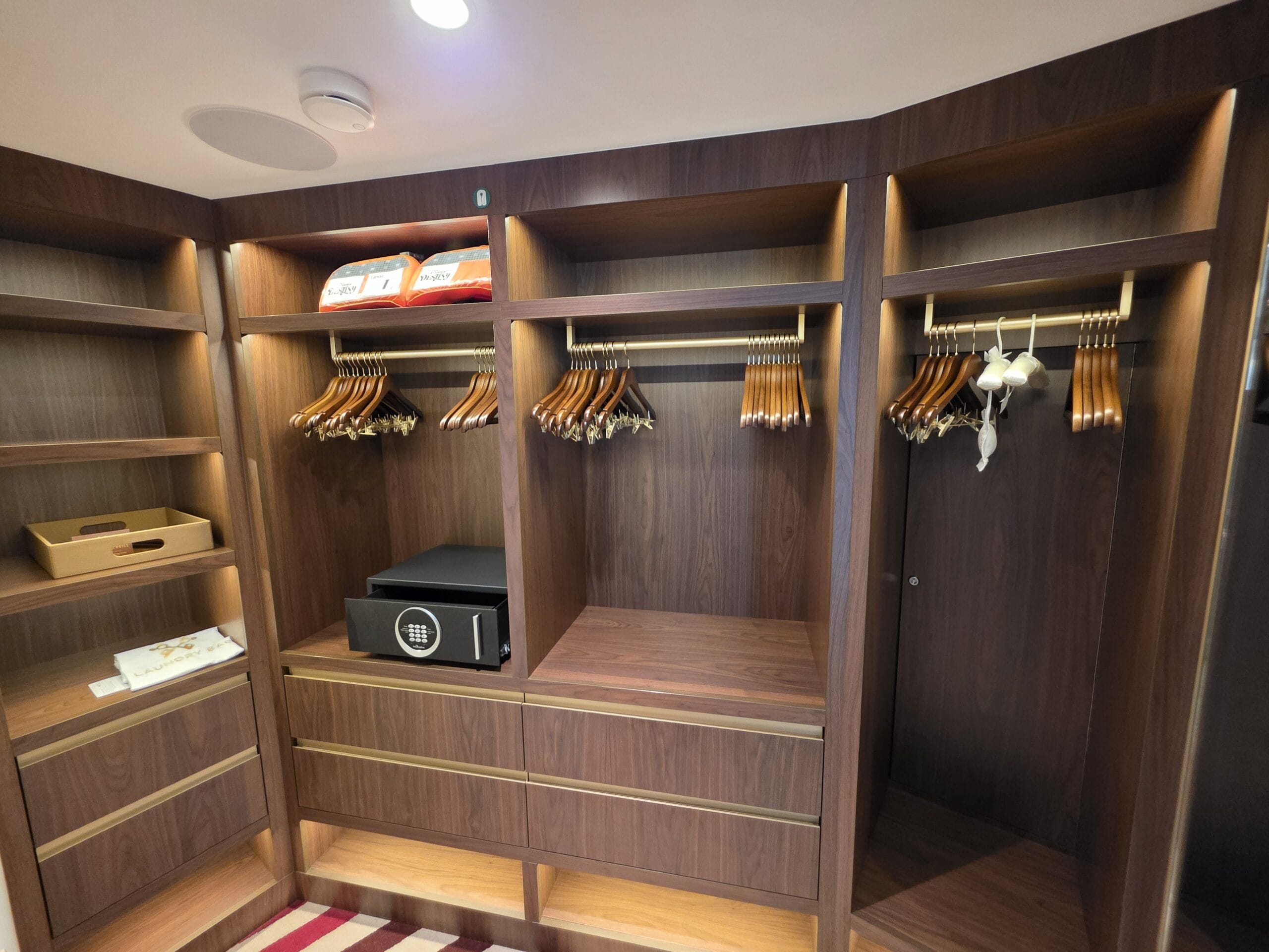 A large walk-in closet has shelves and cubbies, as well as hangers, a mini-safe, and emergency devices.
