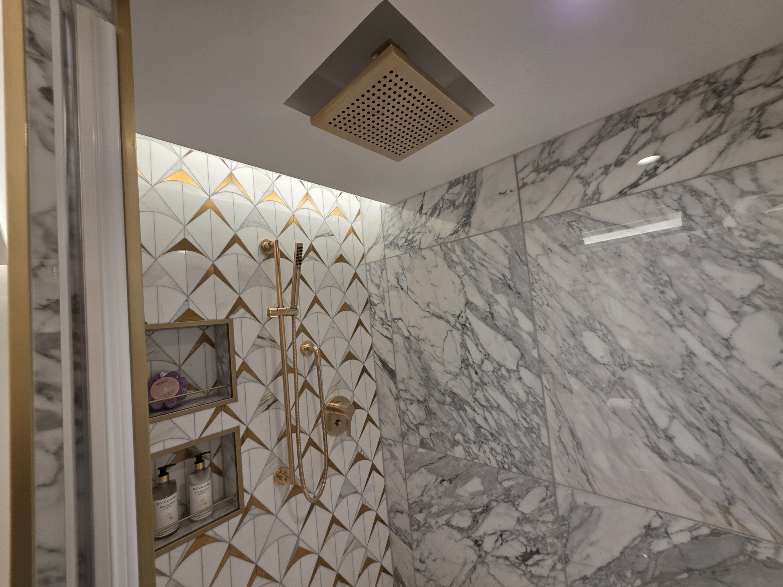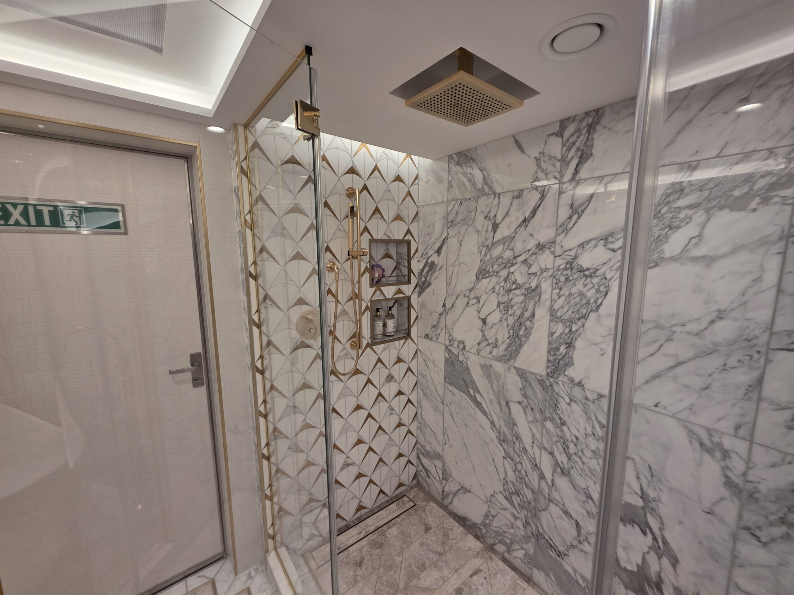 This walk-in shower also features a rainfall shower head and built-in shelves.
