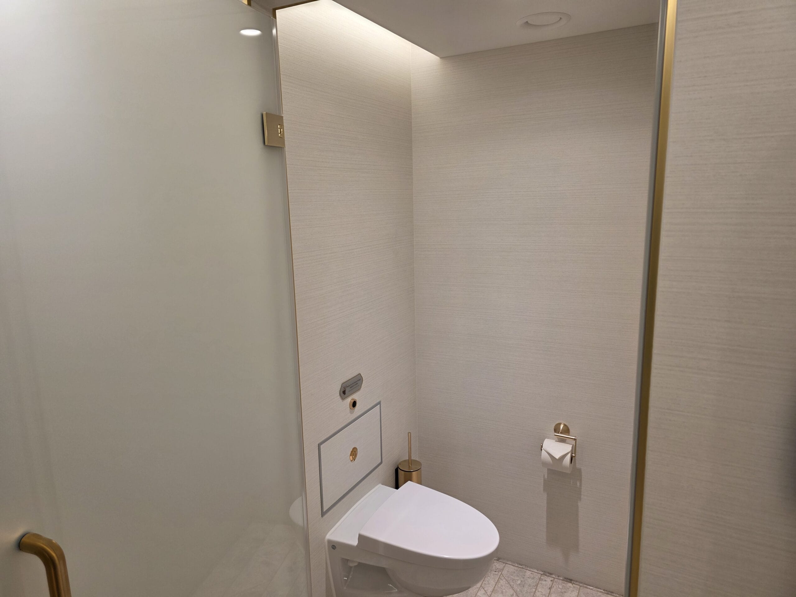 The separate toilet room includes a button to flush the toilet and a shelf for more storage.