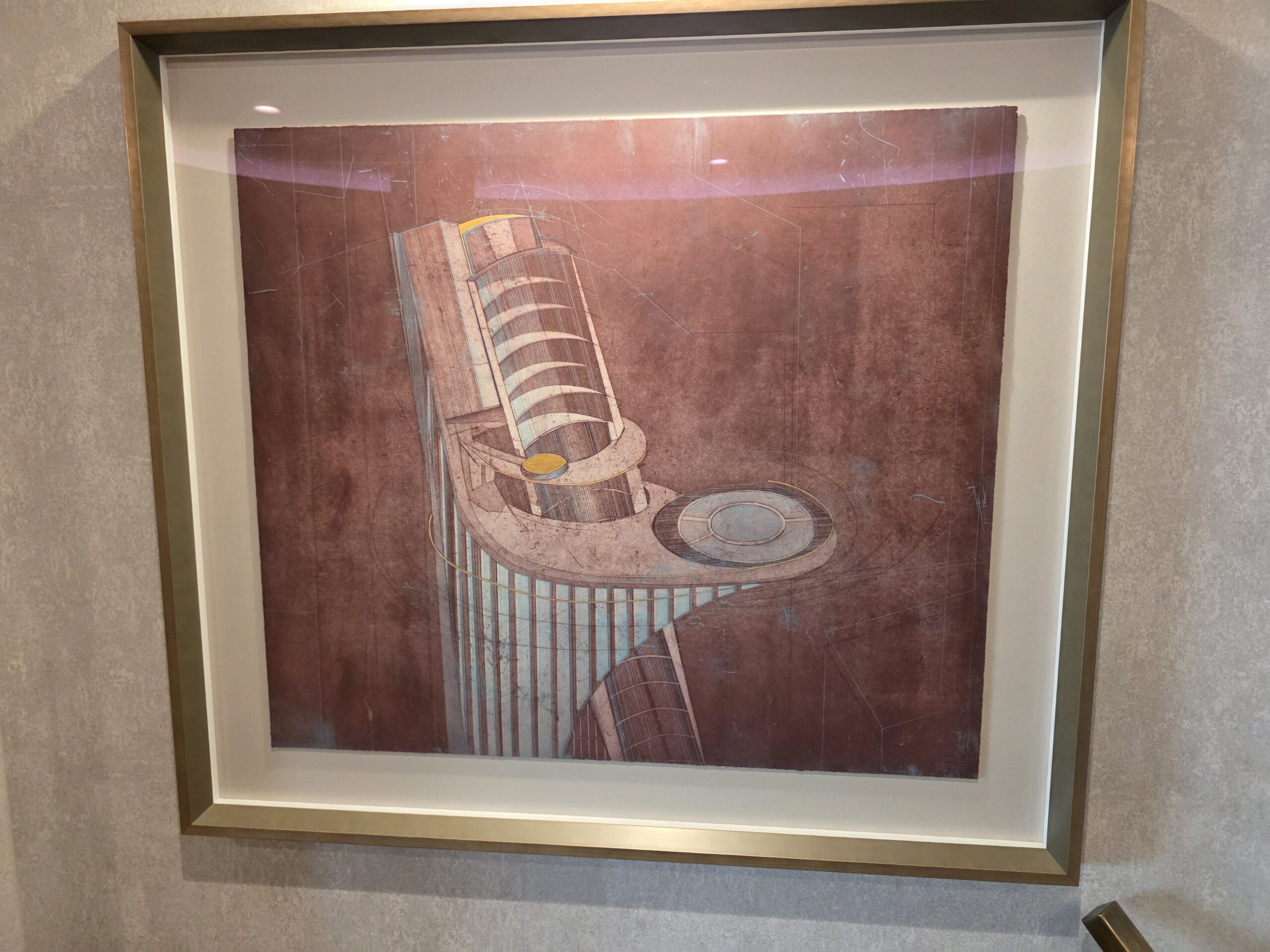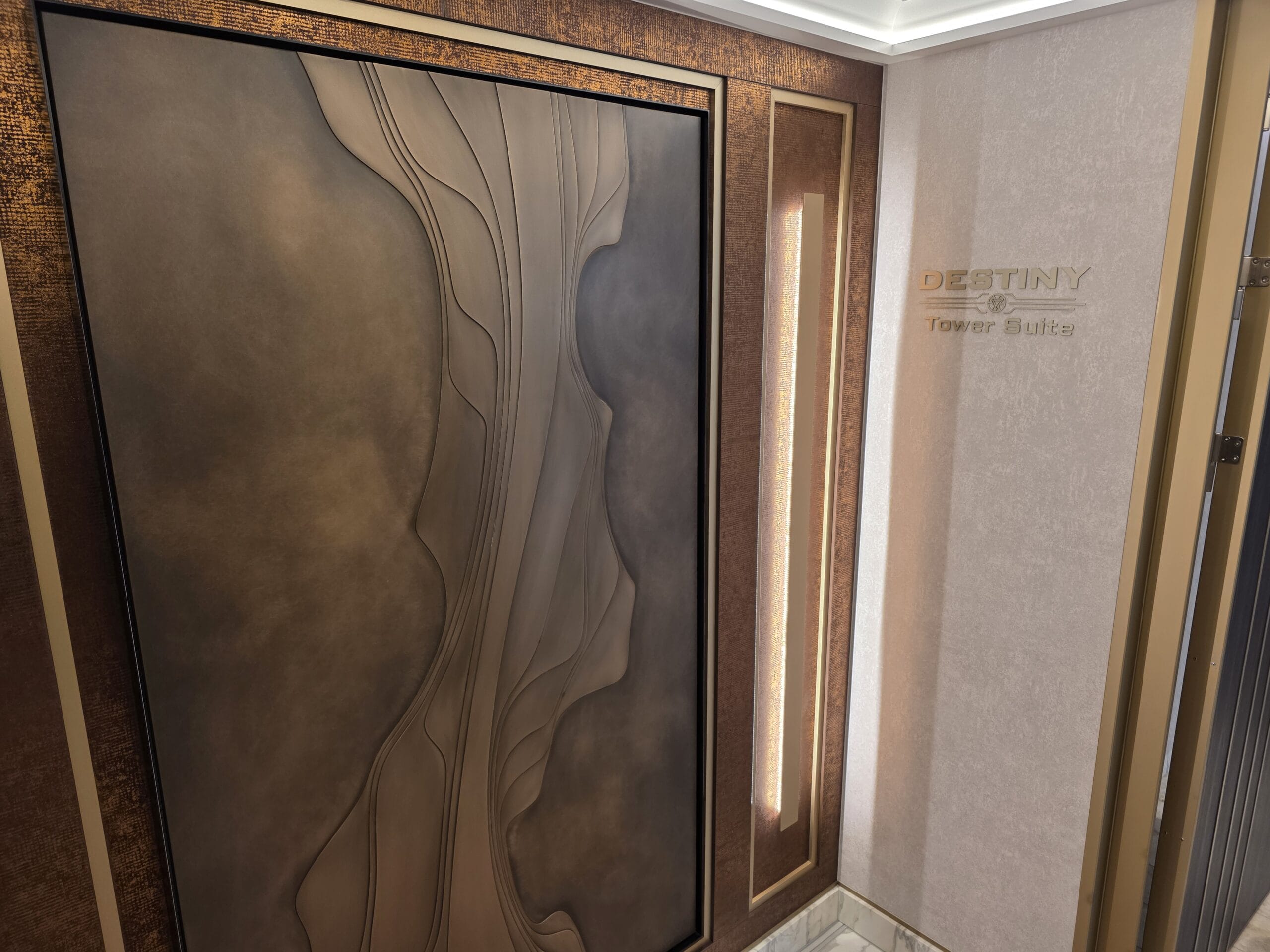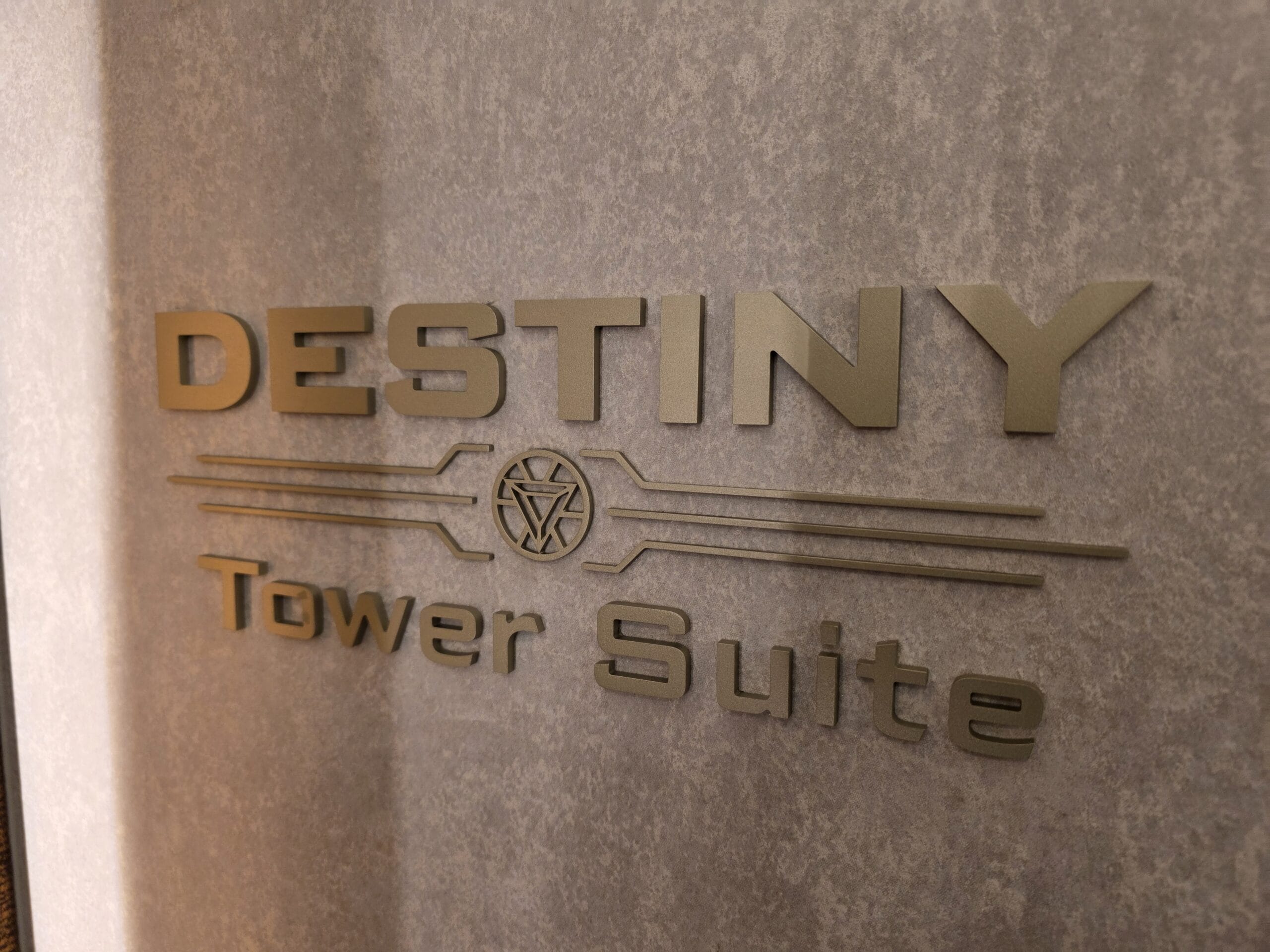 “Destiny Tower Suite” 3D text is on the wall, along with abstract artwork, right outside the entrance.