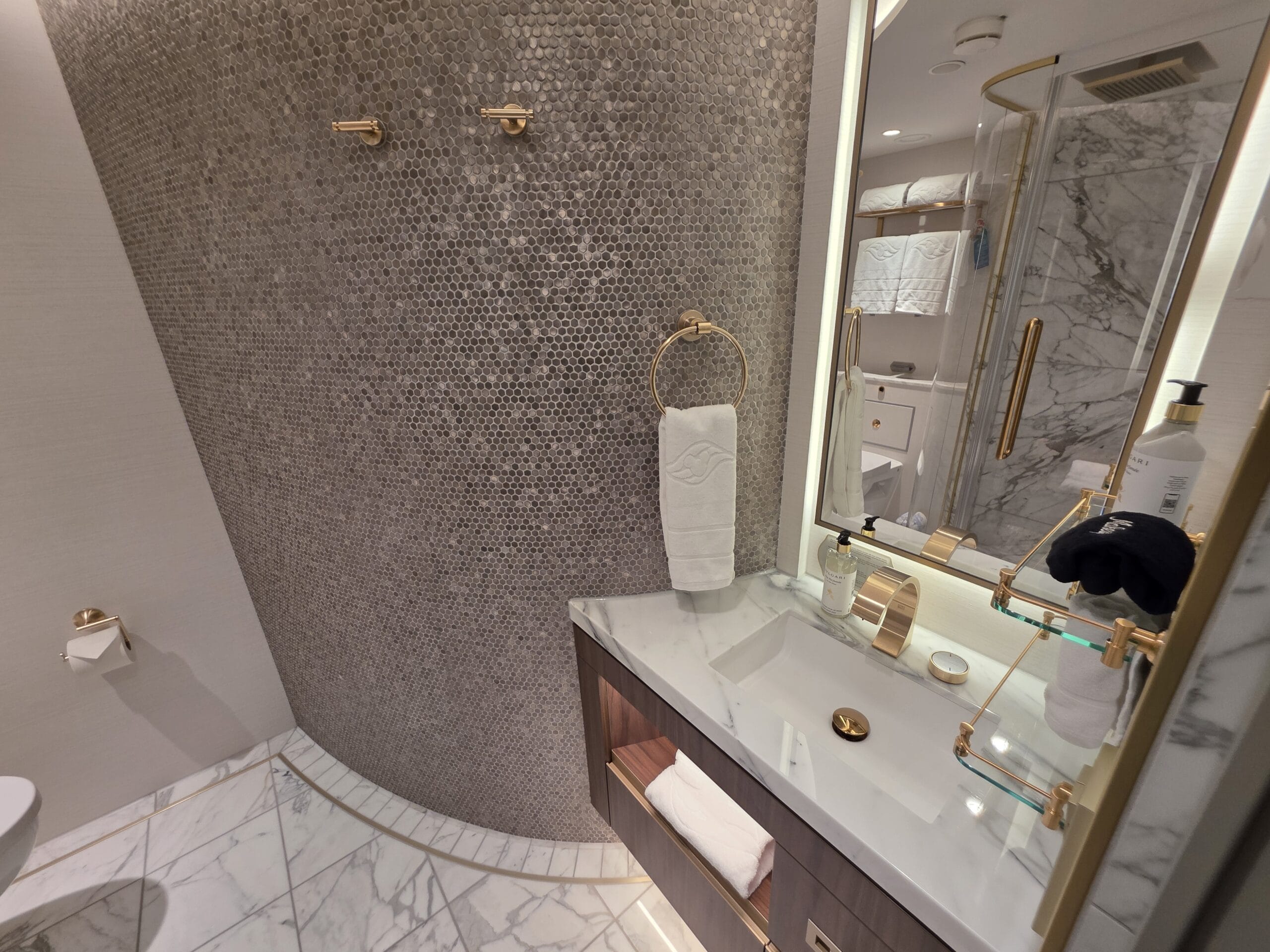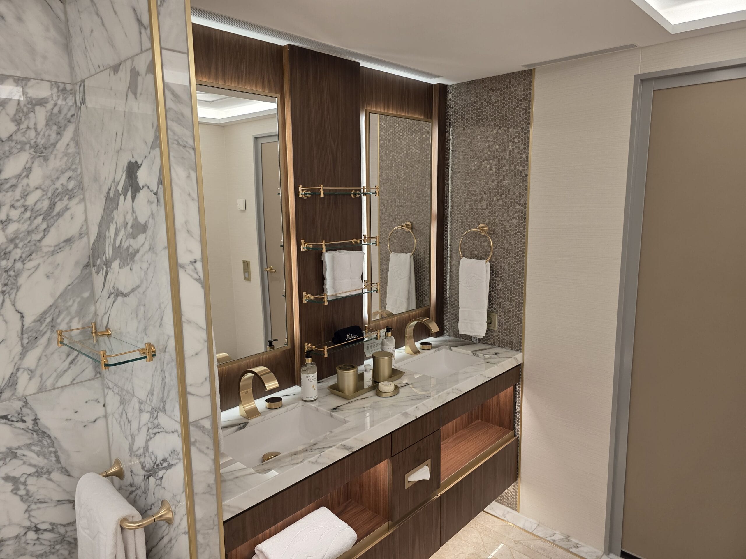 The wood paneling continues on the cabinets, and the countertops are a white and gray marble. There are brass accents on the faucets, shelves, and towel hooks.