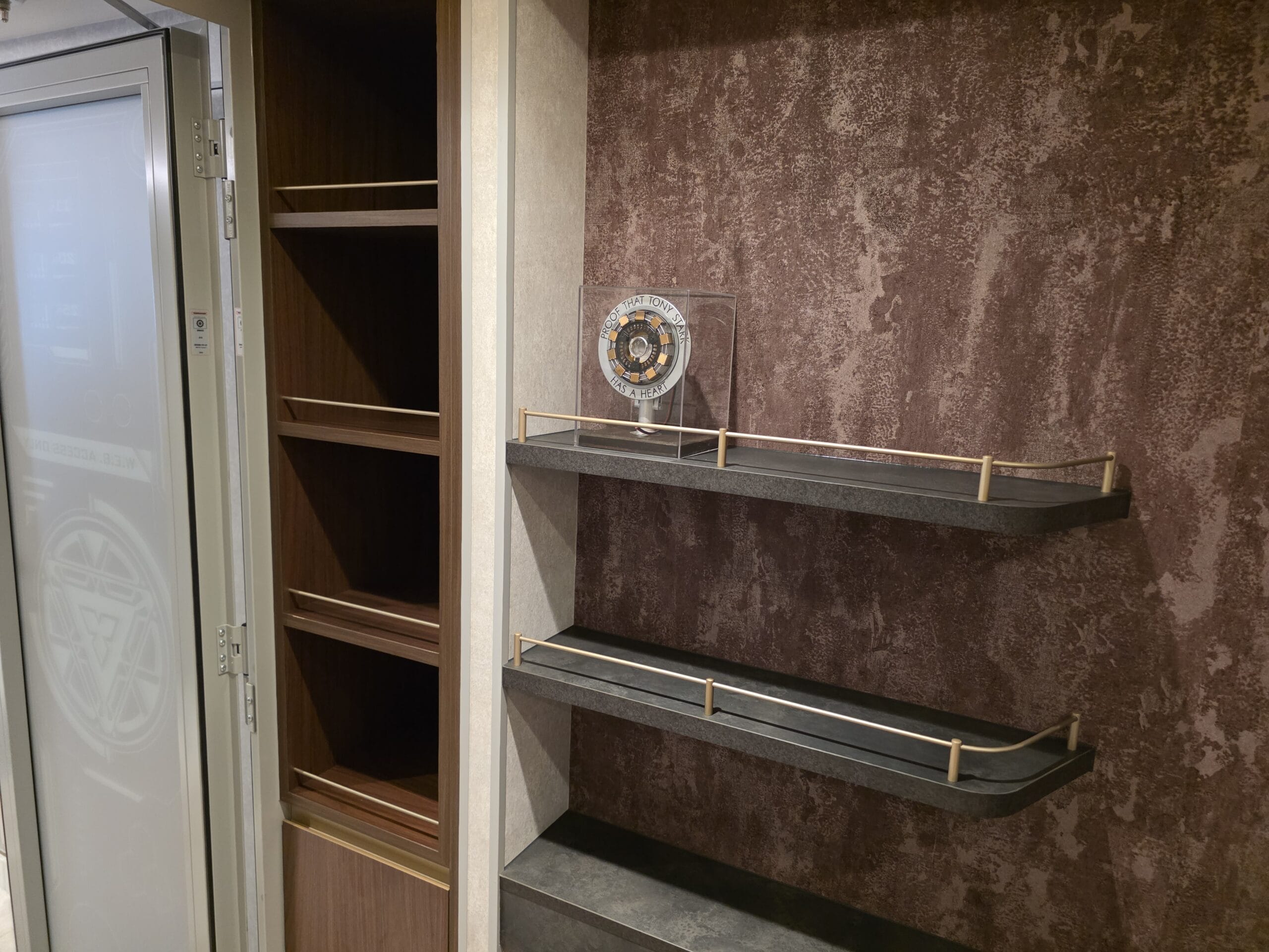 This room also includes shelves and cubbies for plenty of storage solutions. There is also a replica of the “Proof That Tony Stark Has A Heart” arc reactor in a display case.