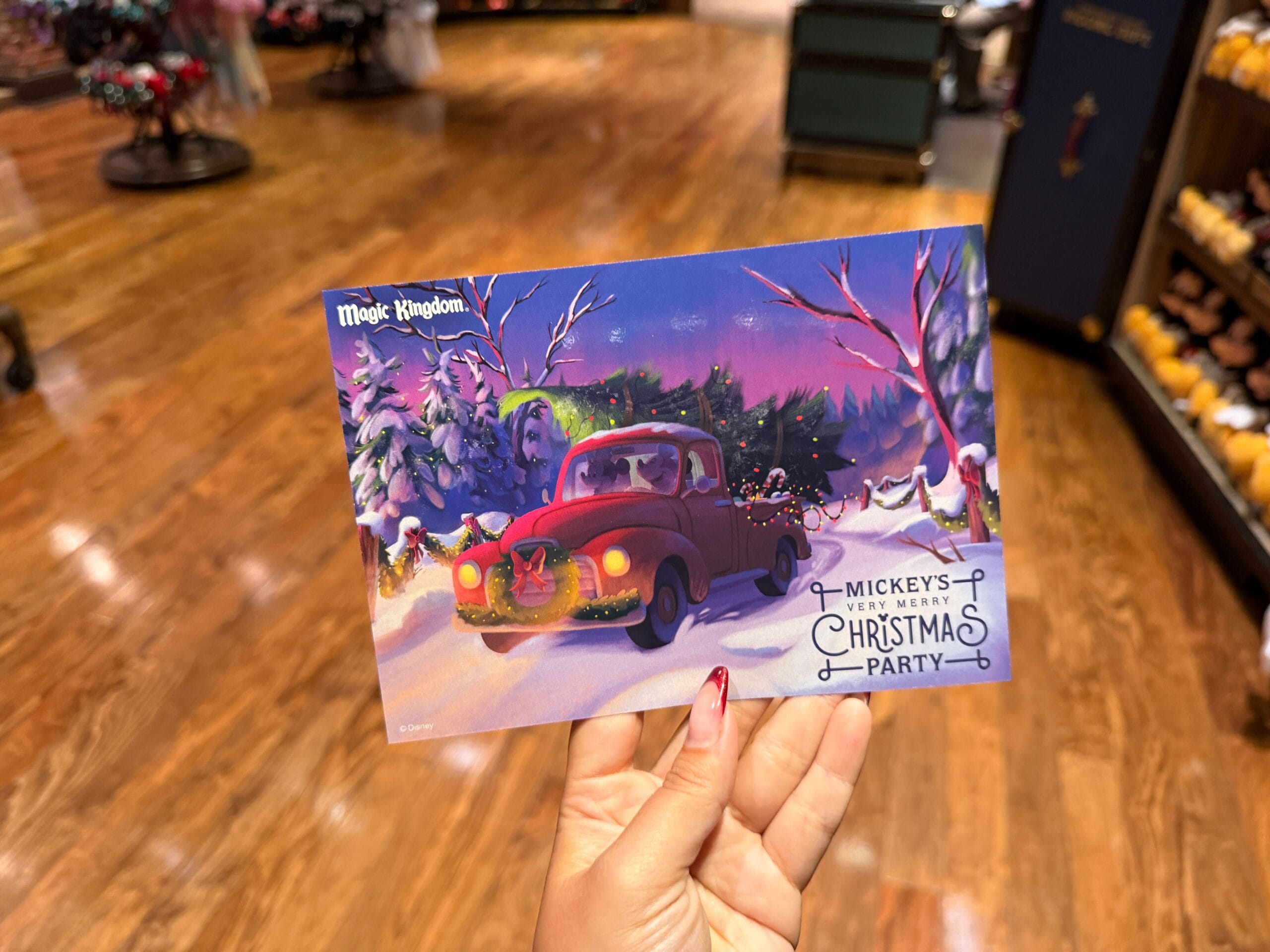 You also get a commemorative autograph card for the meet and greet. One side features an illustration of a red Christmas tree delivery truck with a wreath and garland on the front driving across a snowy landscape. Mickey and Minnie can be seen inside the cab through the windshield. The Magic Kingdom wordmark is in the upper left and the Mickey’s Very Merry Christmas Party logo is in the lower right corner.