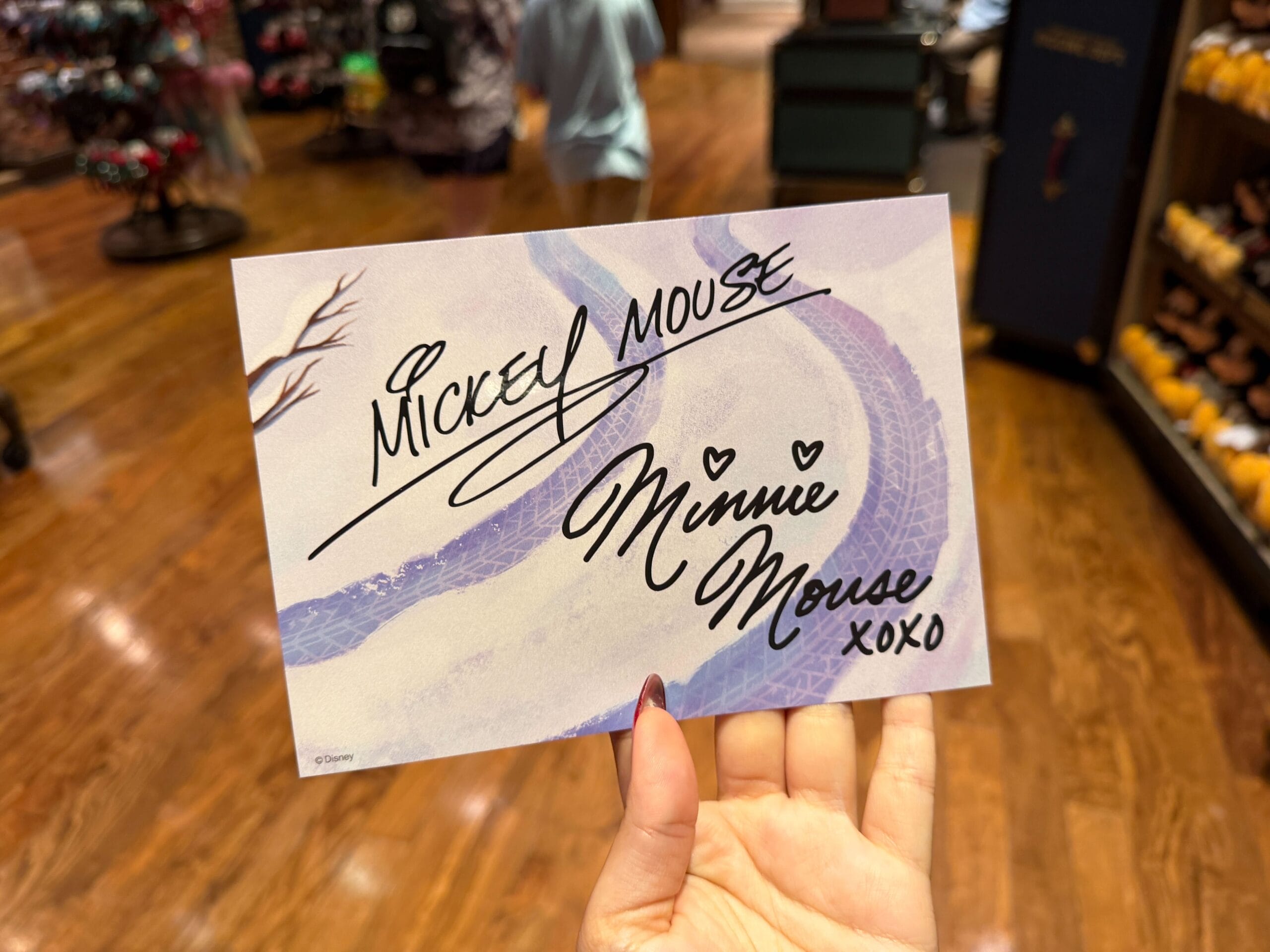 The flip side shows tire tracks in the show with Mickey’s and Minnie’s signatures.