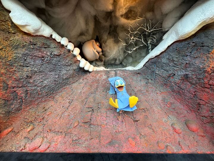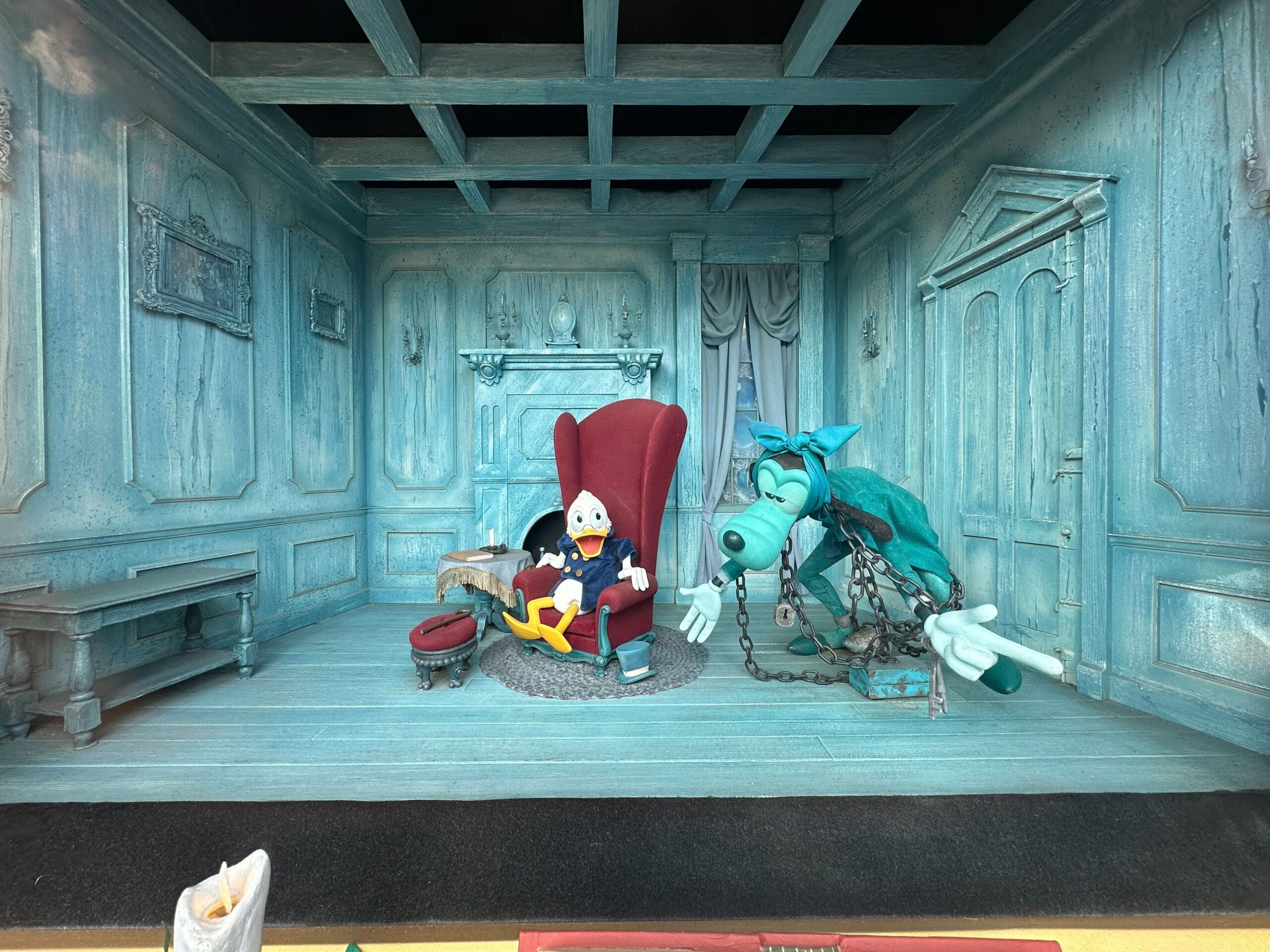 One scene depicts the opening of the film, with a disgrunted Ebenezer Scrooge, played by Scrooge McDuck, being visited by his nephew, Fred, played by Donald Duck. Working at the desk across from Scrooge is Bob Cratchit, played by Mickey Mouse.