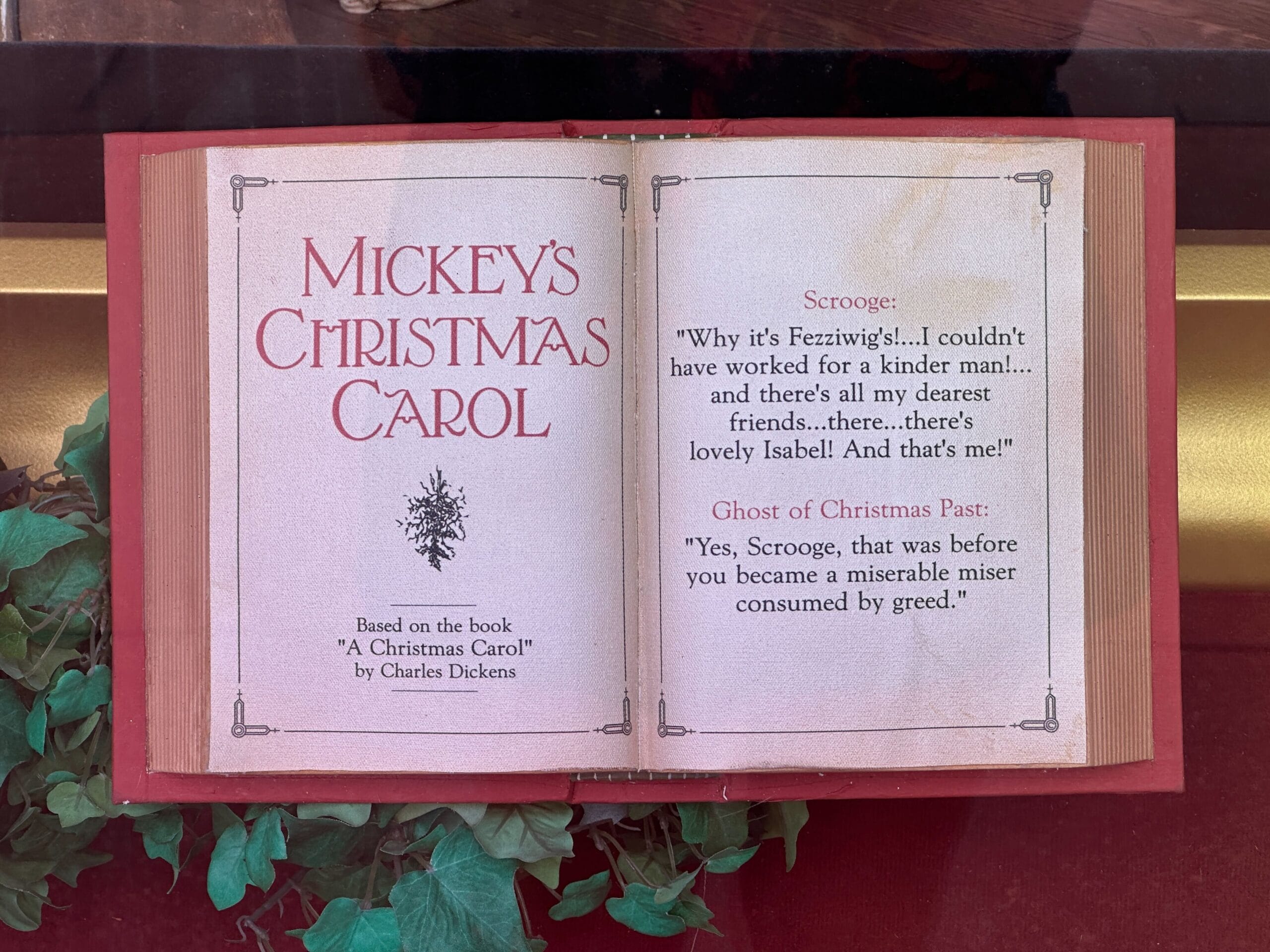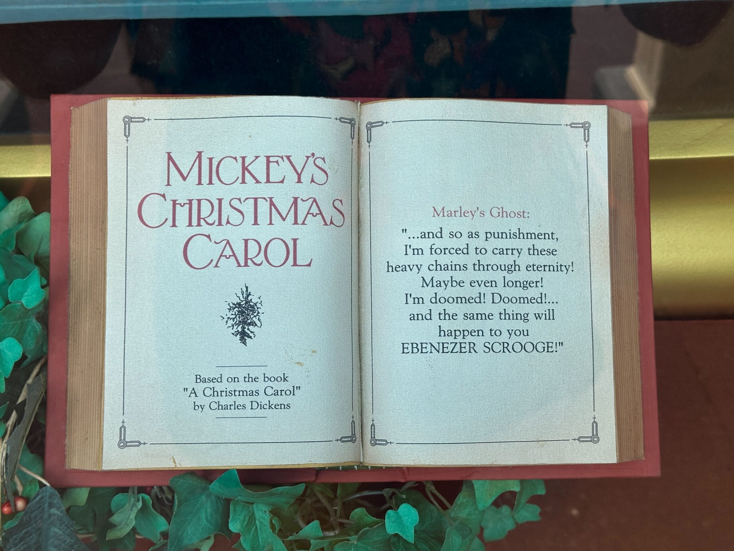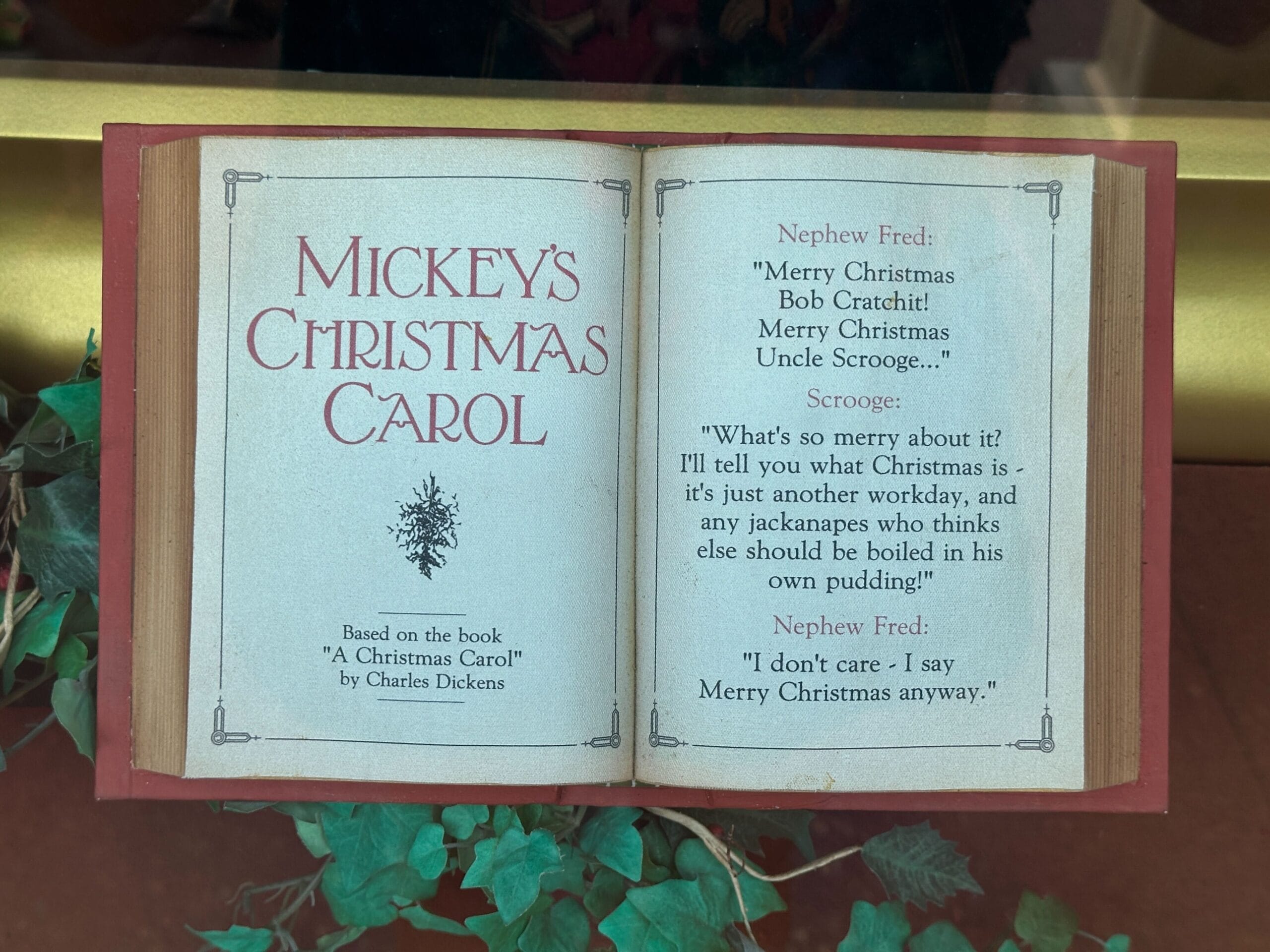 Each of the six windows feature dioramas with three-dimensional figures and decorations recreating scenes from the animated film. Below the scenes are open books with the left page reading Mickey’s Christmas Carol and the right side featuring a quote from the film relevant to the scene depicted.