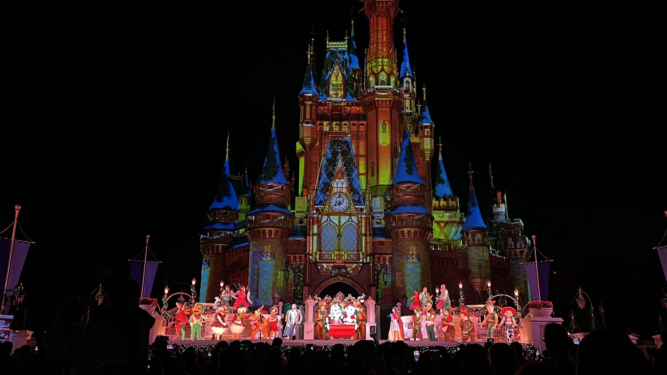 As part of the separately ticketed holiday event, the show is performed four times per night at 7:40 p.m., 9:25 p.m., 10:35 p.m., and 11:55 p.m. at the Cinderella Castle stage.