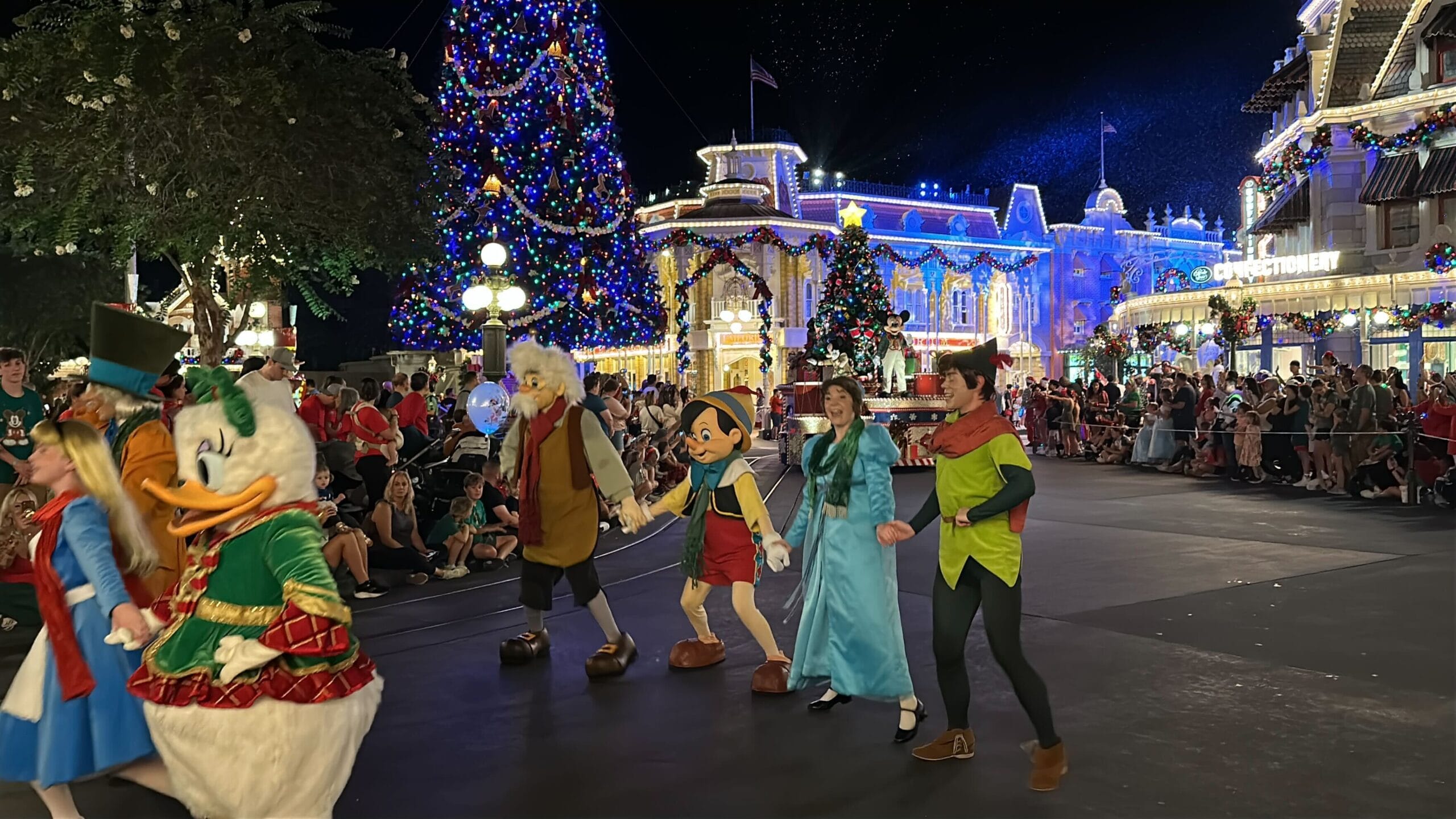 The parade kicks off with a host of characters. Peter Pan, Pluto, Tigger, Alice, Pinocchio, Donald, Daisy, and more dance around. Many of them are in extra winter apparel like cozy scarves.