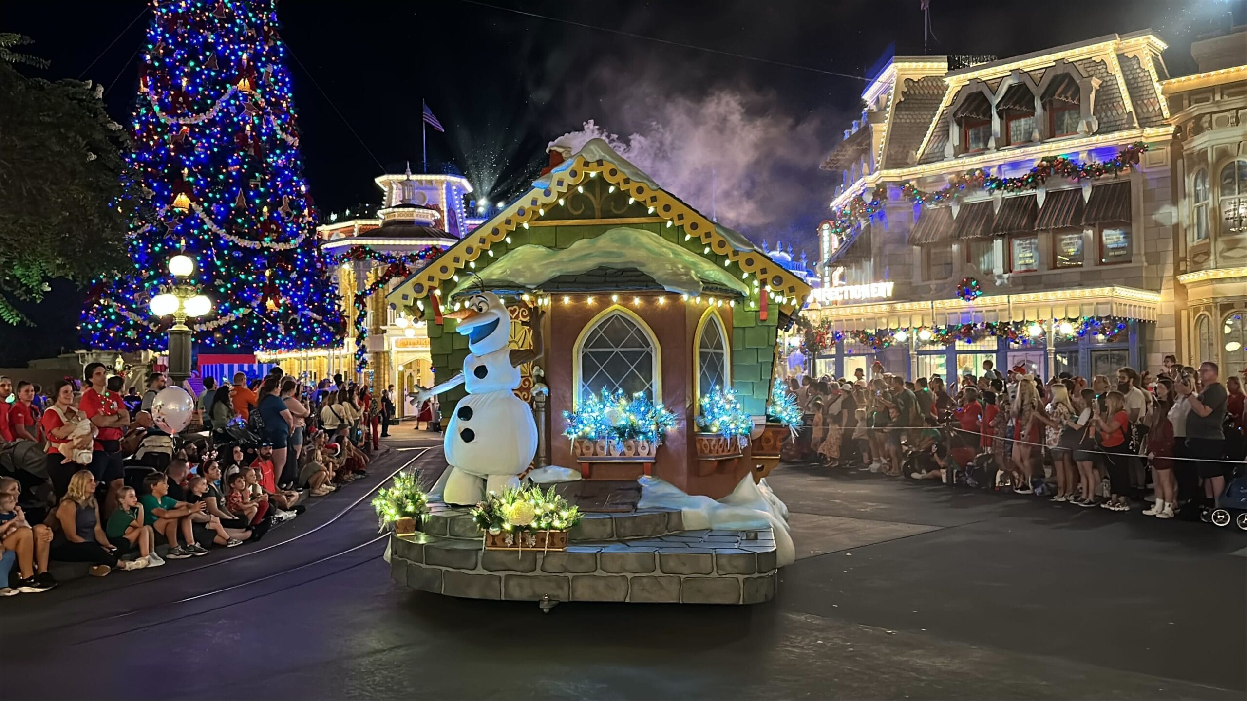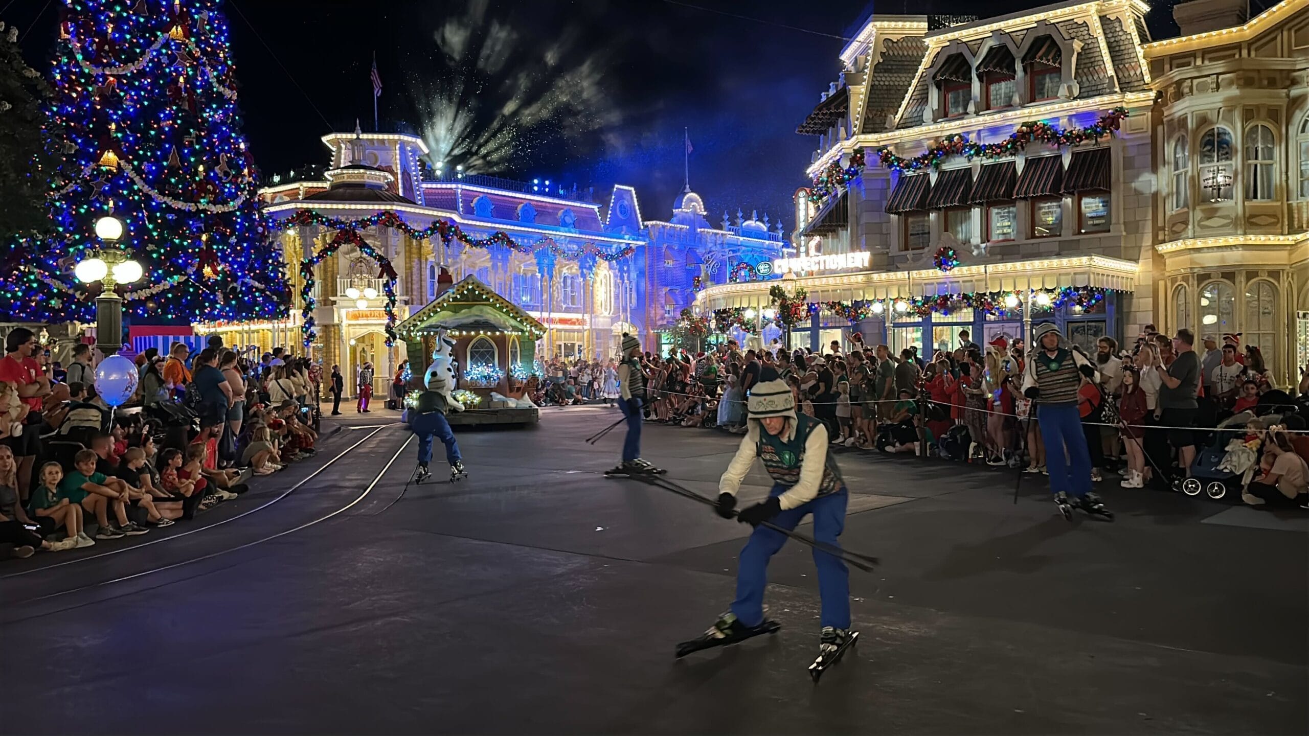 The cast of “Frozen” is close behind, starting with Olaf on a Nordic-style house float. He’s accompanied by cross-country skiing dancers.