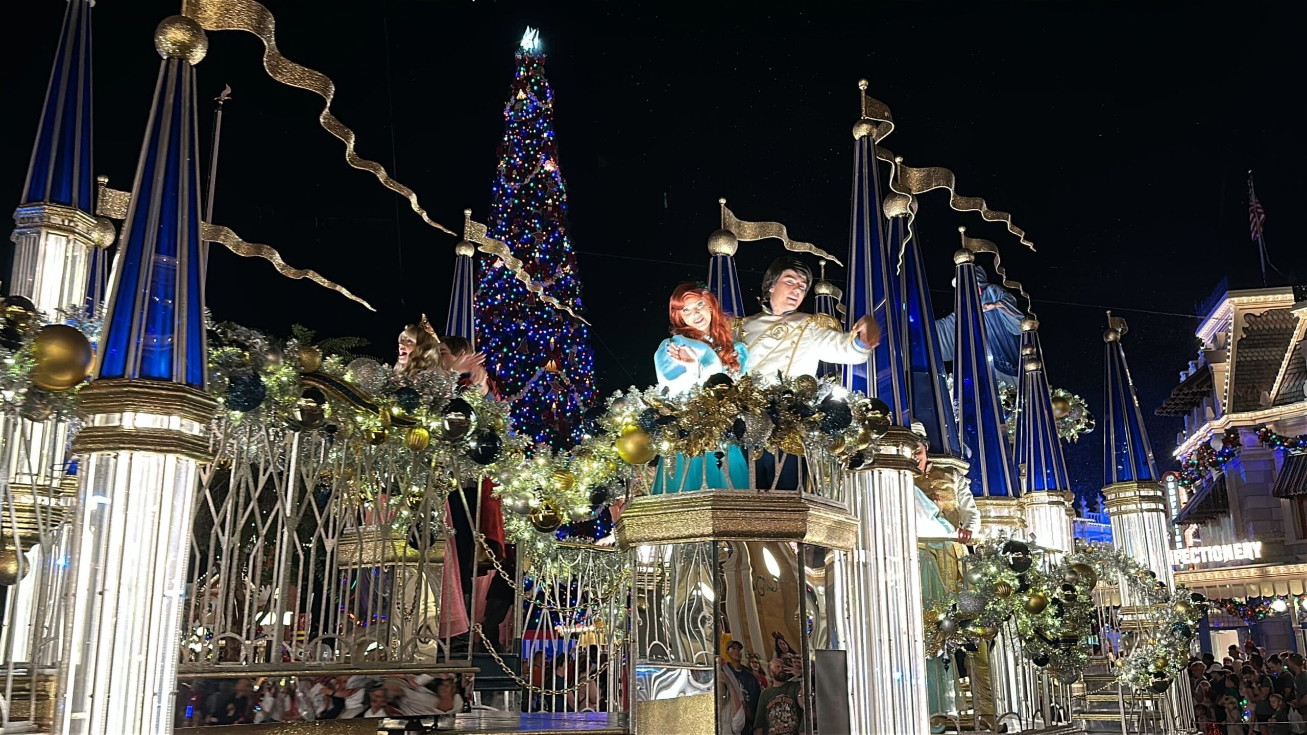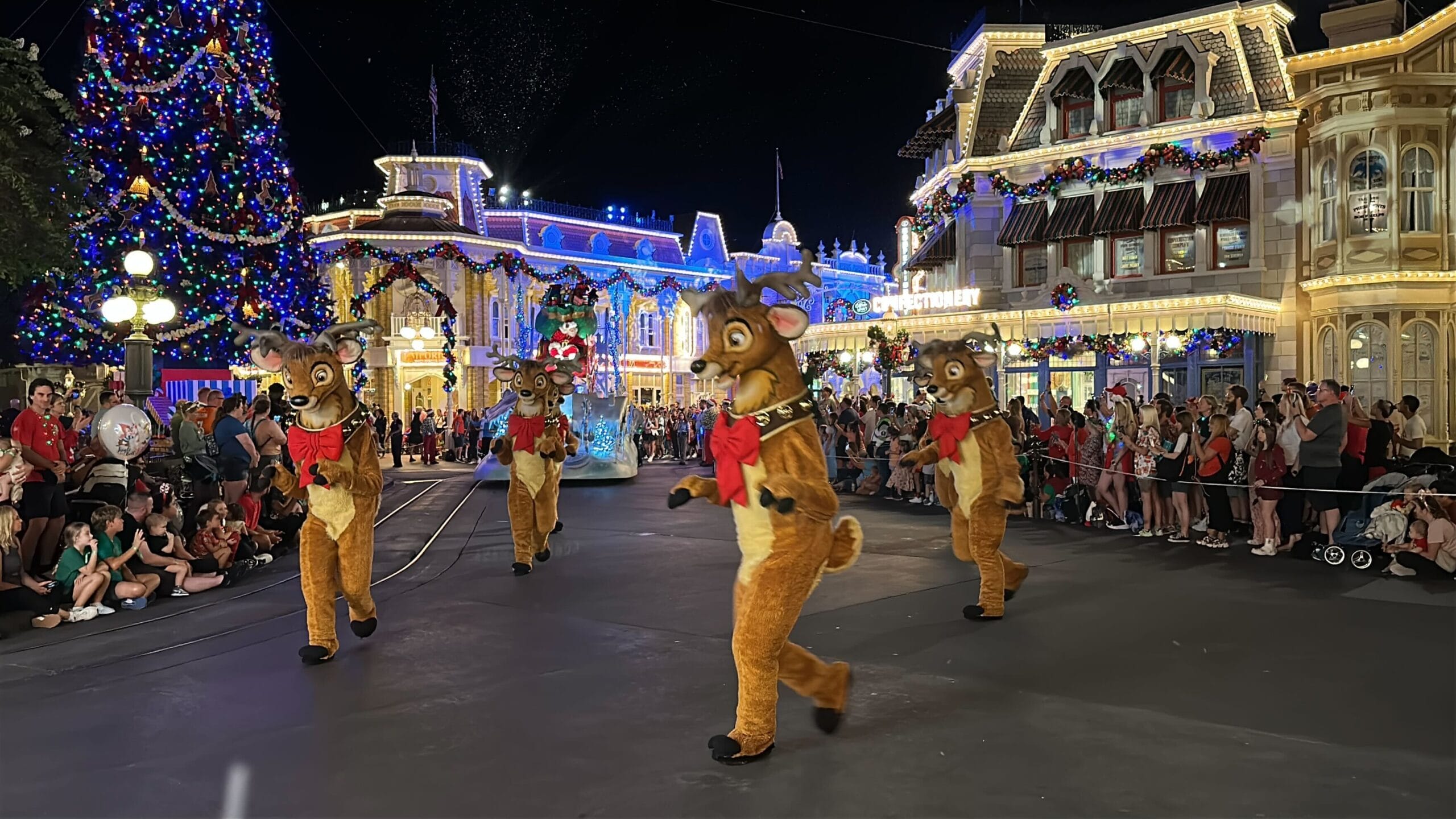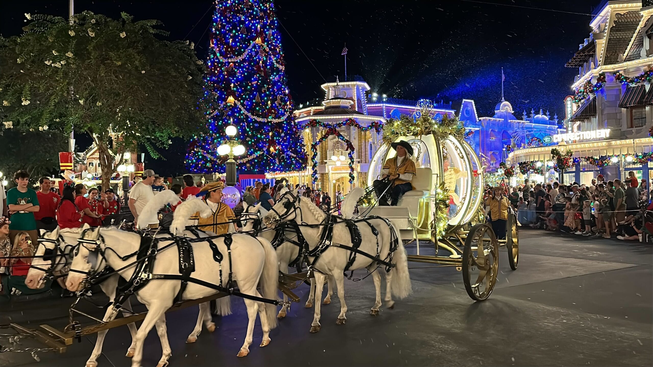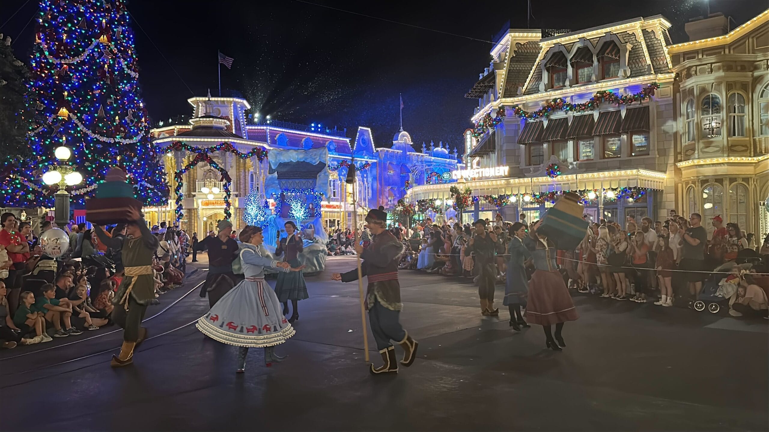 Mickey’s Once Upon a Christmastime Parade starts in Frontierland, next to Tiana’s Bayou Adventure. After passing through Frontierland, it travels through Liberty Square, goes around the hub in front of Cinderella Castle, and then goes down Main Street, U.S.A.