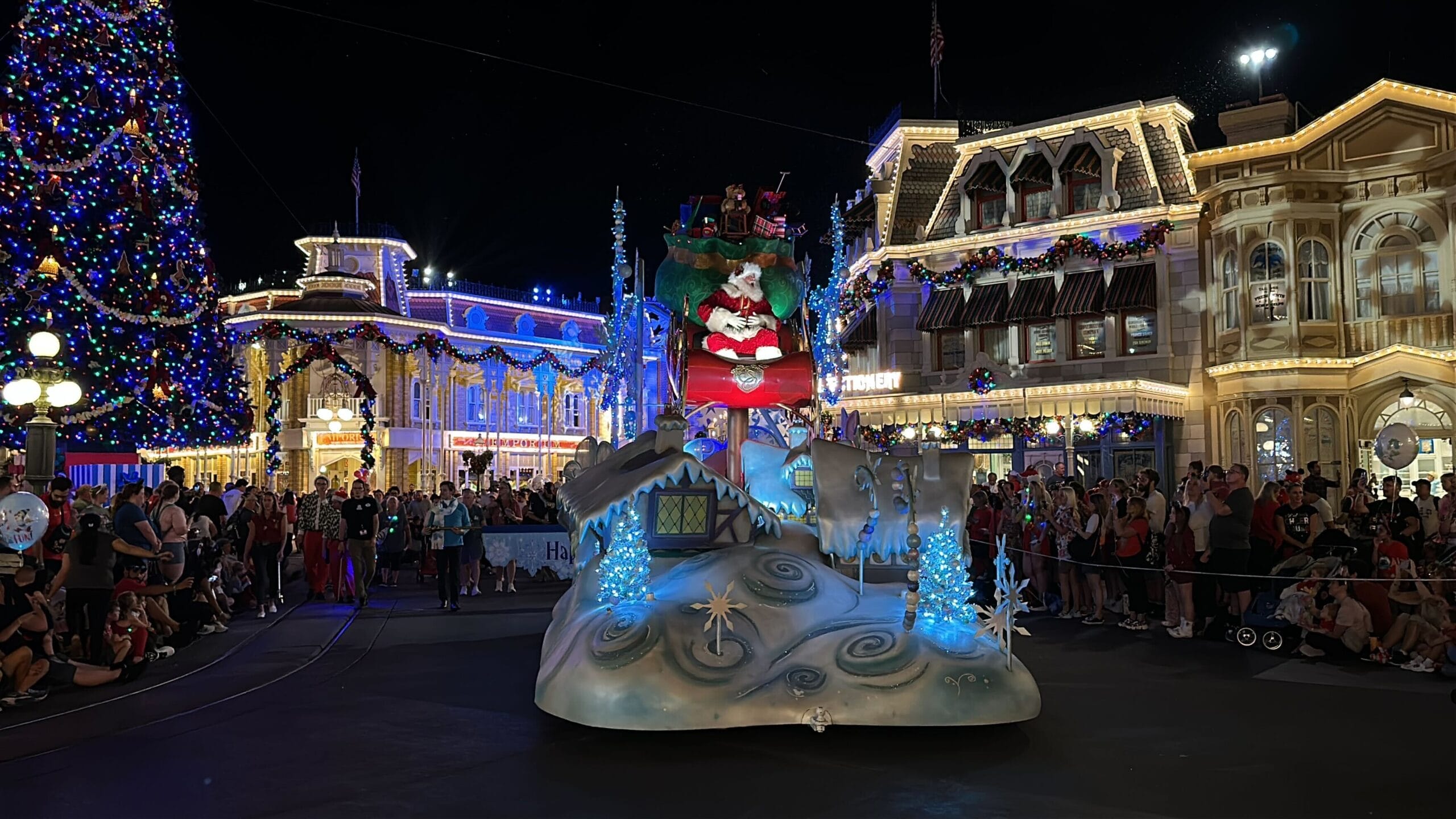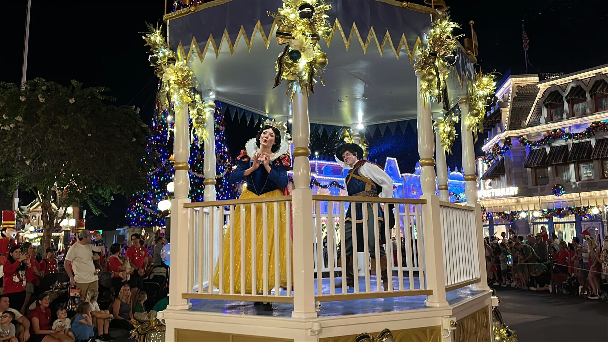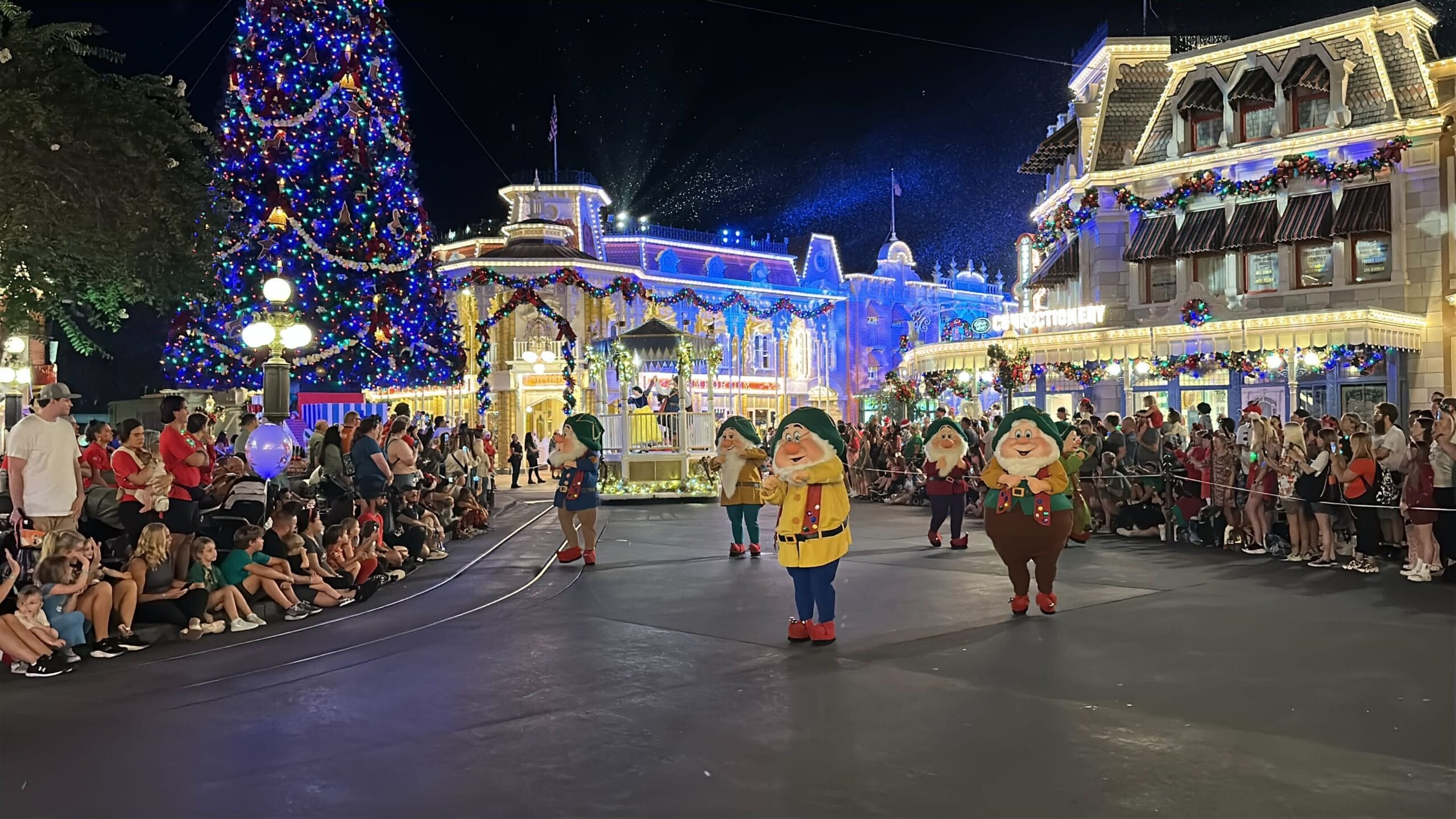 Mickey’s Once Upon a Christmastime Parade starts in Frontierland, next to Tiana’s Bayou Adventure. After passing through Frontierland, it travels through Liberty Square, goes around the hub in front of Cinderella Castle, and then goes down Main Street, U.S.A.