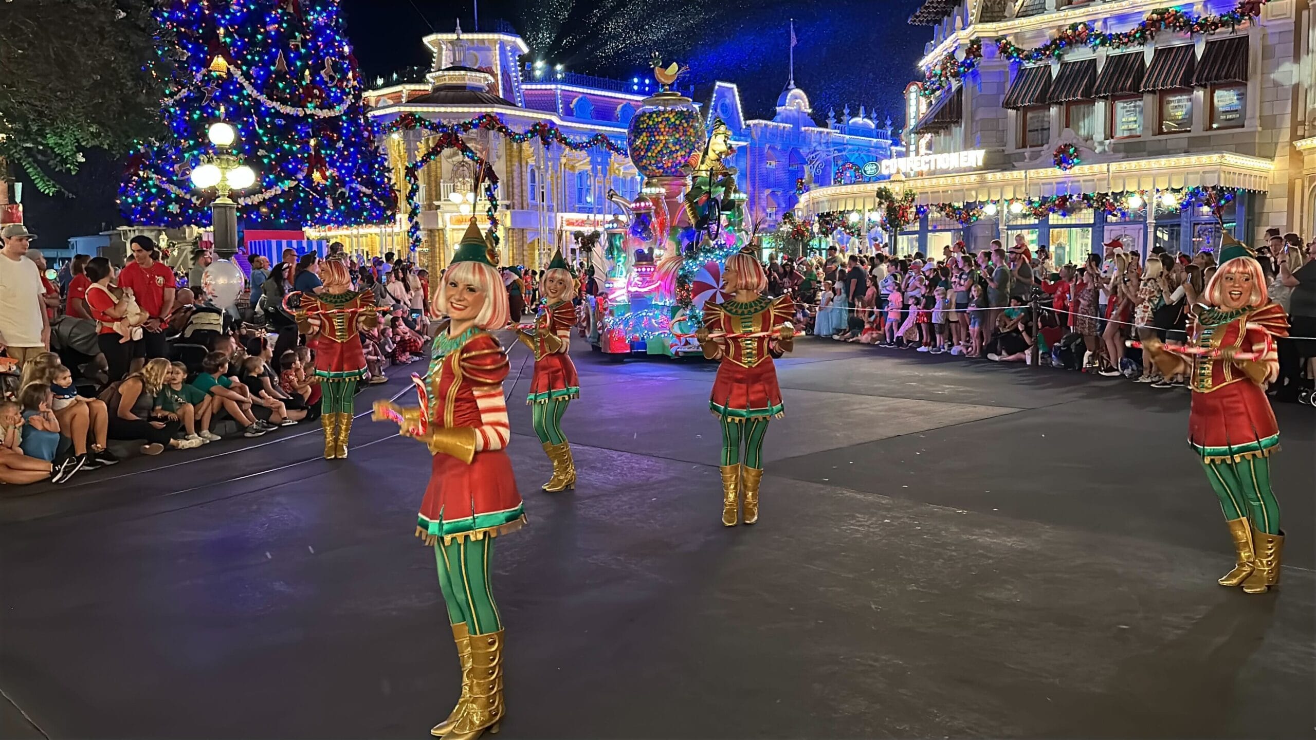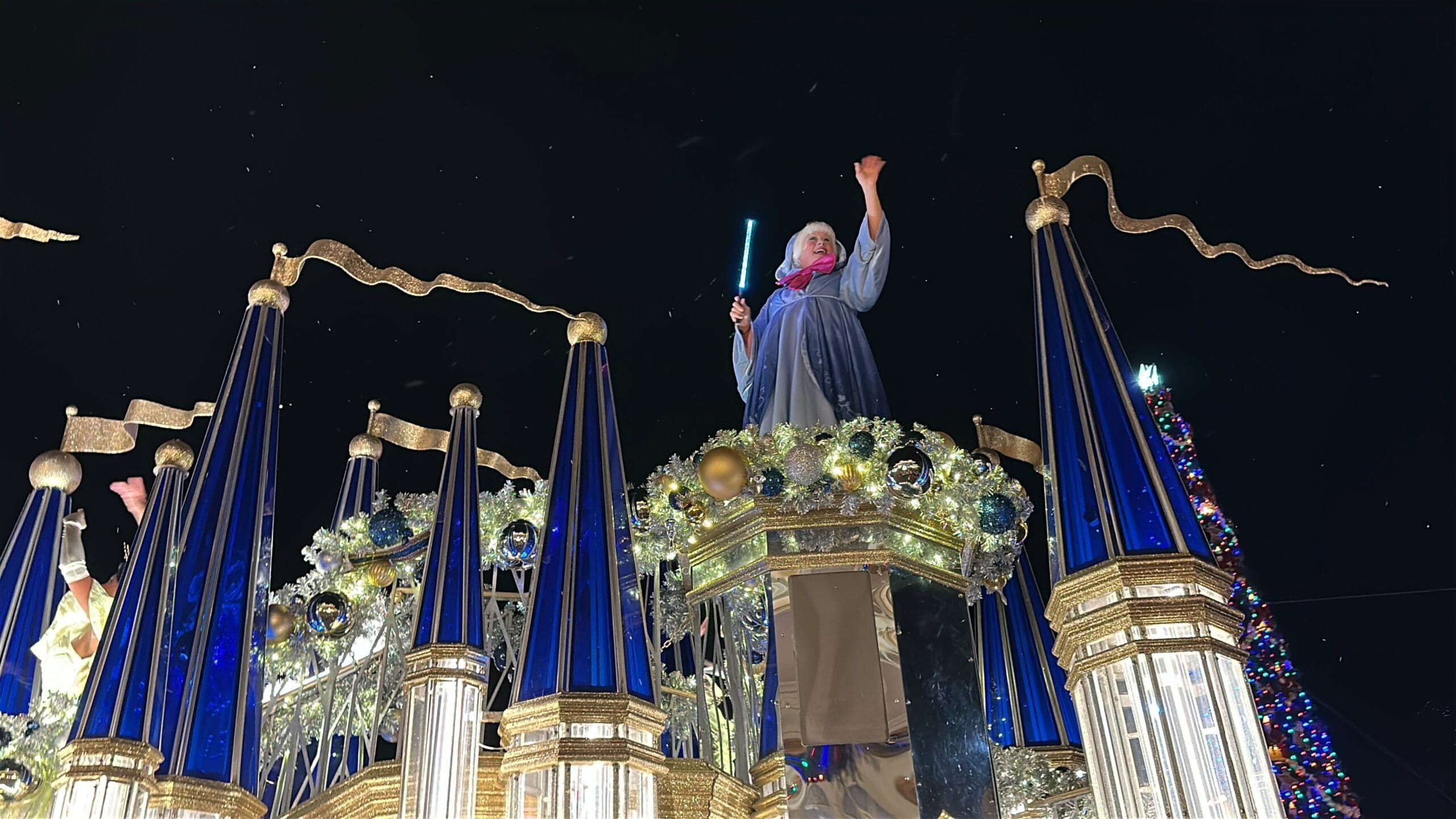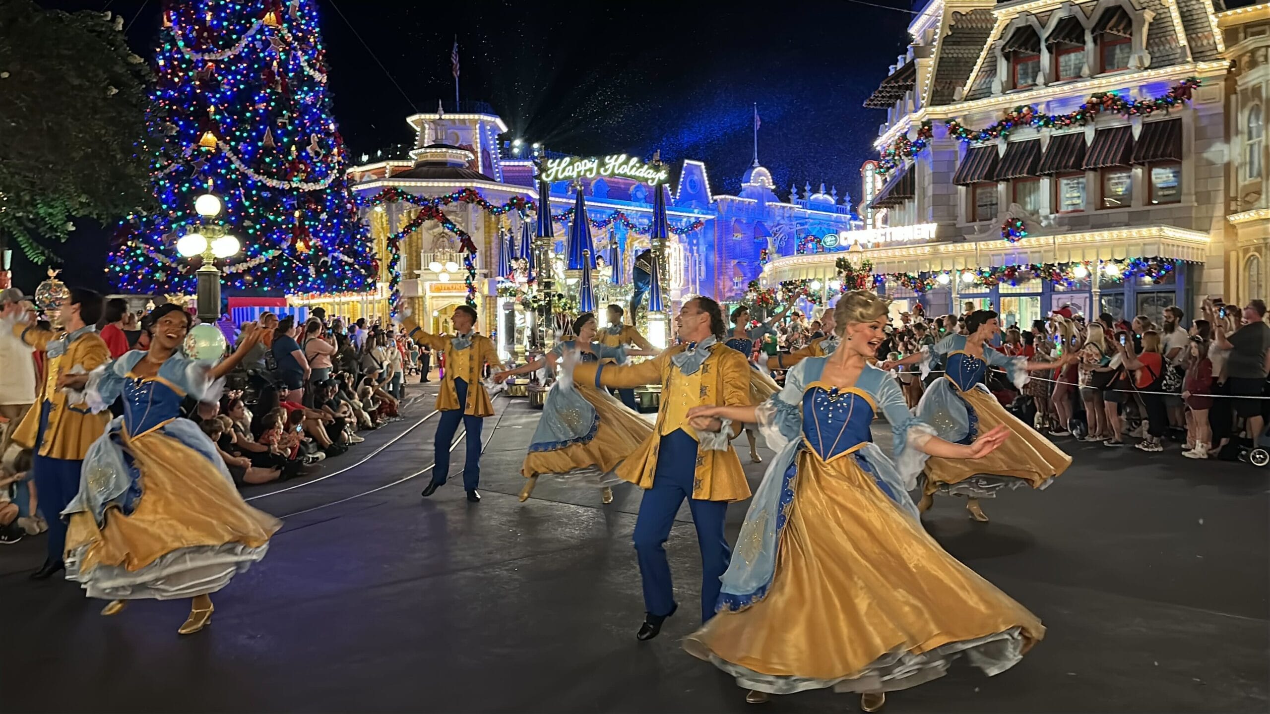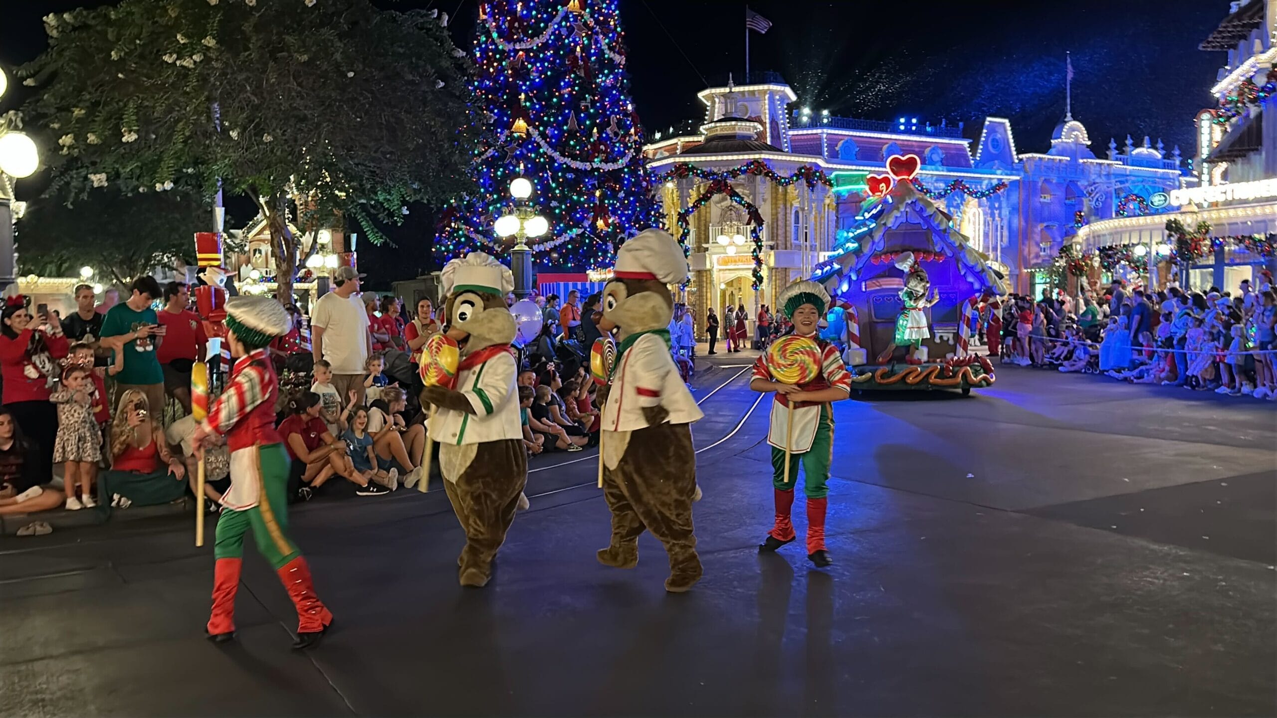 Mickey’s Once Upon a Christmastime Parade starts in Frontierland, next to Tiana’s Bayou Adventure. After passing through Frontierland, it travels through Liberty Square, goes around the hub in front of Cinderella Castle, and then goes down Main Street, U.S.A.