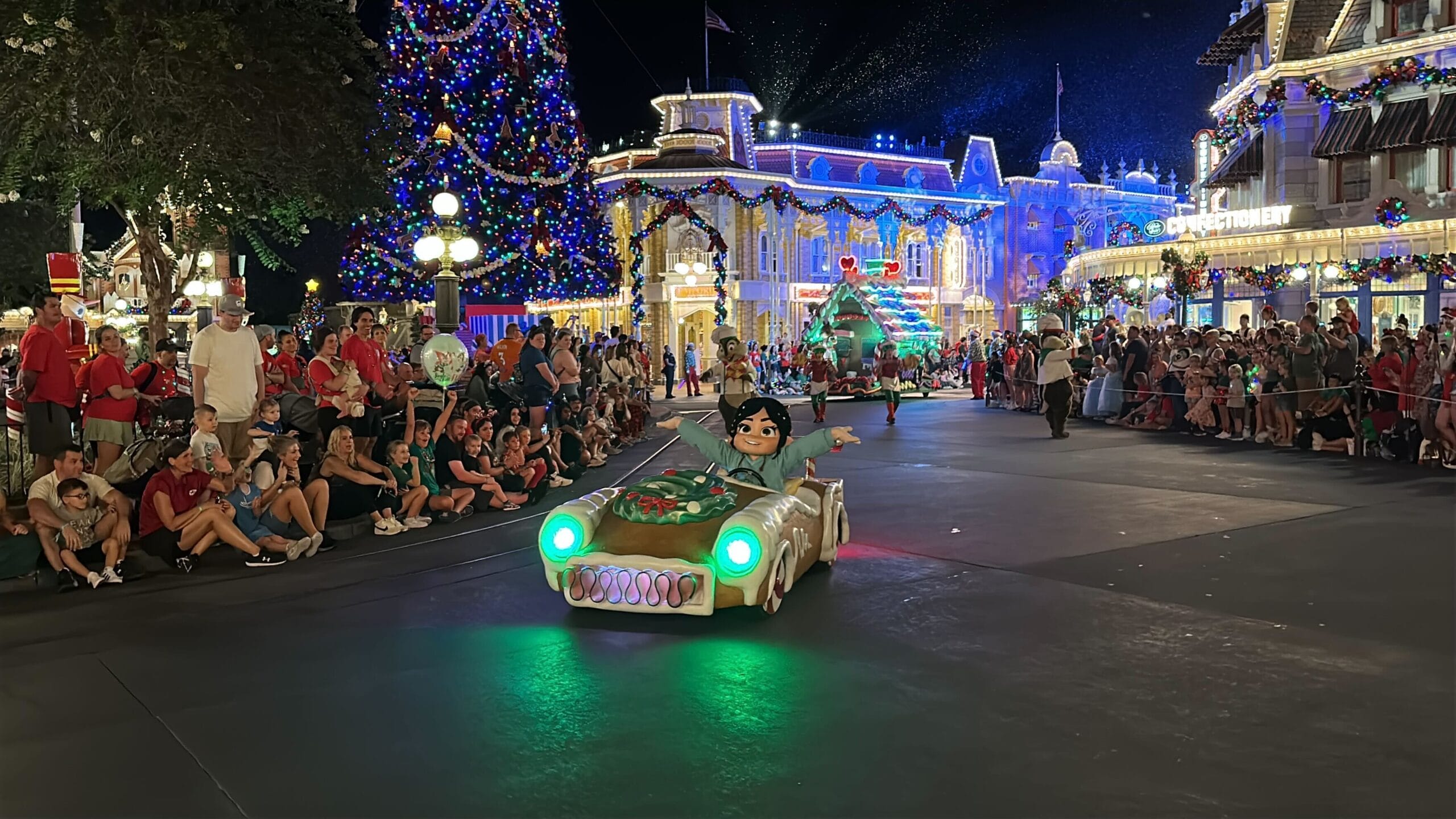 Next up is Vanellope Von Schweetz in a holiday version of her racecar. The hood of her racecar is adorned with a wreath.